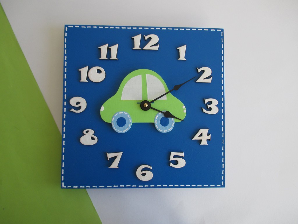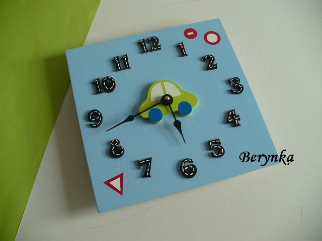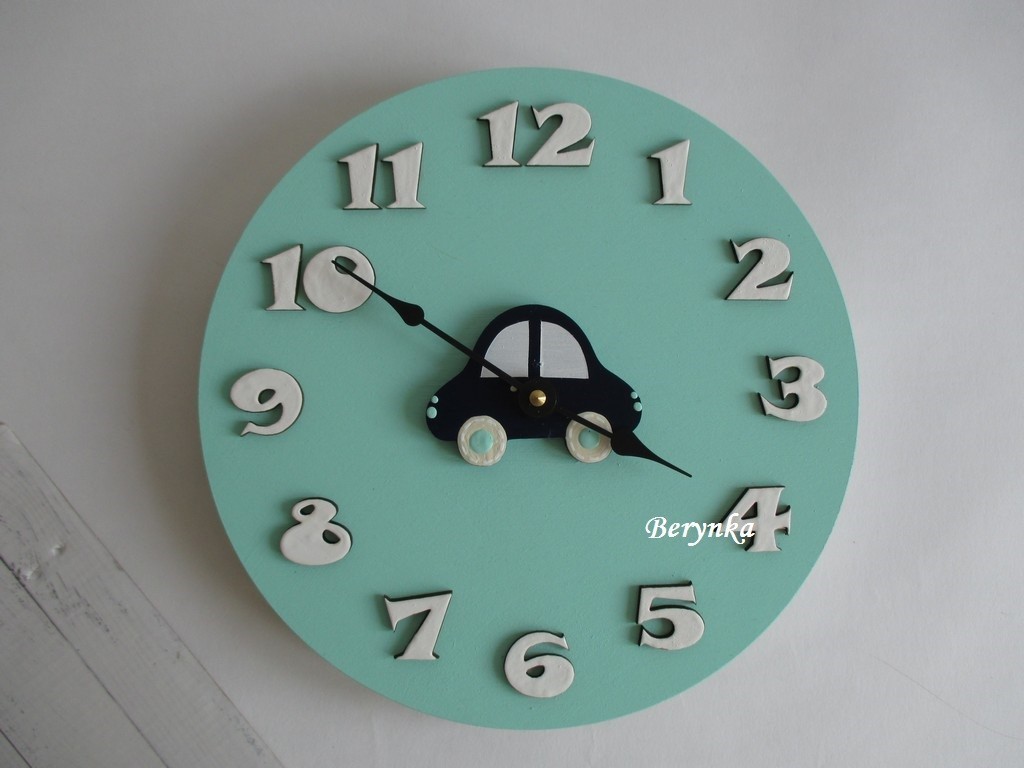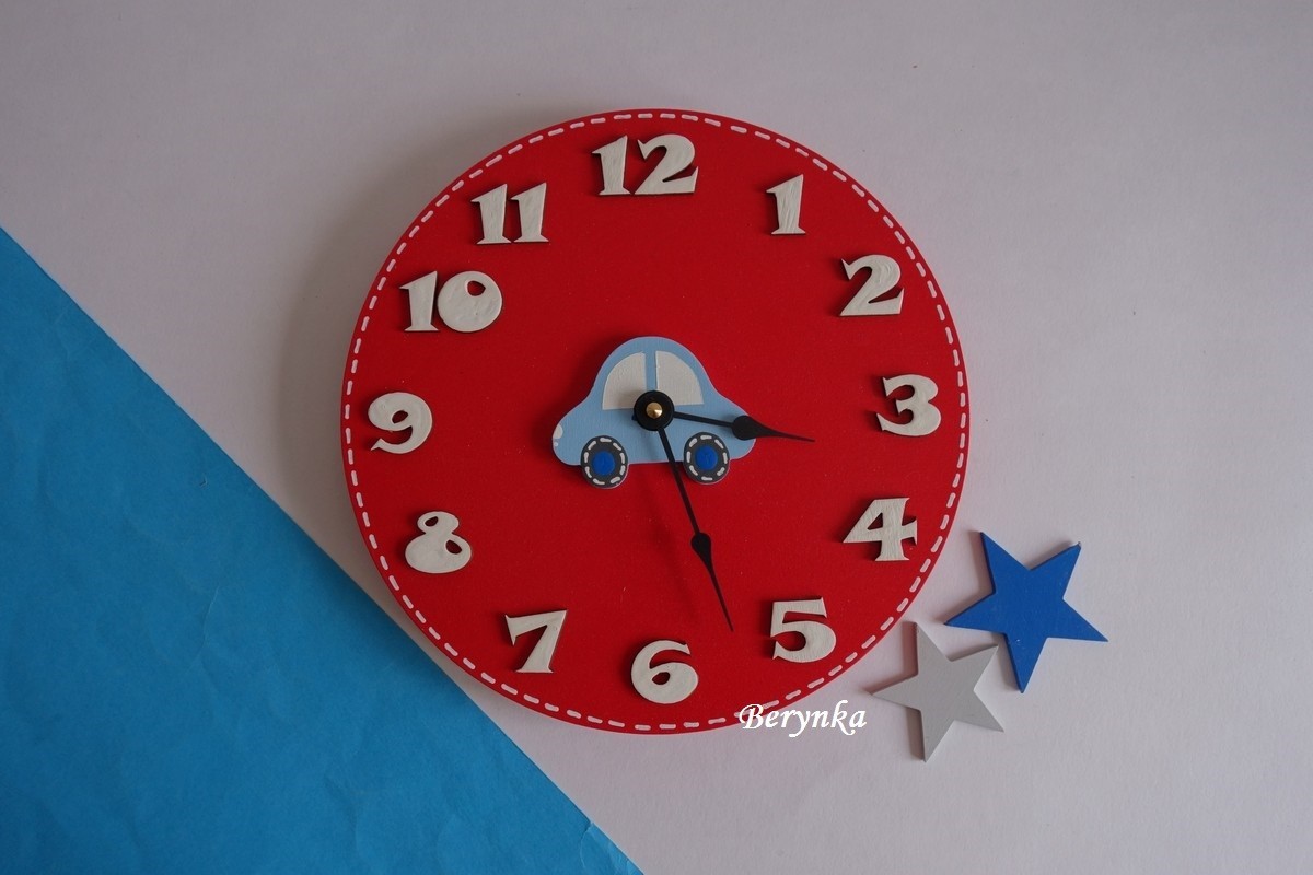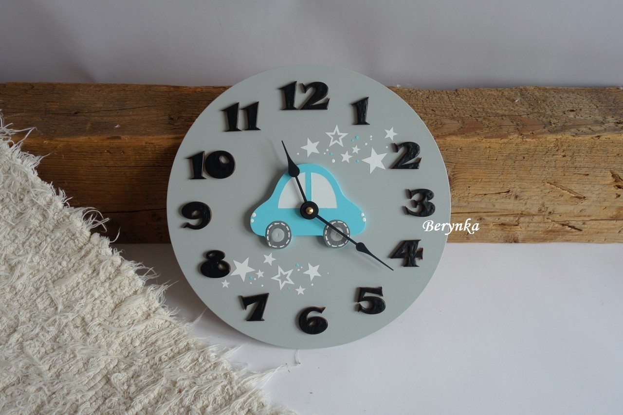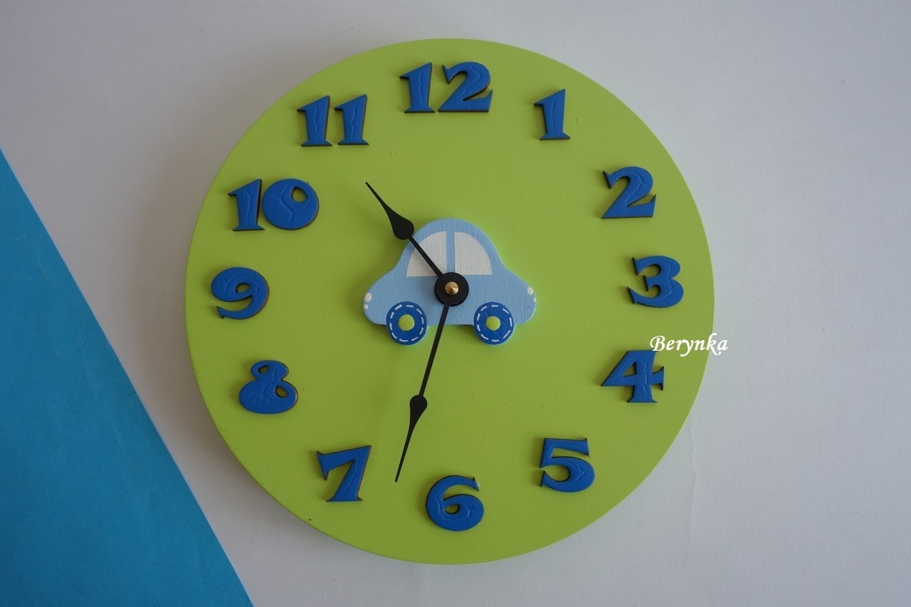 Dřevěné hodiny s vyřezaným autíčkem a číslicemi