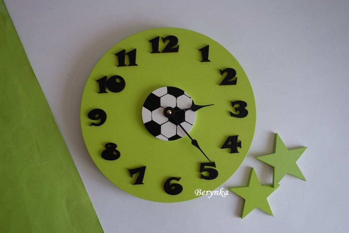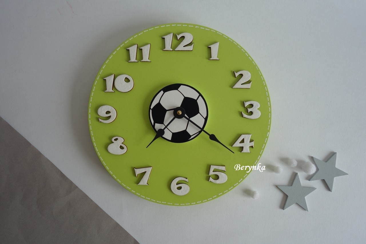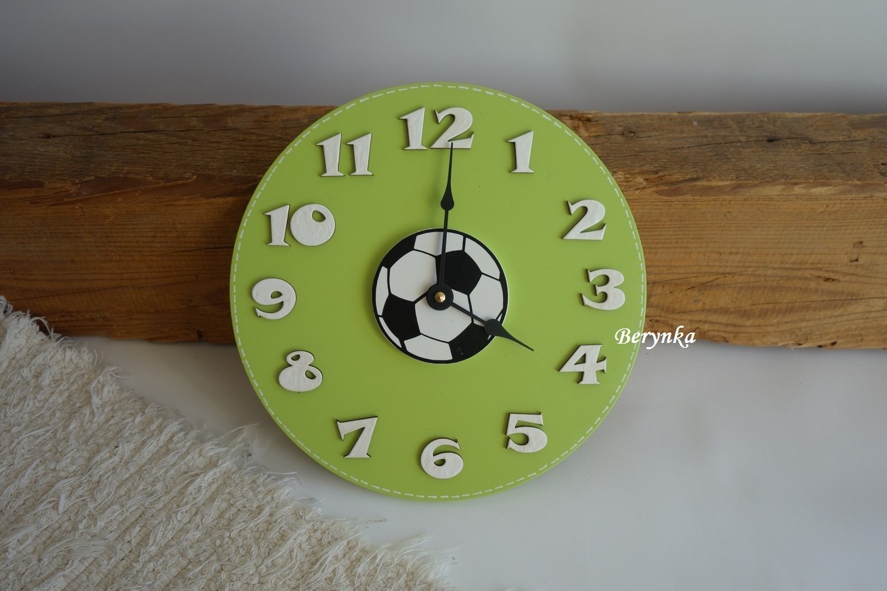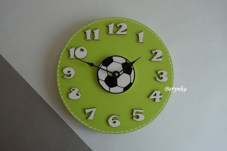 Dřevěné hodiny s vyřezaným fotbalovým míčem a vyřezanými číslicemi