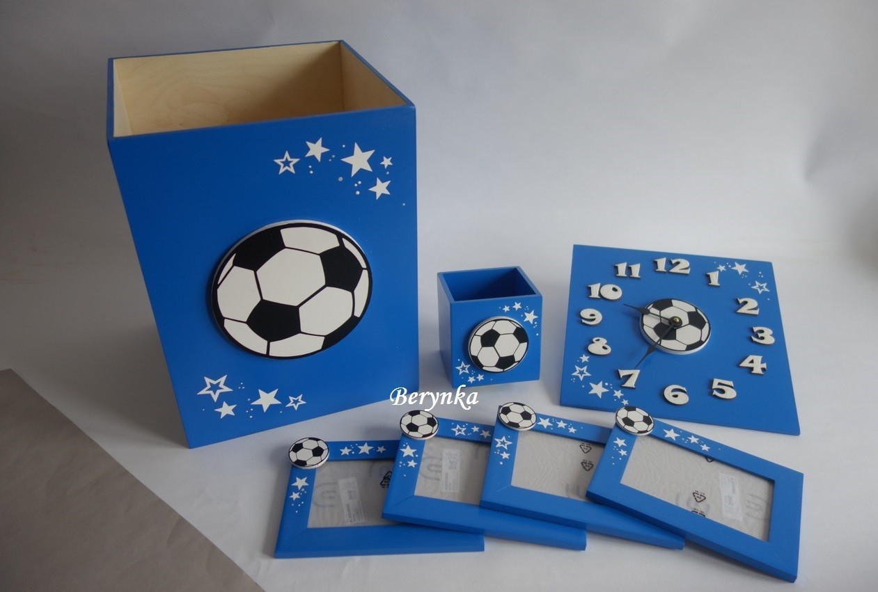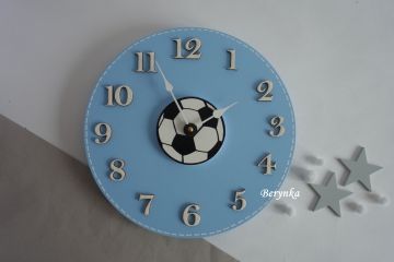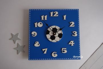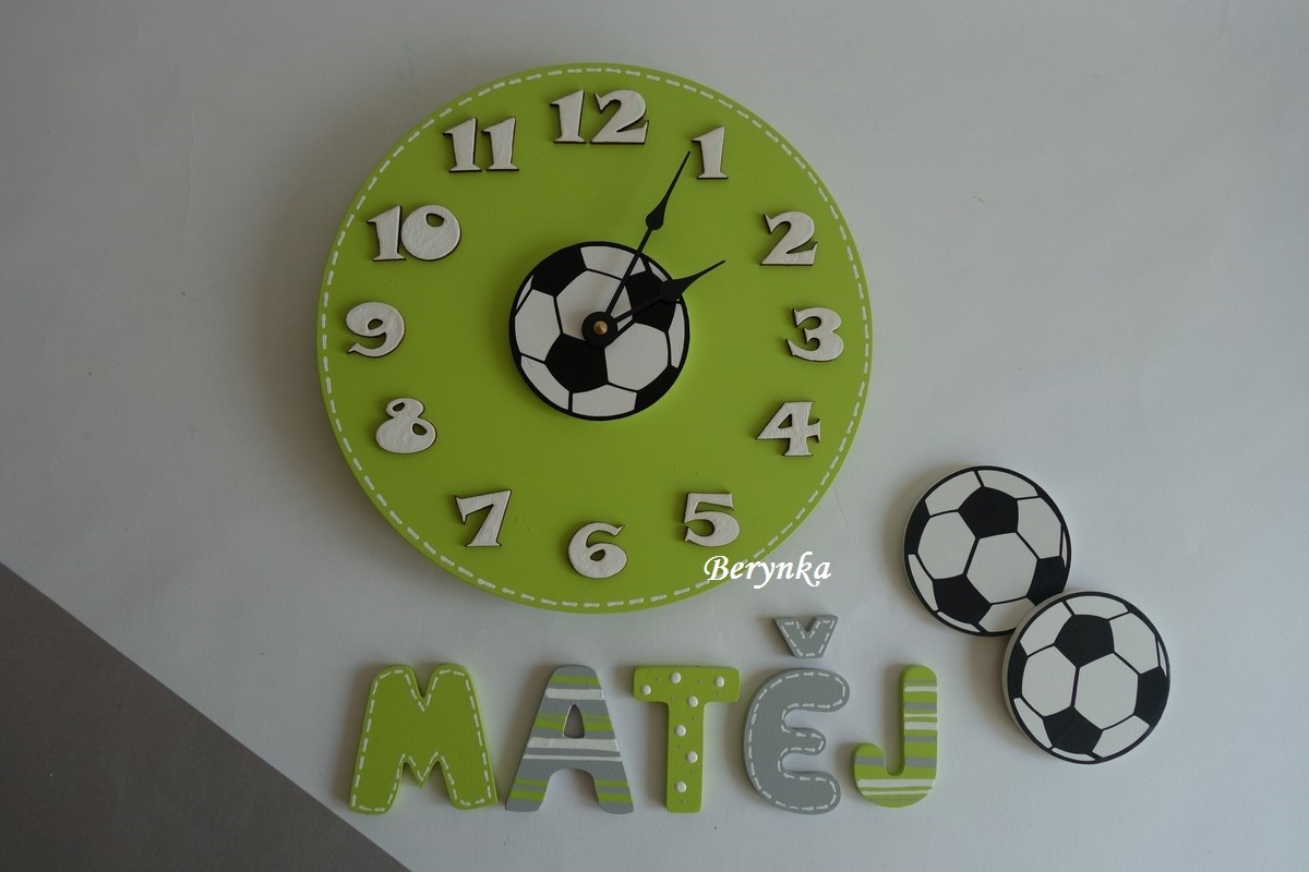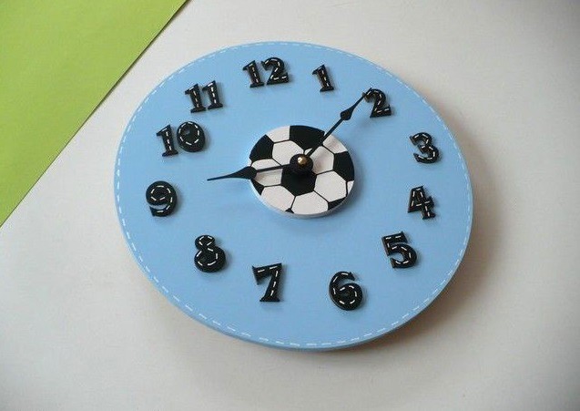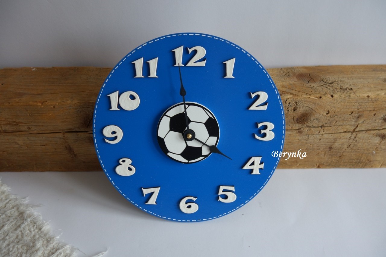 Dřevěné hodiny s vyřezaným fotbalovým míčem a vyřezanými číslicemi