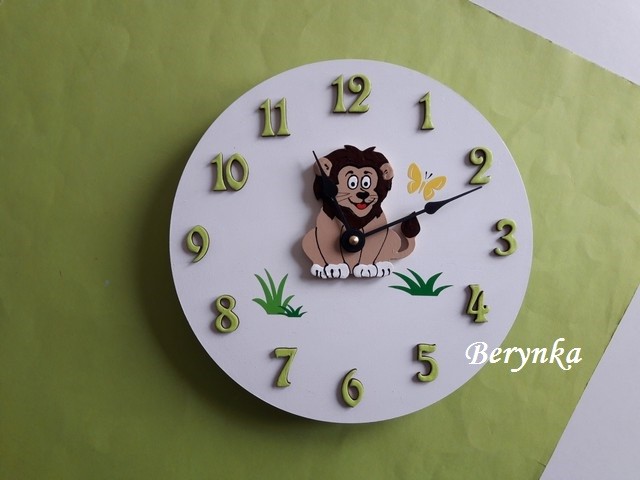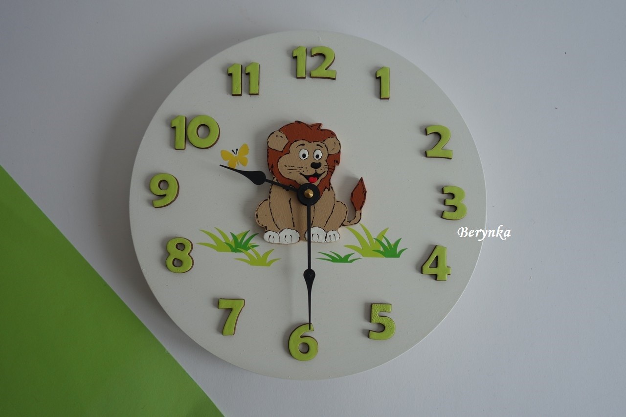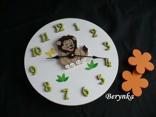 Dřevěné hodiny s vyřezaným lvíčkem a číslicemi