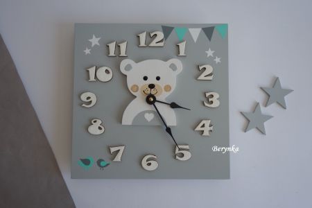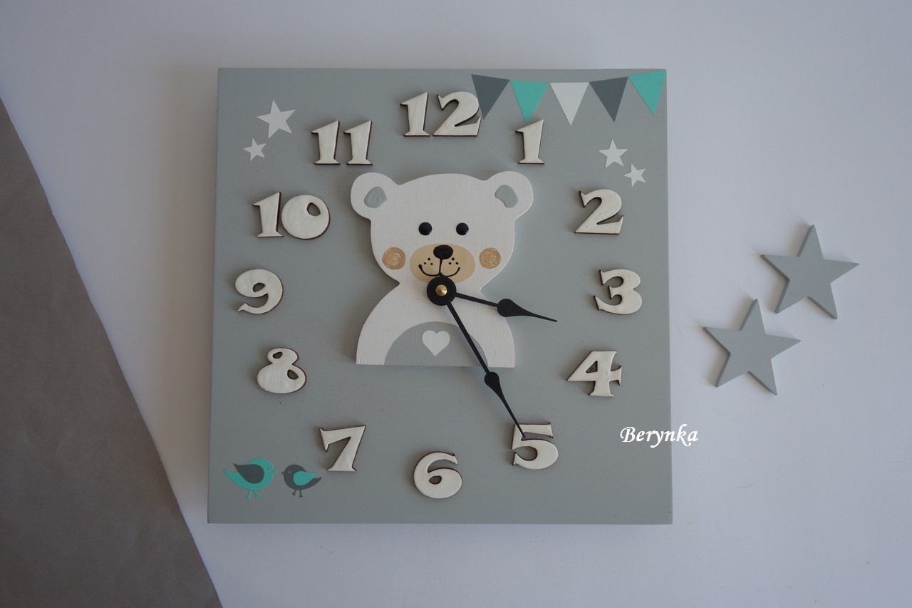 - medvídek a číslice jsou vyřezané zvlášť a na hodinách nalepené