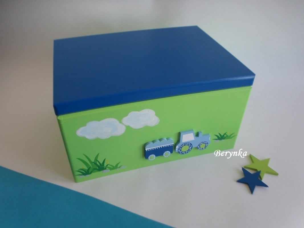 - mašinka s vagónkem je vyřezaná z překližky, ručně namalovaná a na bedýnce přilepená