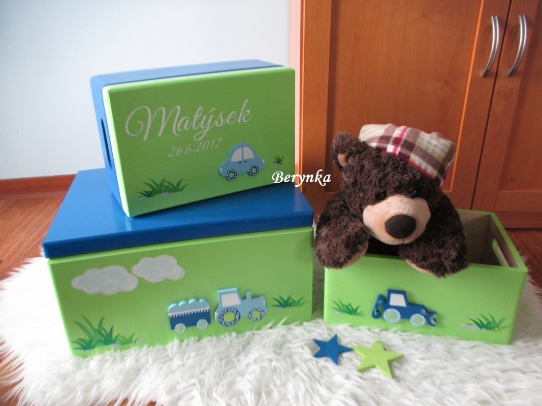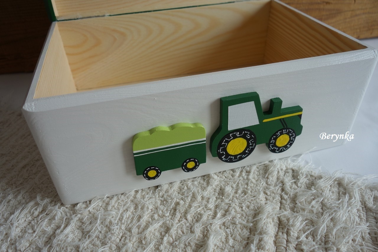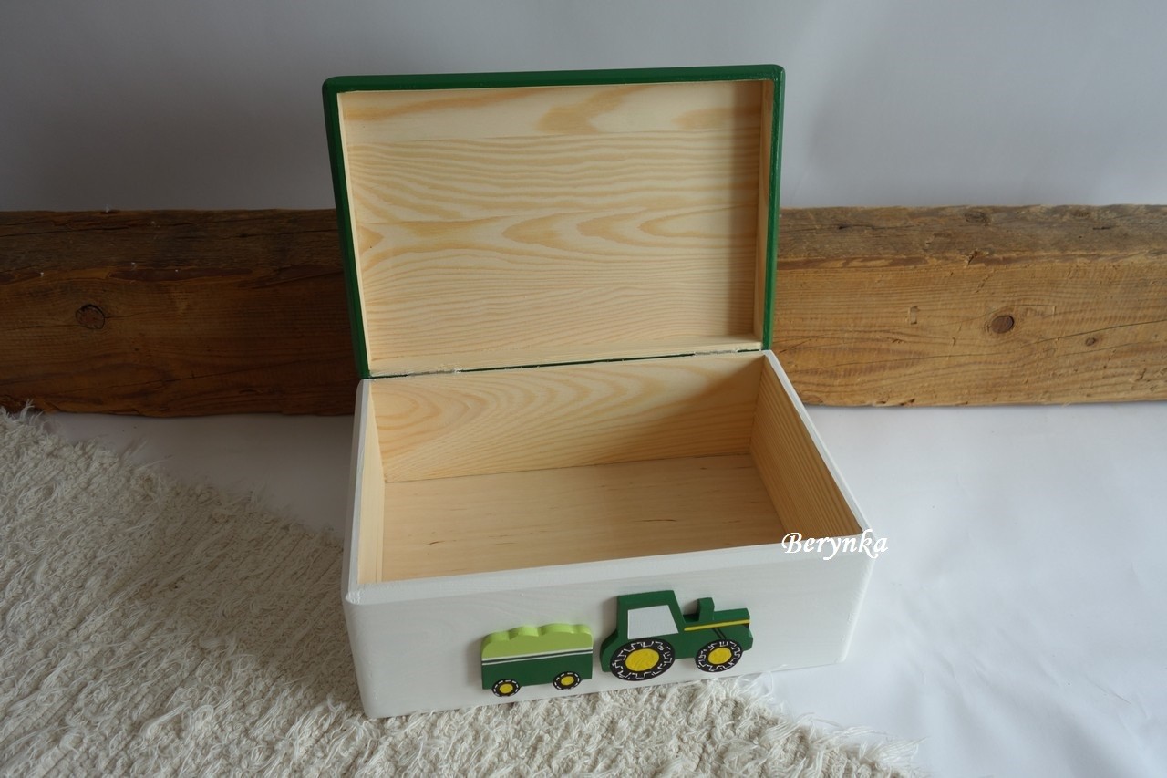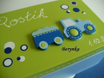 - mtraktor s valníkem je vyřezaný z překližky, ručně namalovaný a na bedýnce přilepený