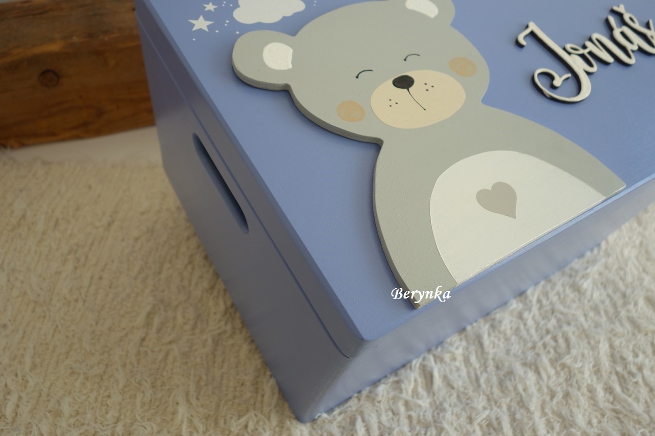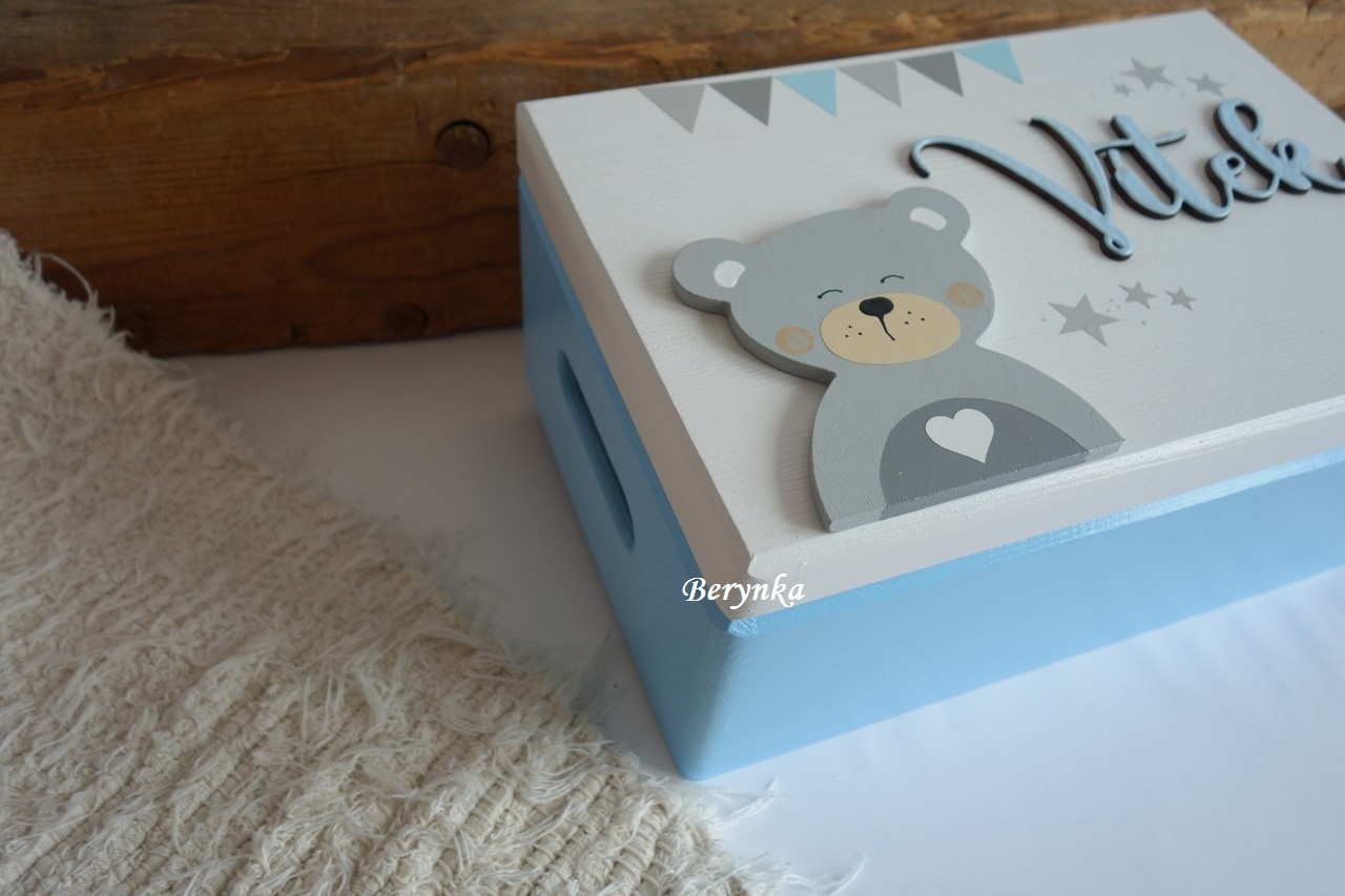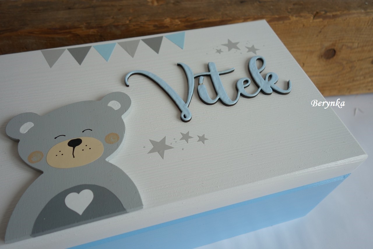 - jméno a medvídek jsou vyřezané z překližky, ručně namalované a na bedýnce přilepené