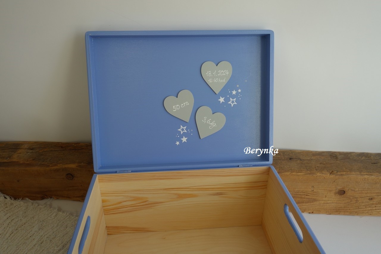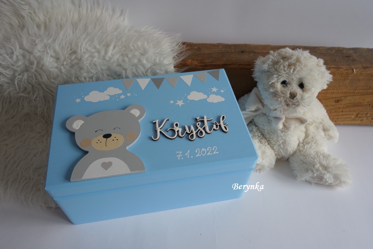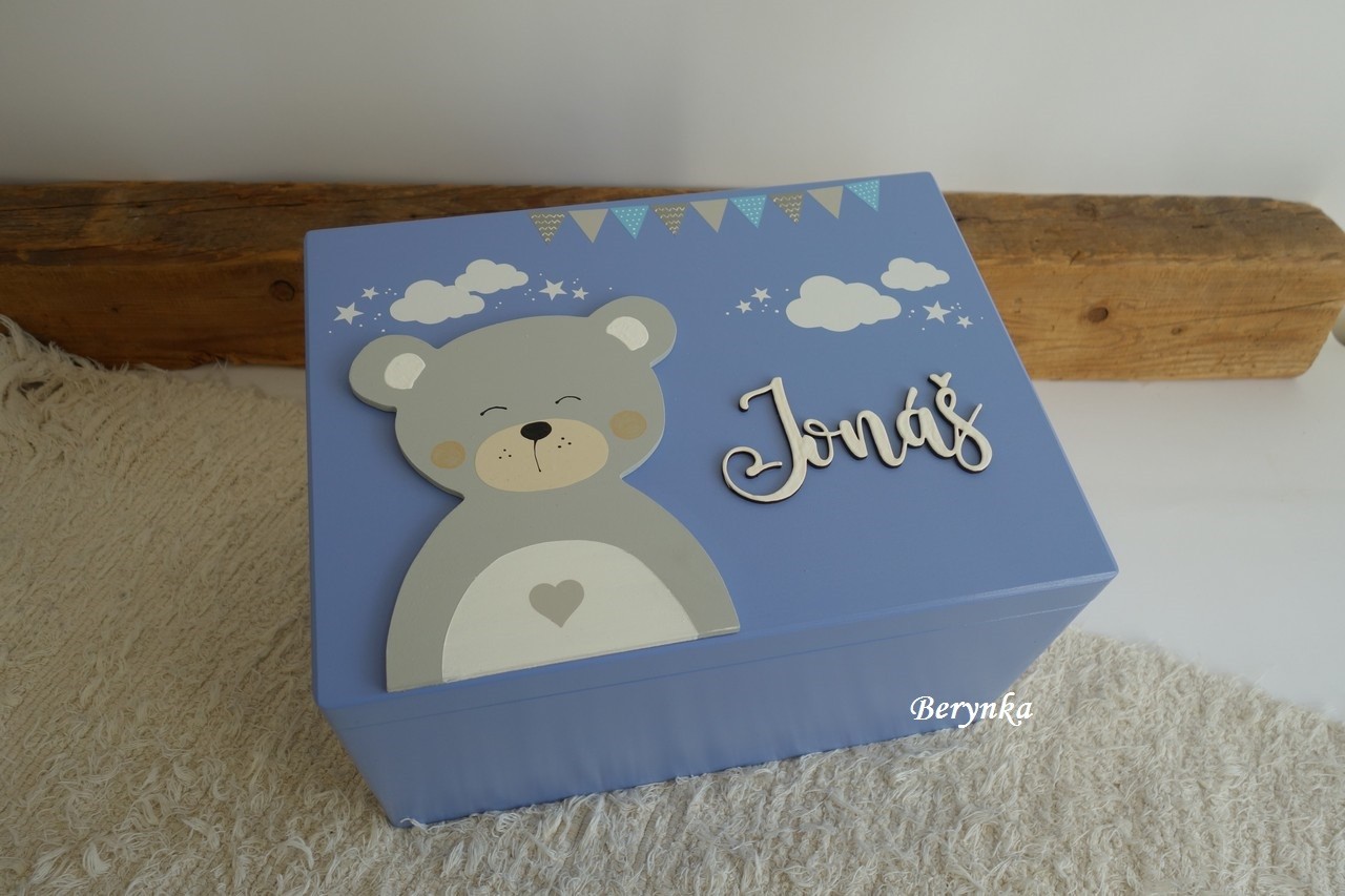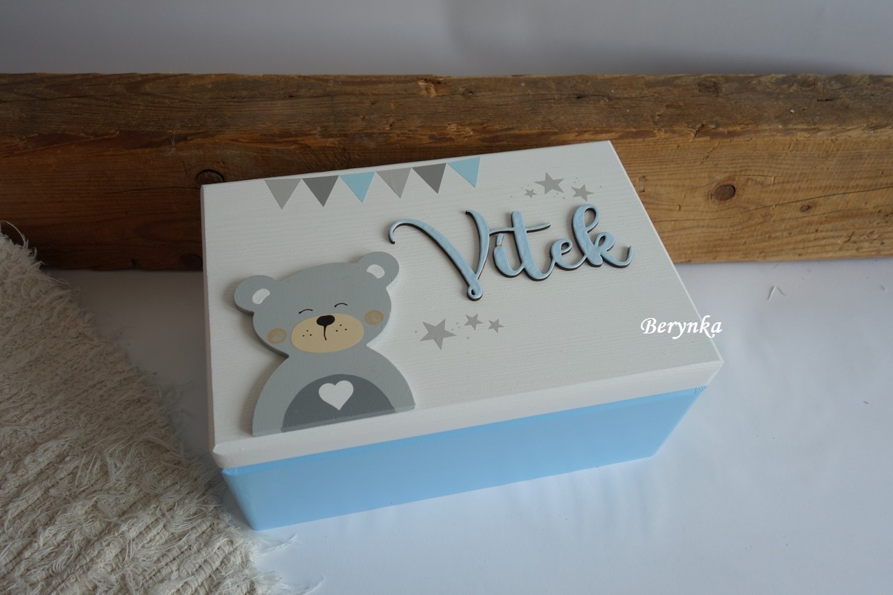 - jméno a medvídek jsou vyřezané z překližky, ručně namalované a na bedýnce přilepené