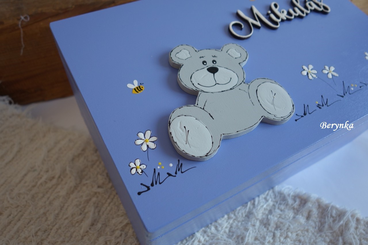 - jméno a medvídek jsou vyřezané z překližky, ručně namalované a na bedýnce přilepené