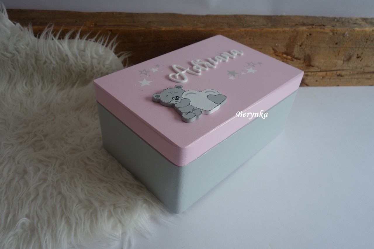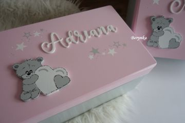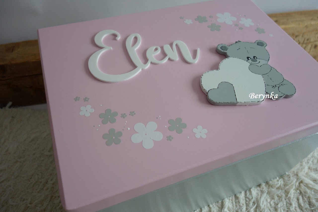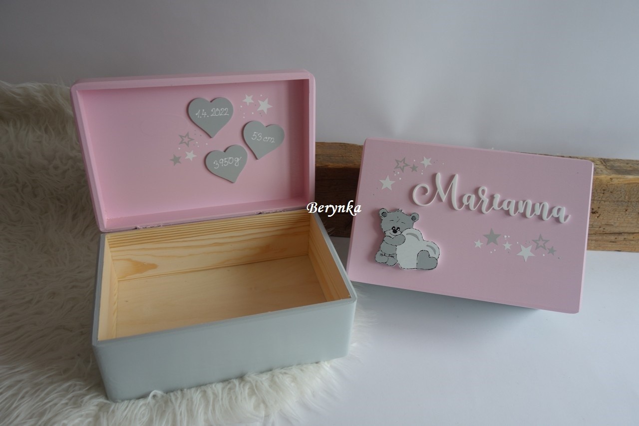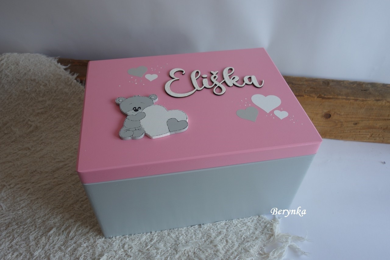Dřevěná bedýnka s vyřezaným jménem a medvídkem se srdíčkem
