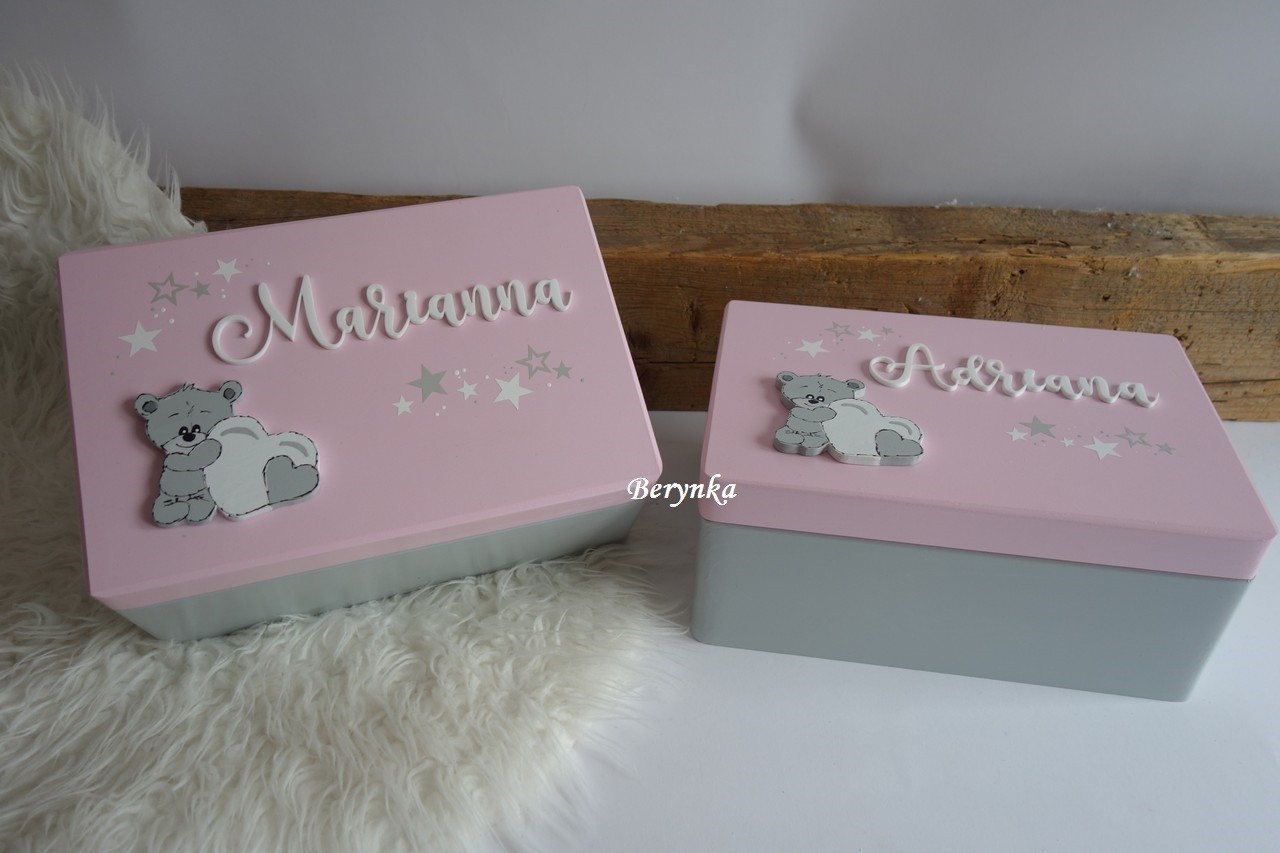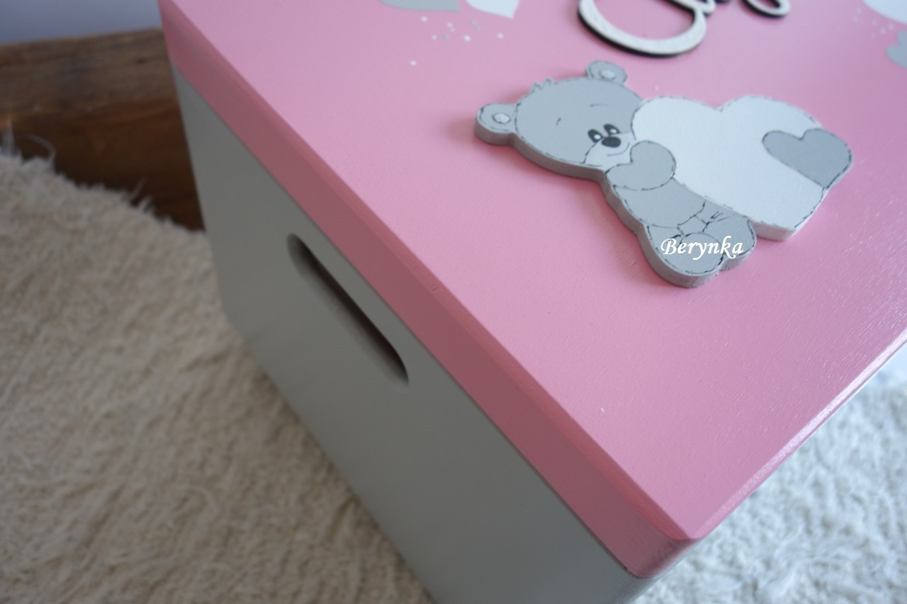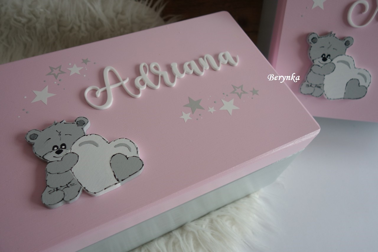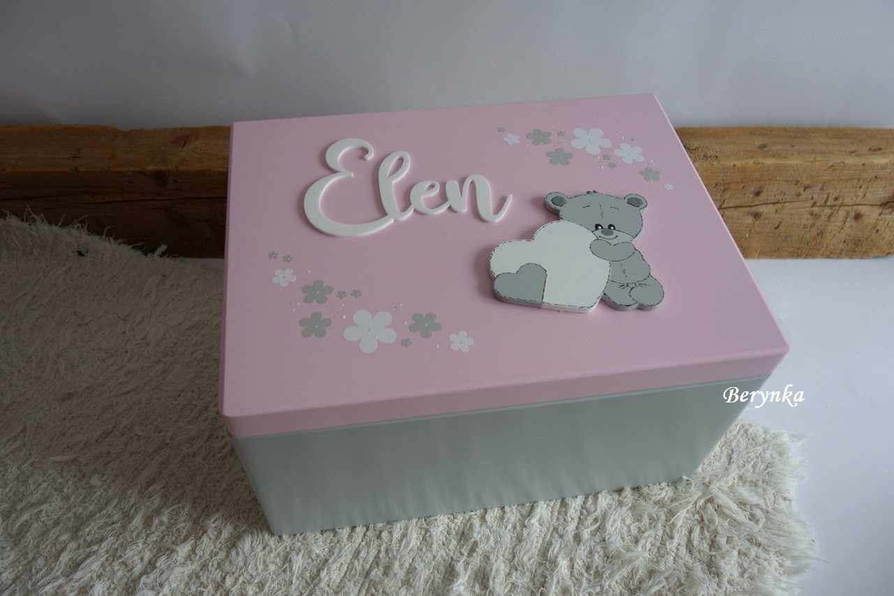 Dřevěná bedýnka s vyřezaným jménem a medvídkem se srdíčkem