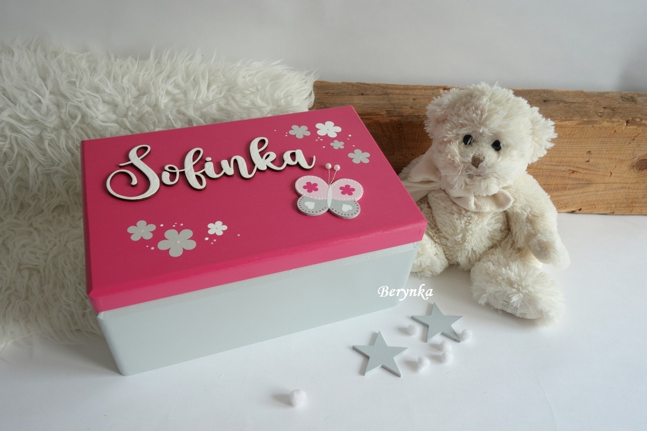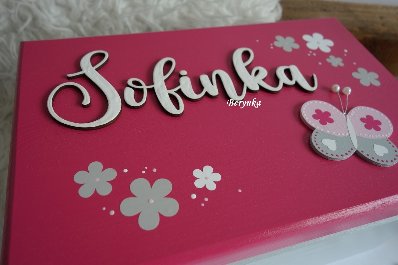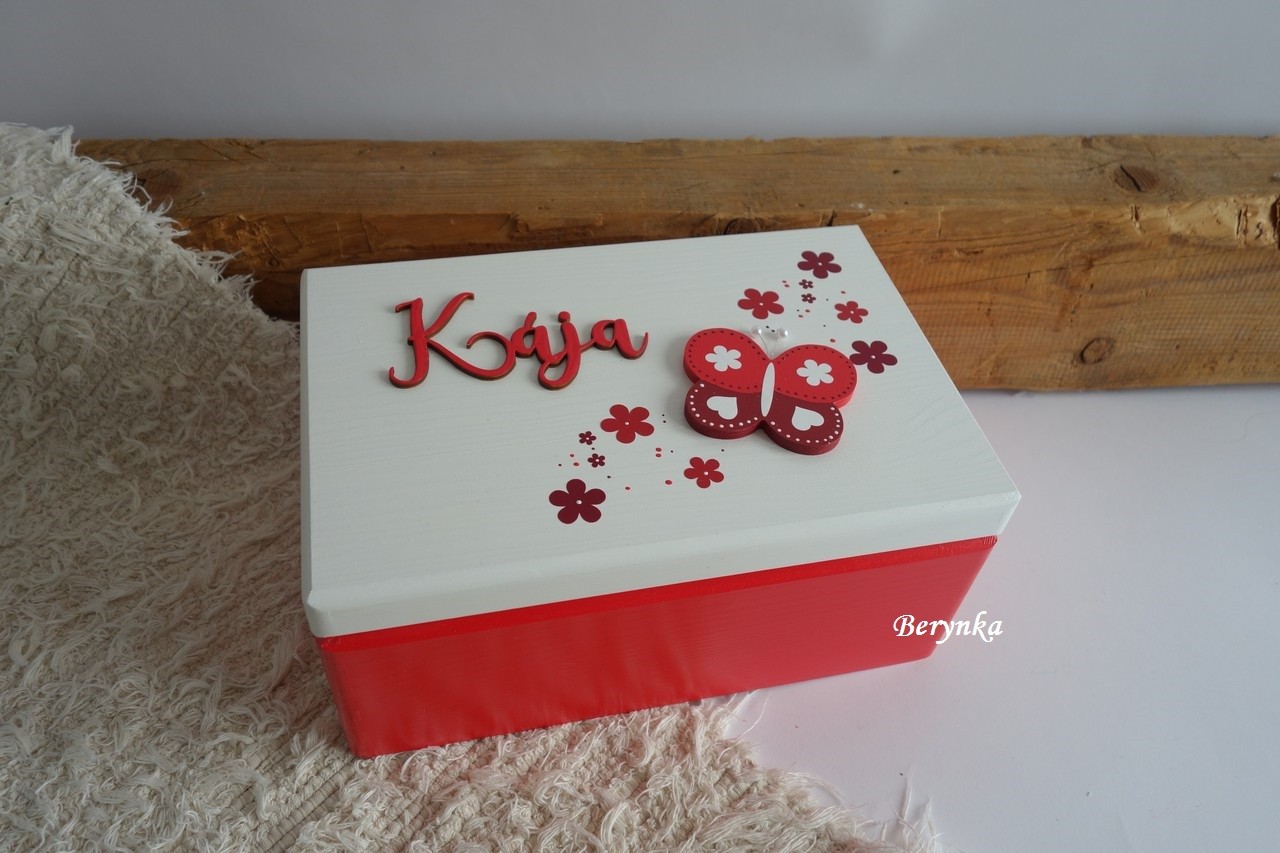 Dřevěná bedýnka s vyřezaným jménem a motýlkem