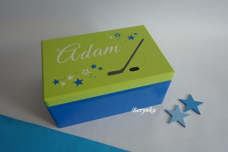 Dřevěná bedýnká se jménem a florbalovou hokejkou