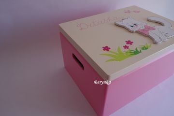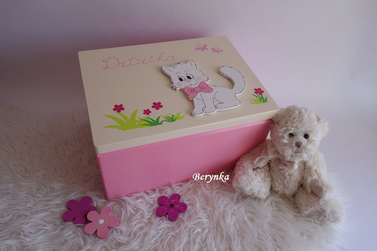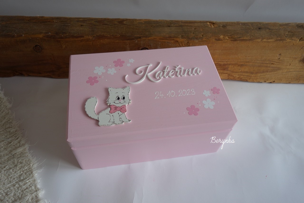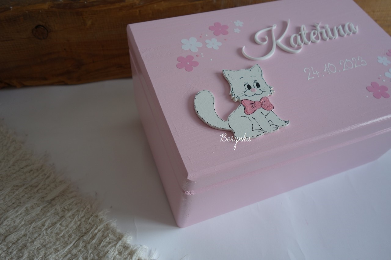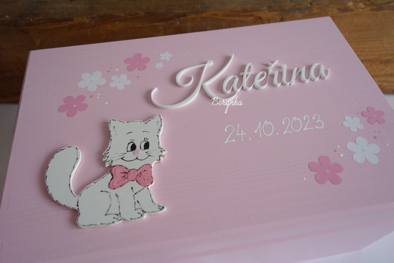 - kočička je vyřezaná z překližky, ručně namalovaná a na bedýnce přilepená