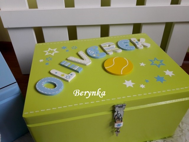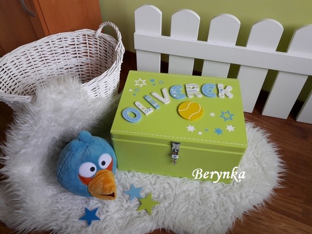 - písmenka a míček jsou vyřezané z překližky, ručně namalované a na bedýnce přilepené