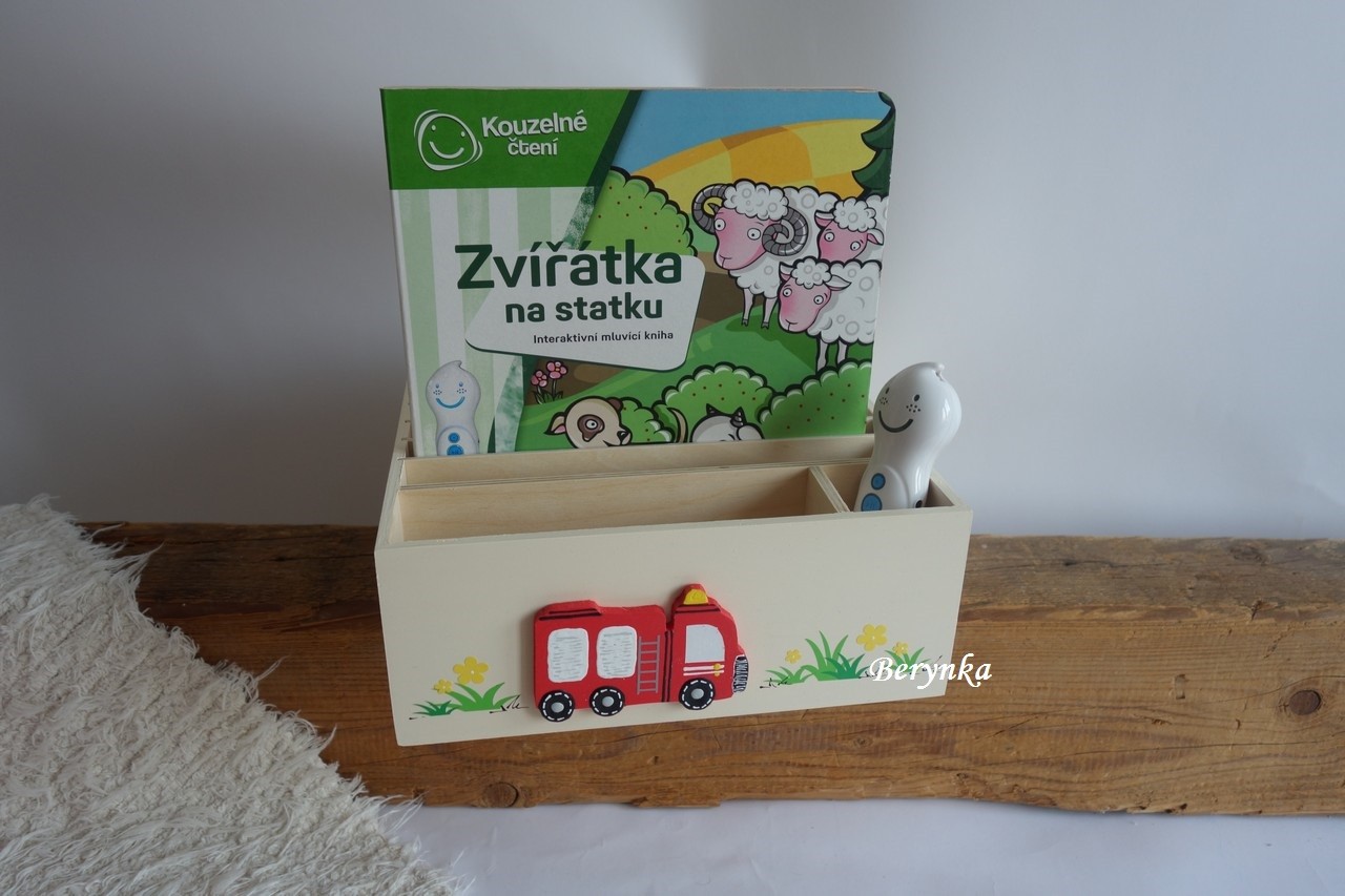 - má 10 samostatných přihrádek na velké knížky a jednu přihrádku na několik menších knížek + přihrádku na tužku