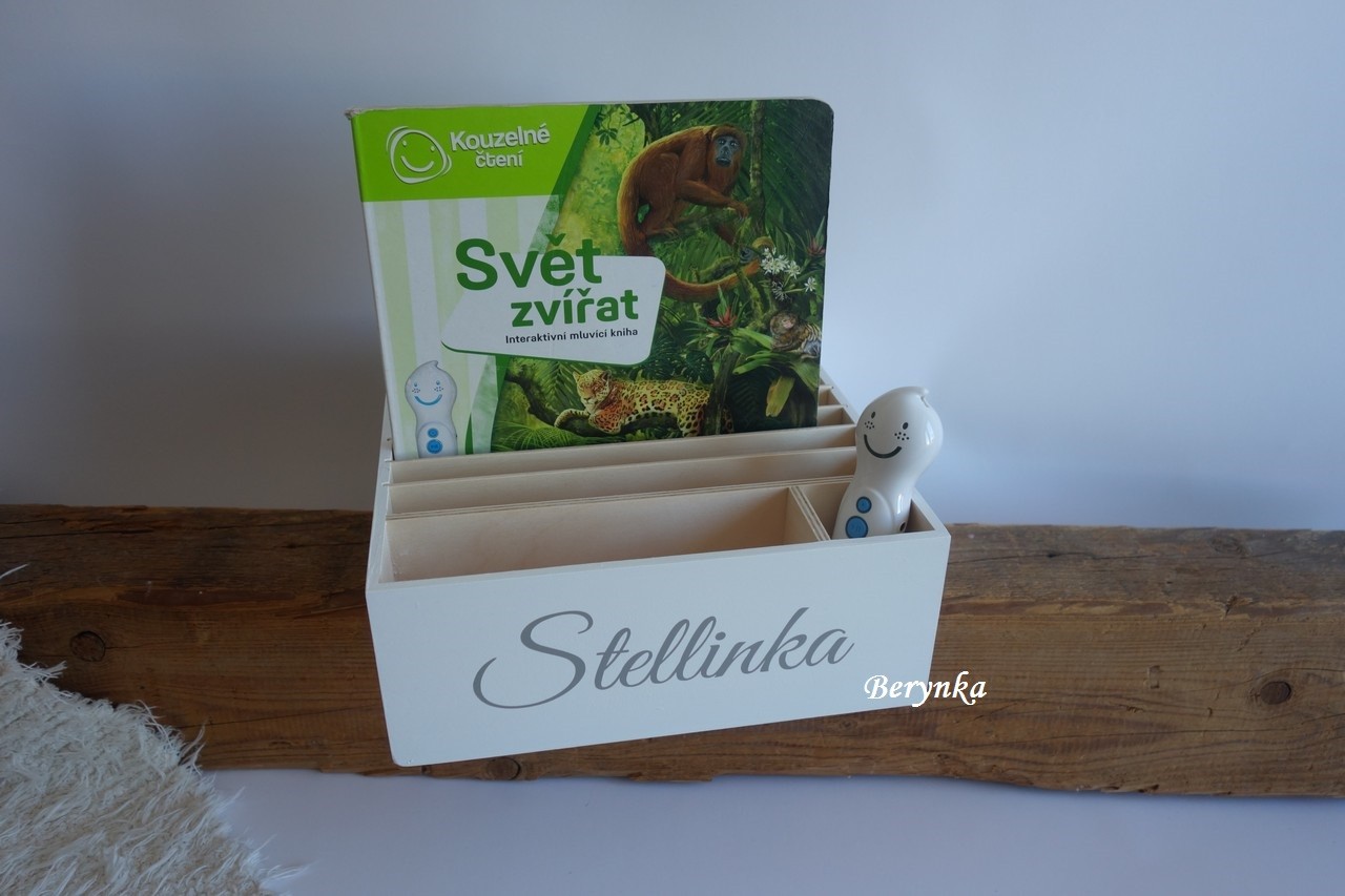 - má 10 samostatných přihrádek na velké knížky a jednu přihrádku na několik menších knížek + přihrádku na tužku