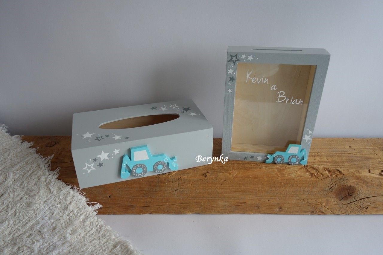 - bagr je ručně vyřezaný z překližky, namalovaný a na krabičce nalepený