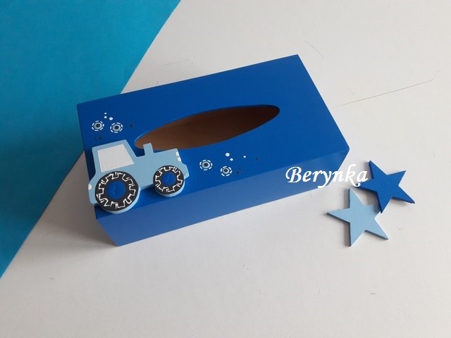 - traktor je ručně vyřezaný z překližky, namalovaný a na krabičce nalepený