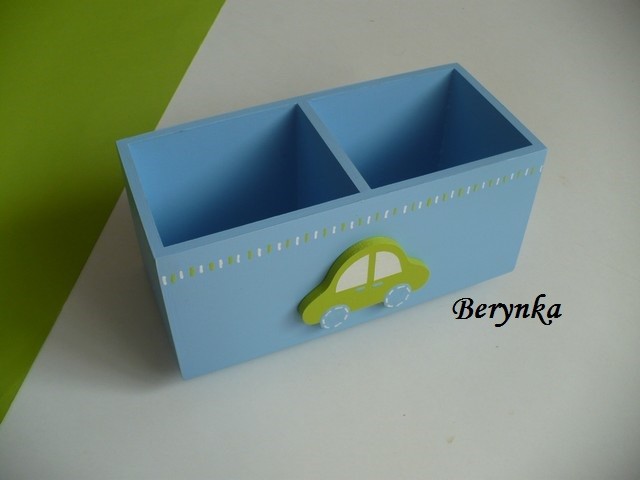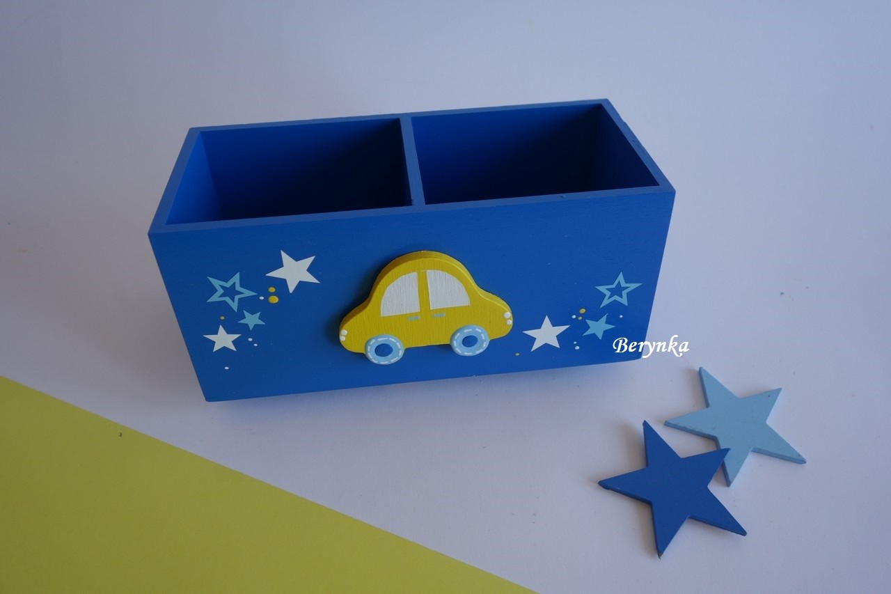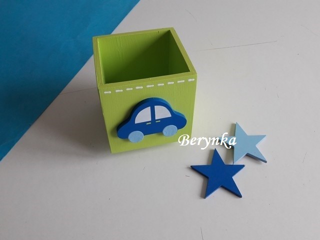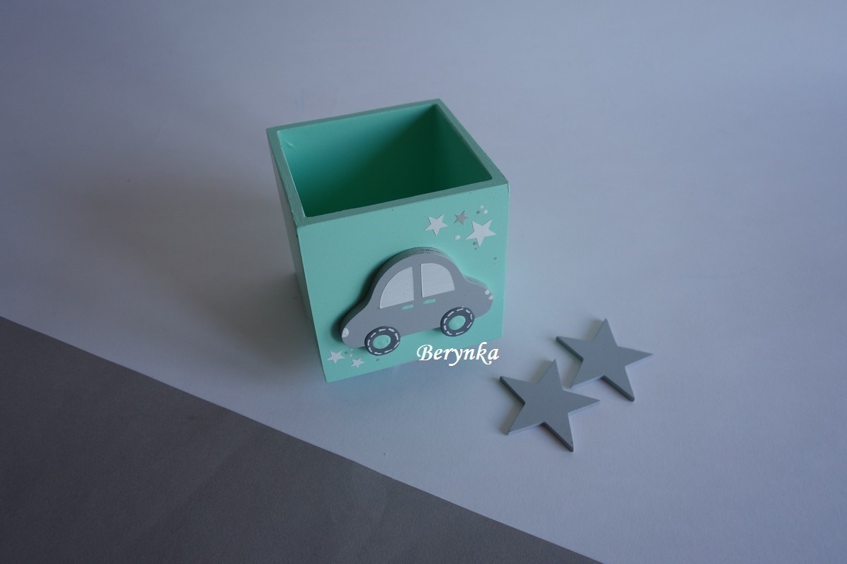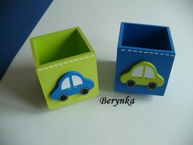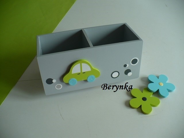 Dřevěný stojánek na tužky s autíčkem