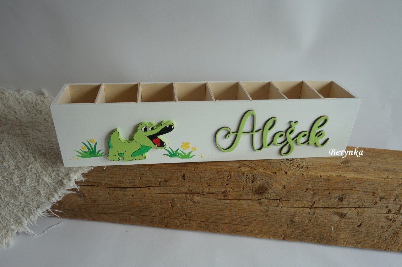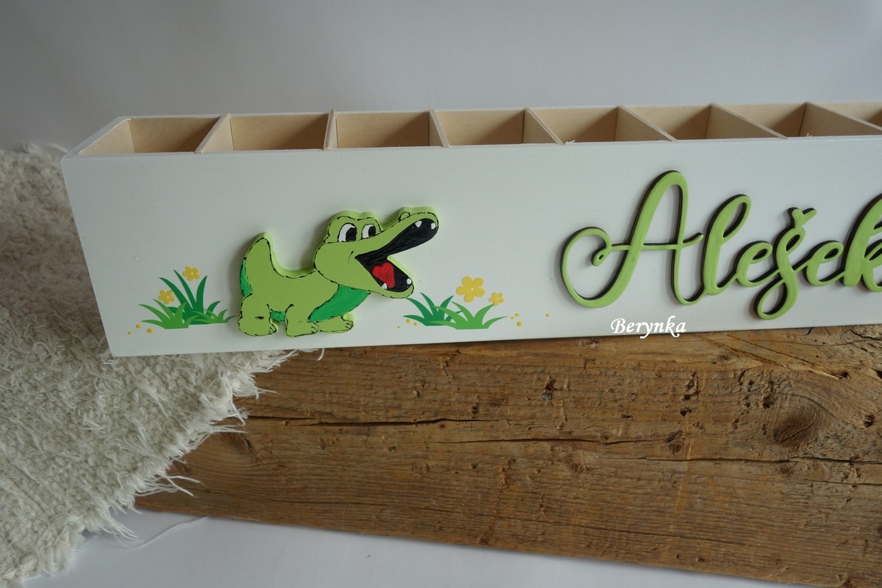 - krokodýl je ručně vyřezaný z překližky, namalovaný a na stojánku nalepený