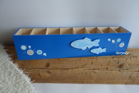 - rybička je ručně vyřezaná z překližky, namalovaná a na stojánku nalepená