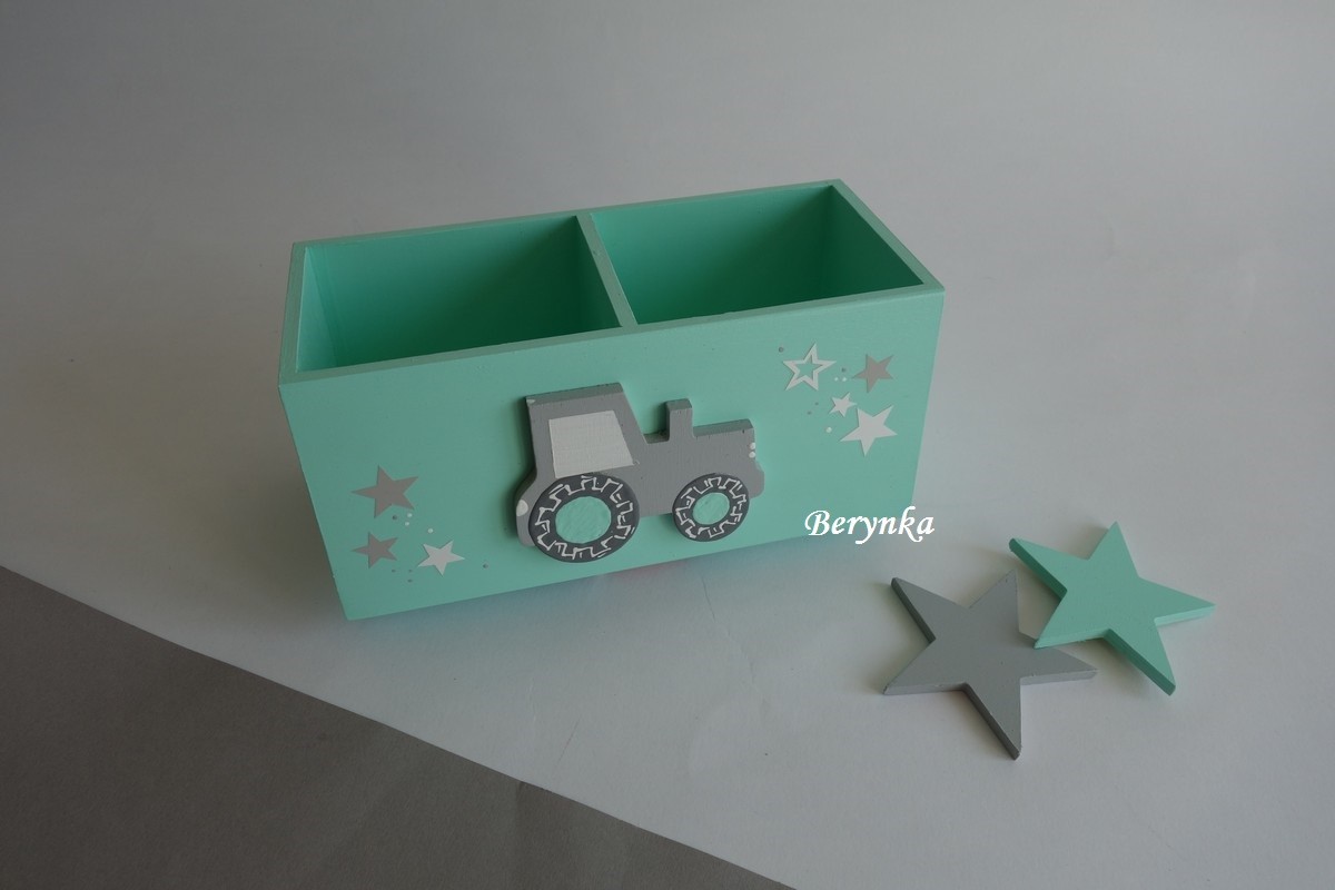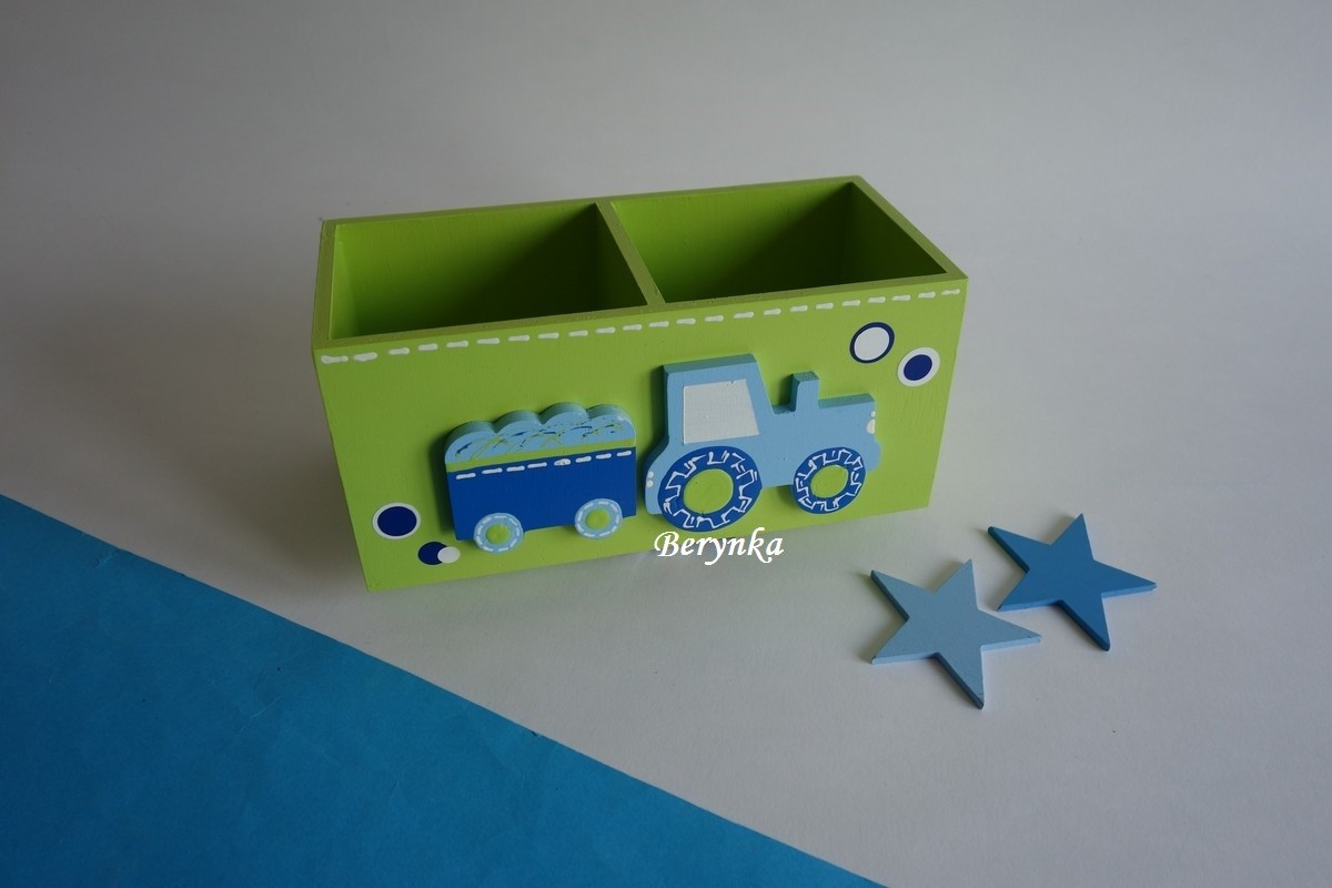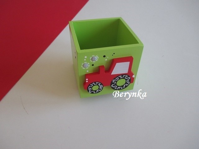 - traktor je ručně vyřezaný z překližky, namalovaný a na stojánku nalepený