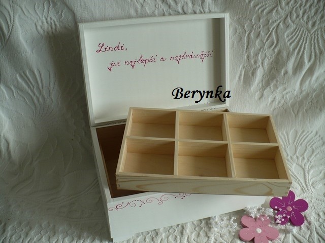 - součástí je vnitřní vložka s přihrádkami, která je položená na dvou zarážkách uprostřed boků, takže pod ní je místo na uložení větších věcí (např. čelenek, korálků, náramků …)