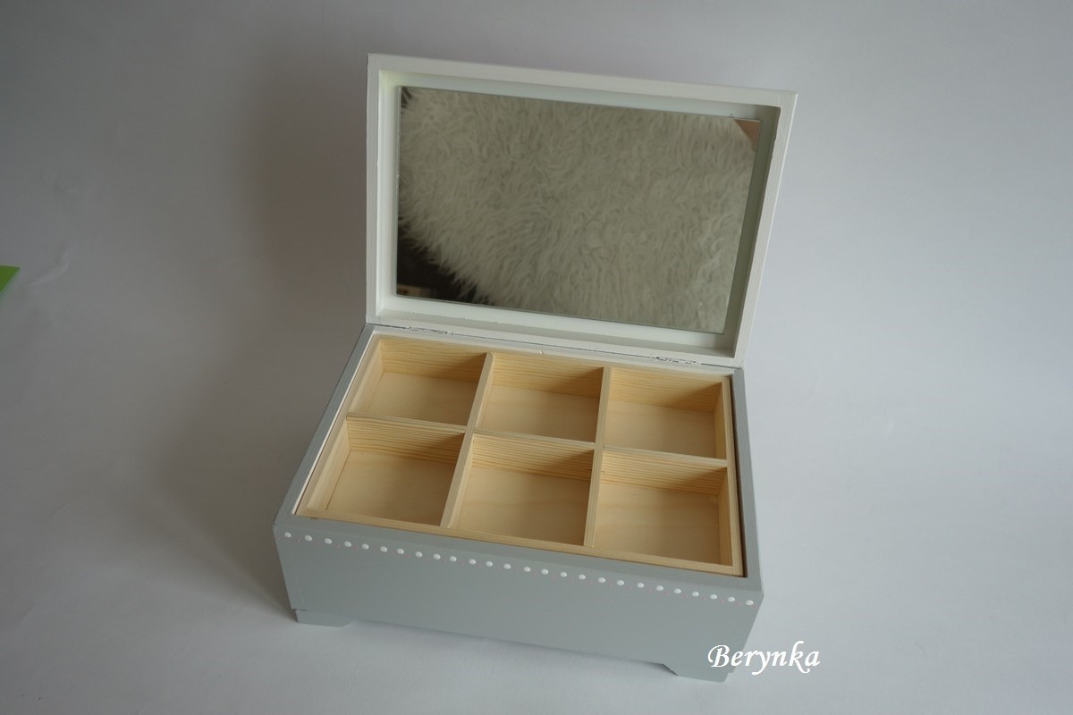 - součástí je vnitřní vložka s přihrádkami, která je položená na dvou zarážkách uprostřed boků, takže pod ní je místo na uložení větších věcí (např. čelenek, korálků, náramků …)