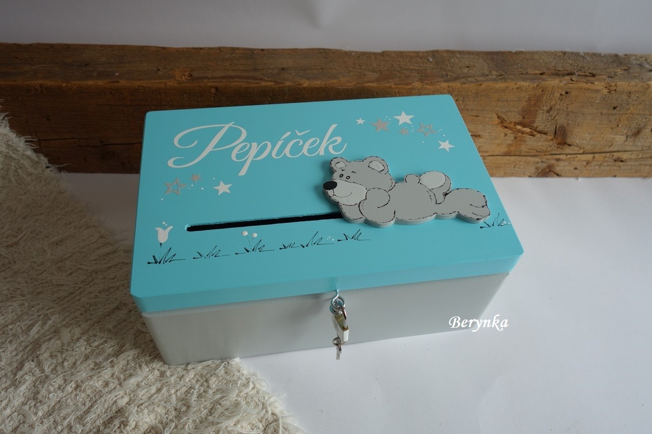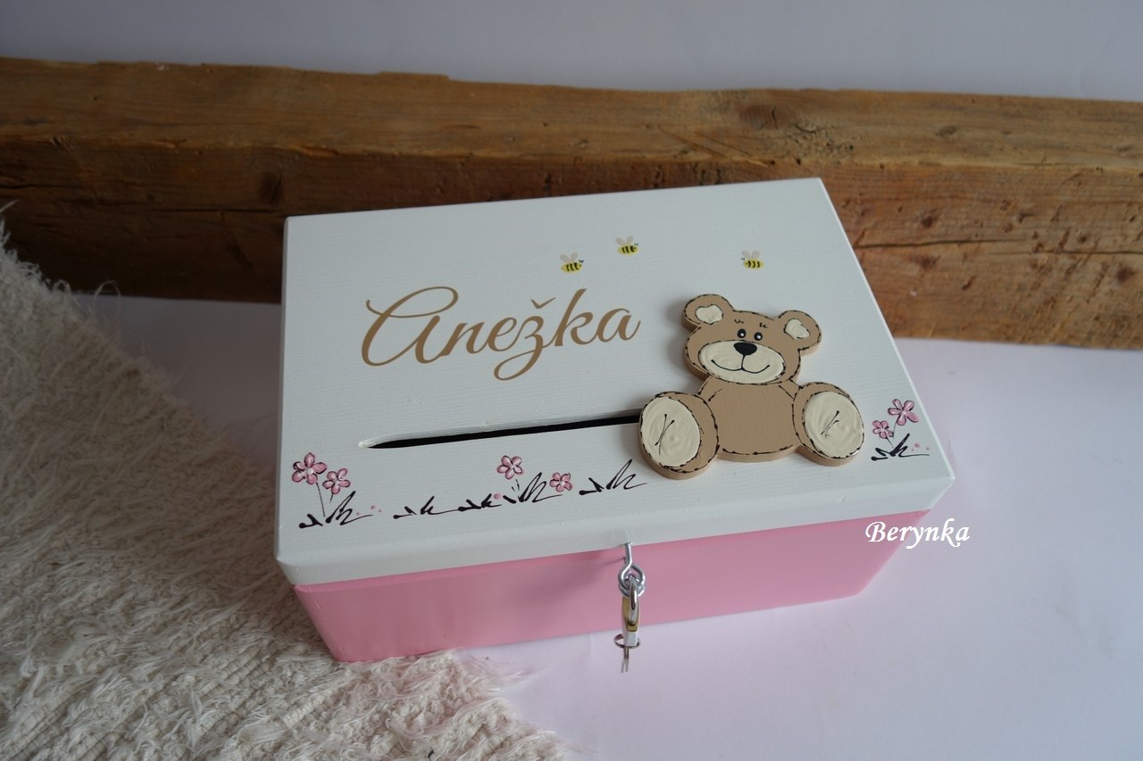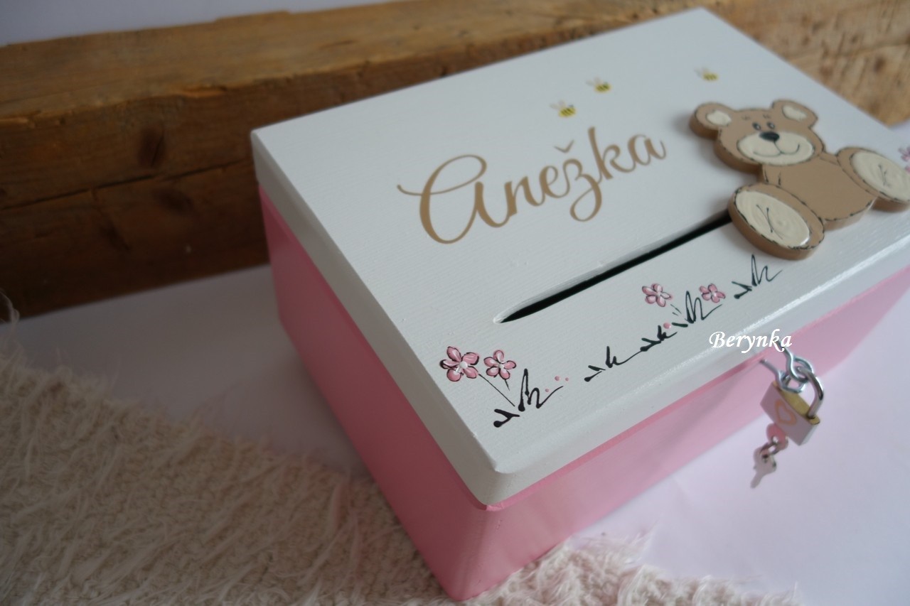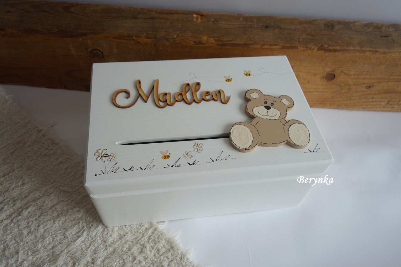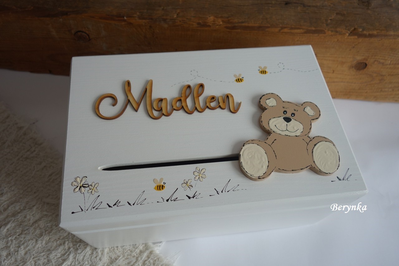 - medvídek je ručně vyřezaný z překližky a na krabičce nalepený