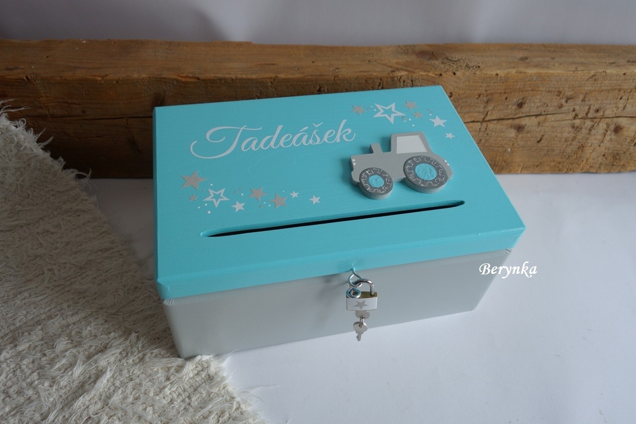 - ve víku je otvor - pro vhození mincí, bankovek i obálek