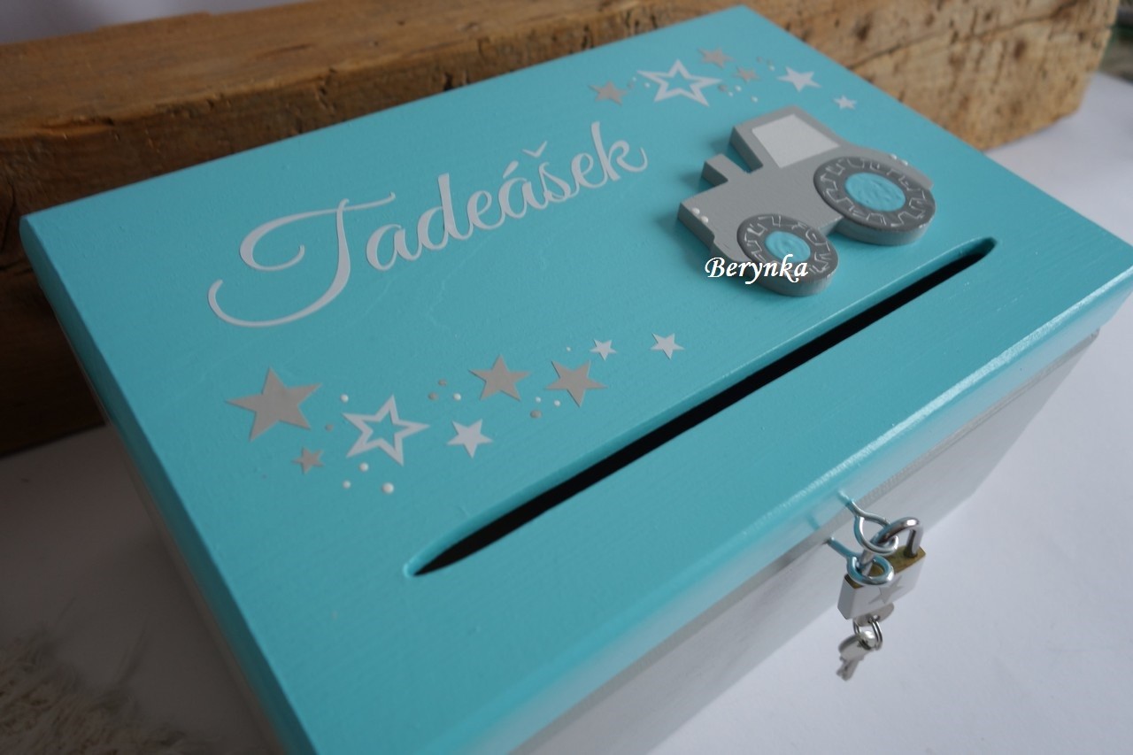 - traktor je ručně vyřezaný z překližky a na krabičce nalepený