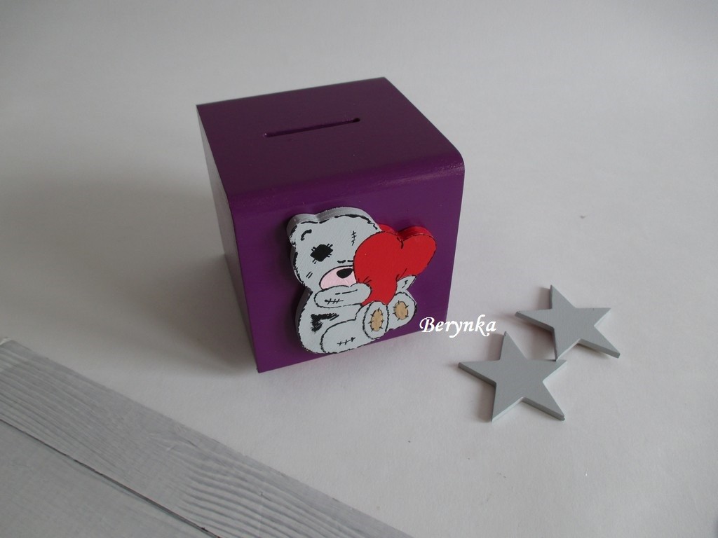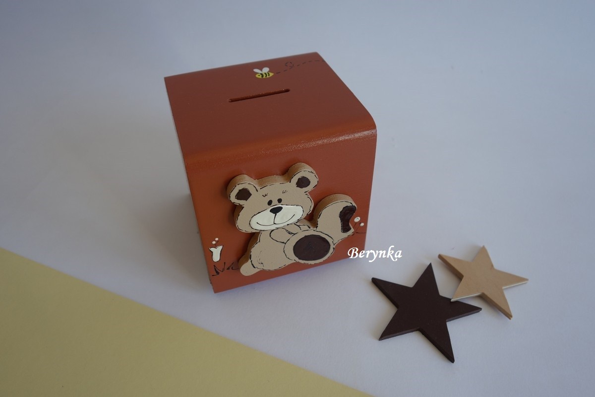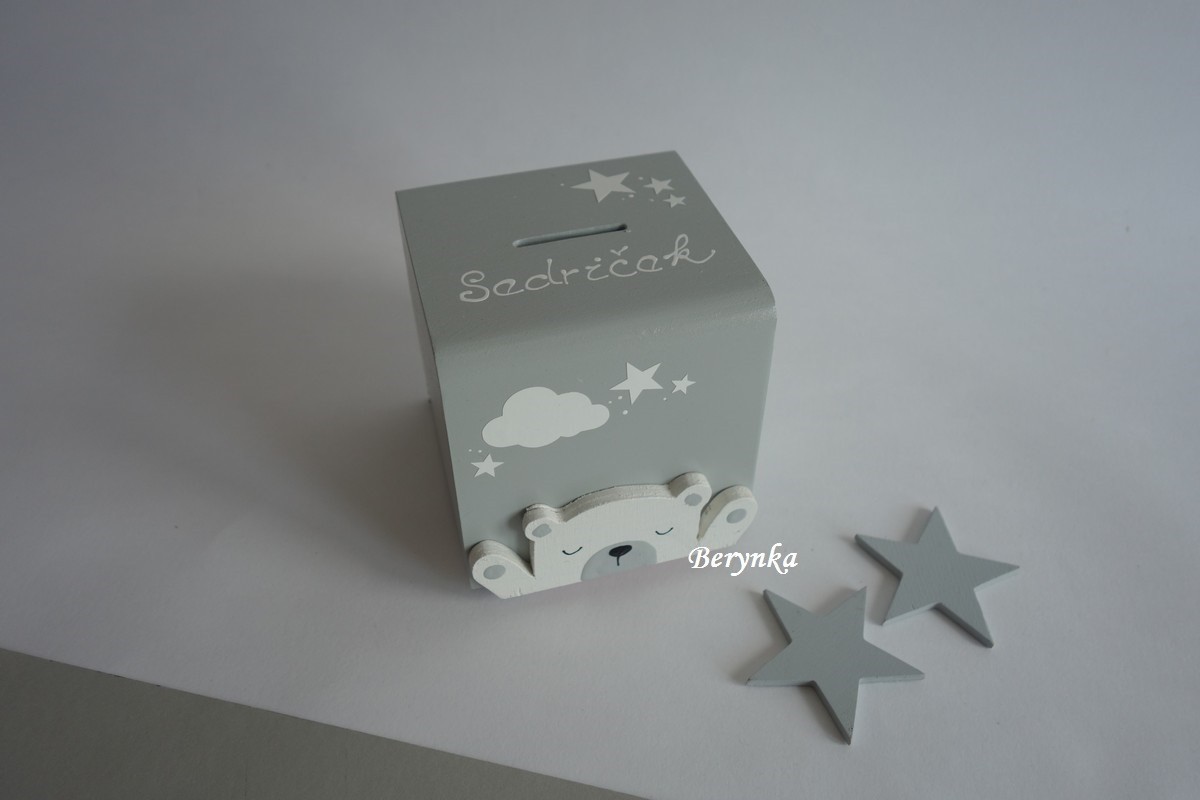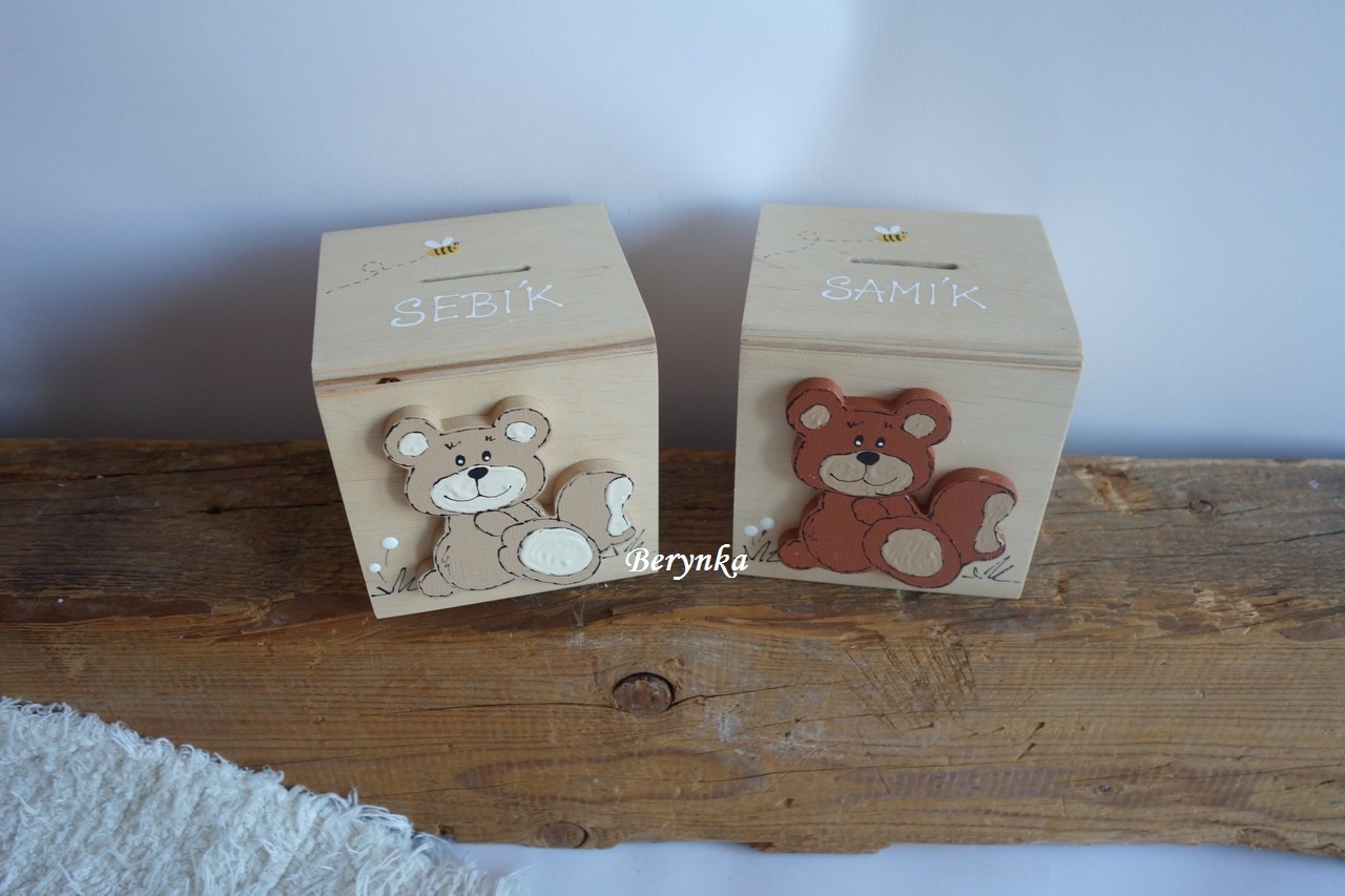 - medvídek je vyřezaný z překližky a na pokladničce nalepený