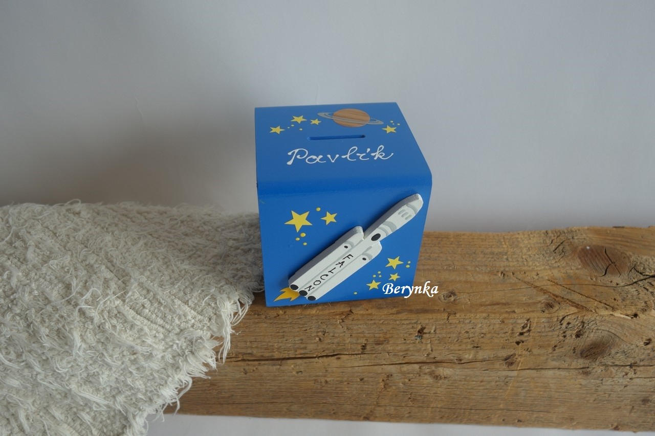 Dřevěná pokladnička s vesmírnou raketou