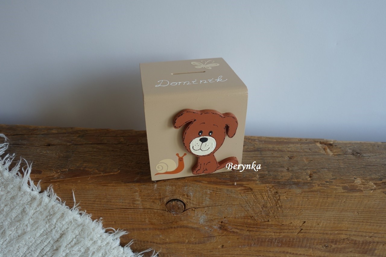 Dřevěná pokladnička se štěňátkem