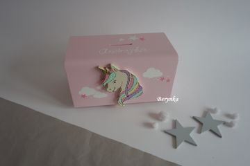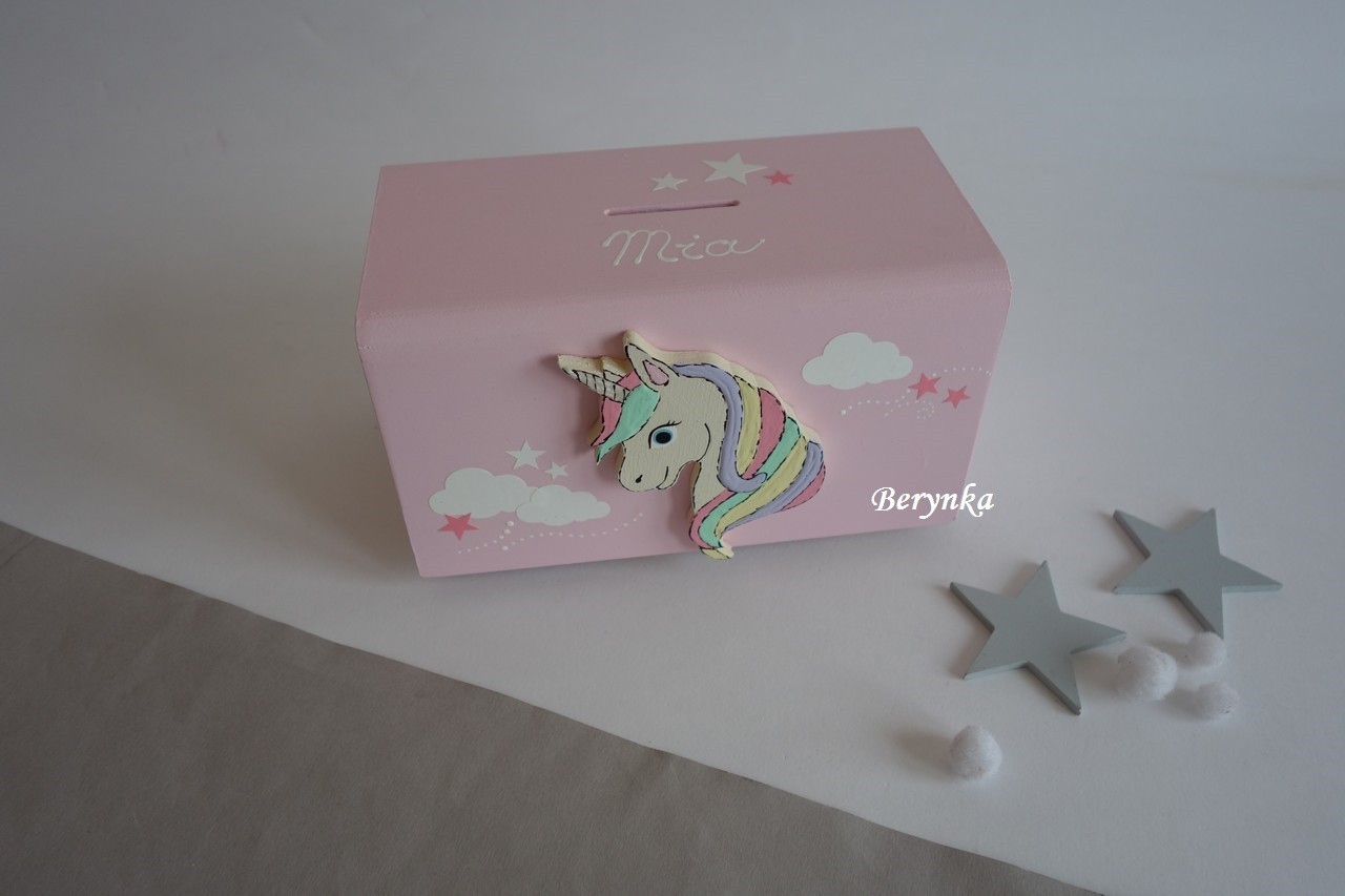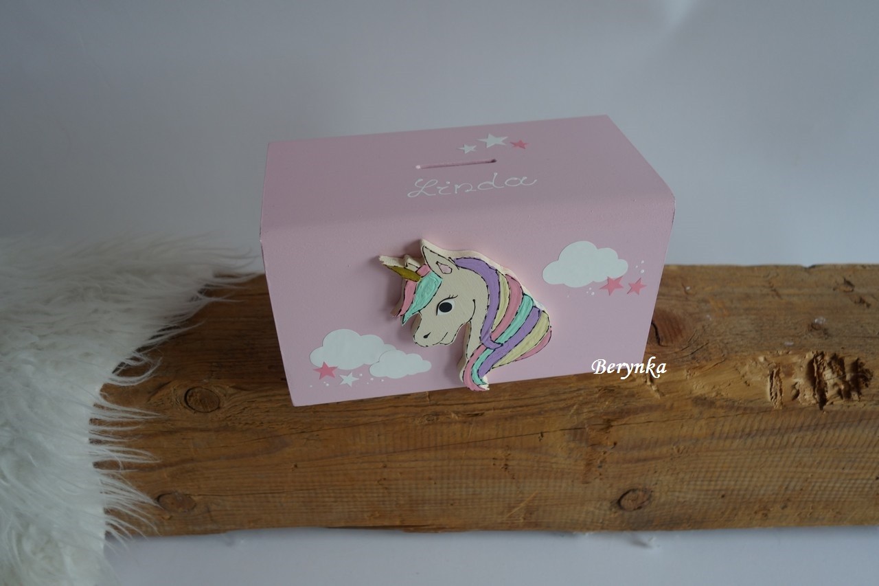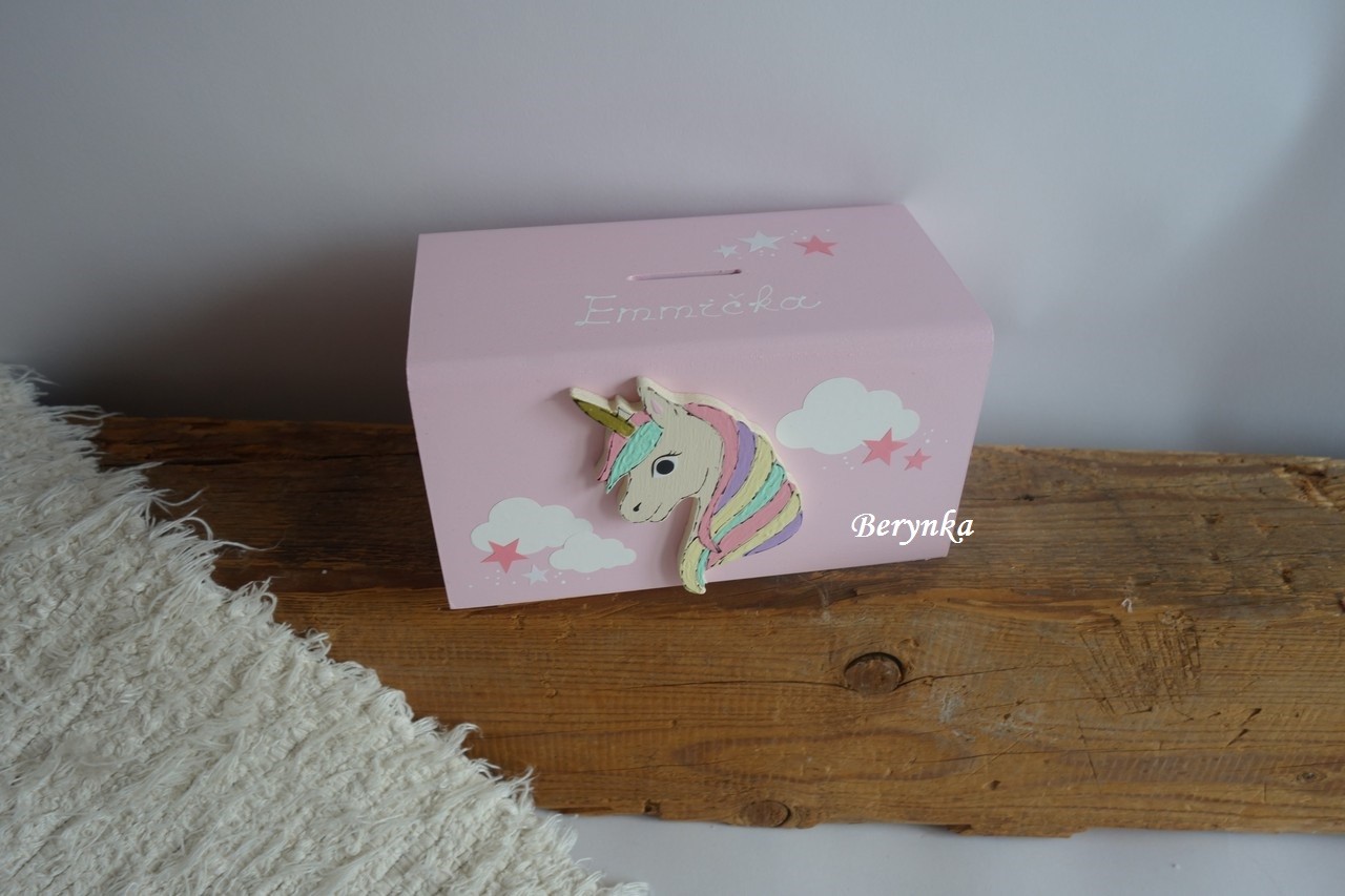 - jednorožec je vyřezaný z překližky a na pokladničce nalepený