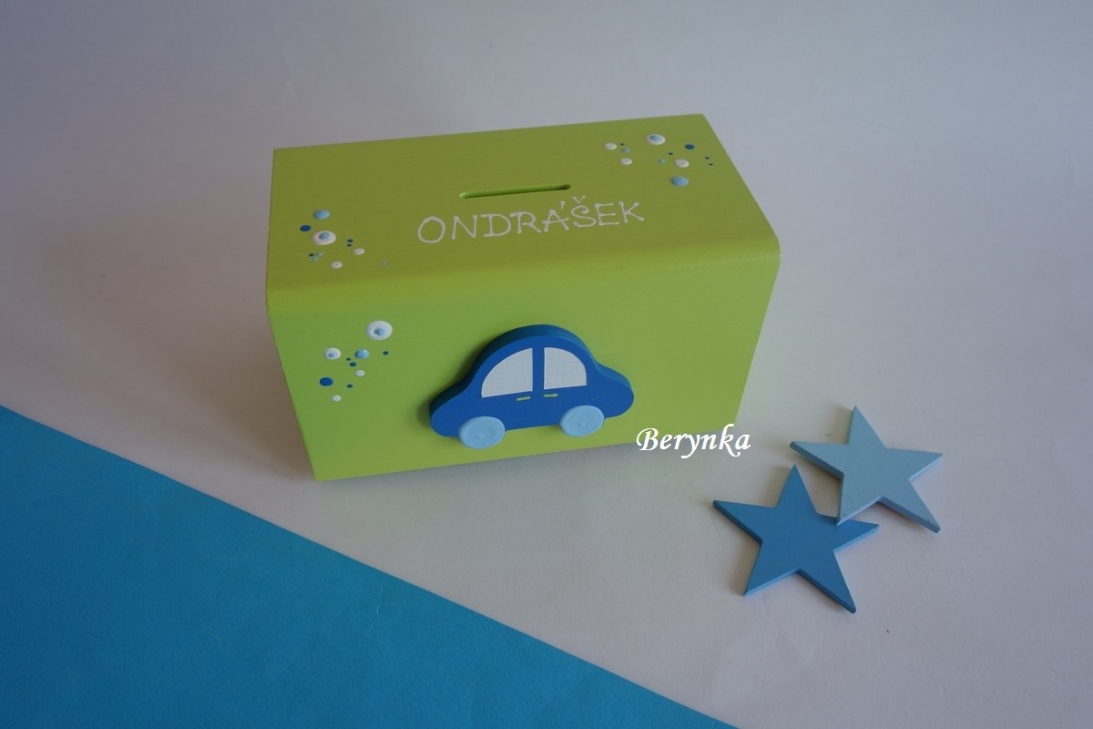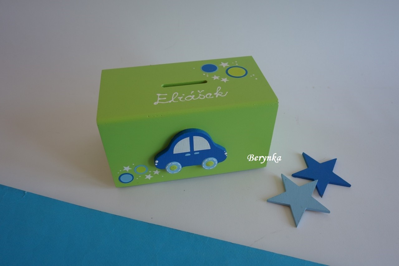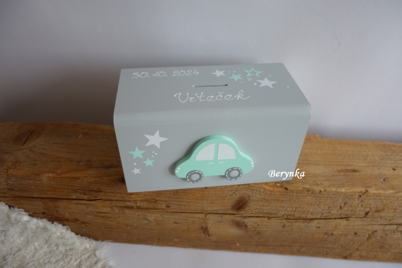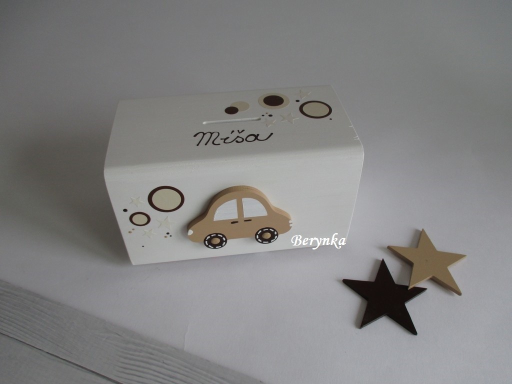 Dřevěná pokladnička s autíčkem