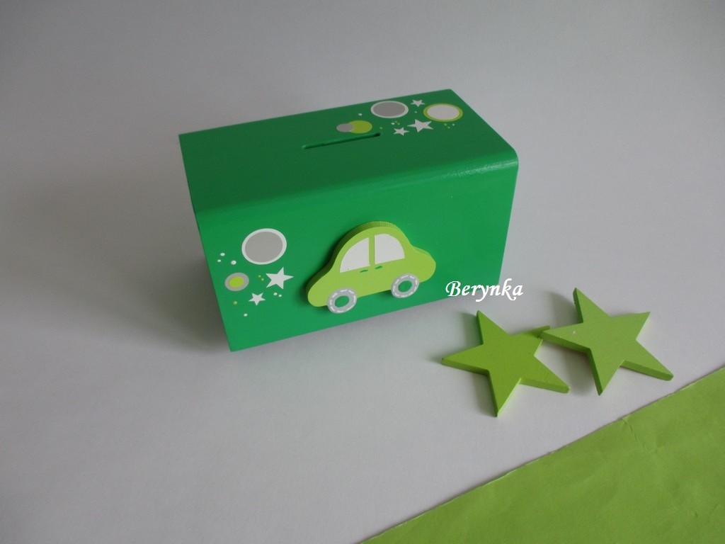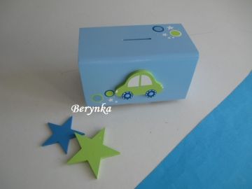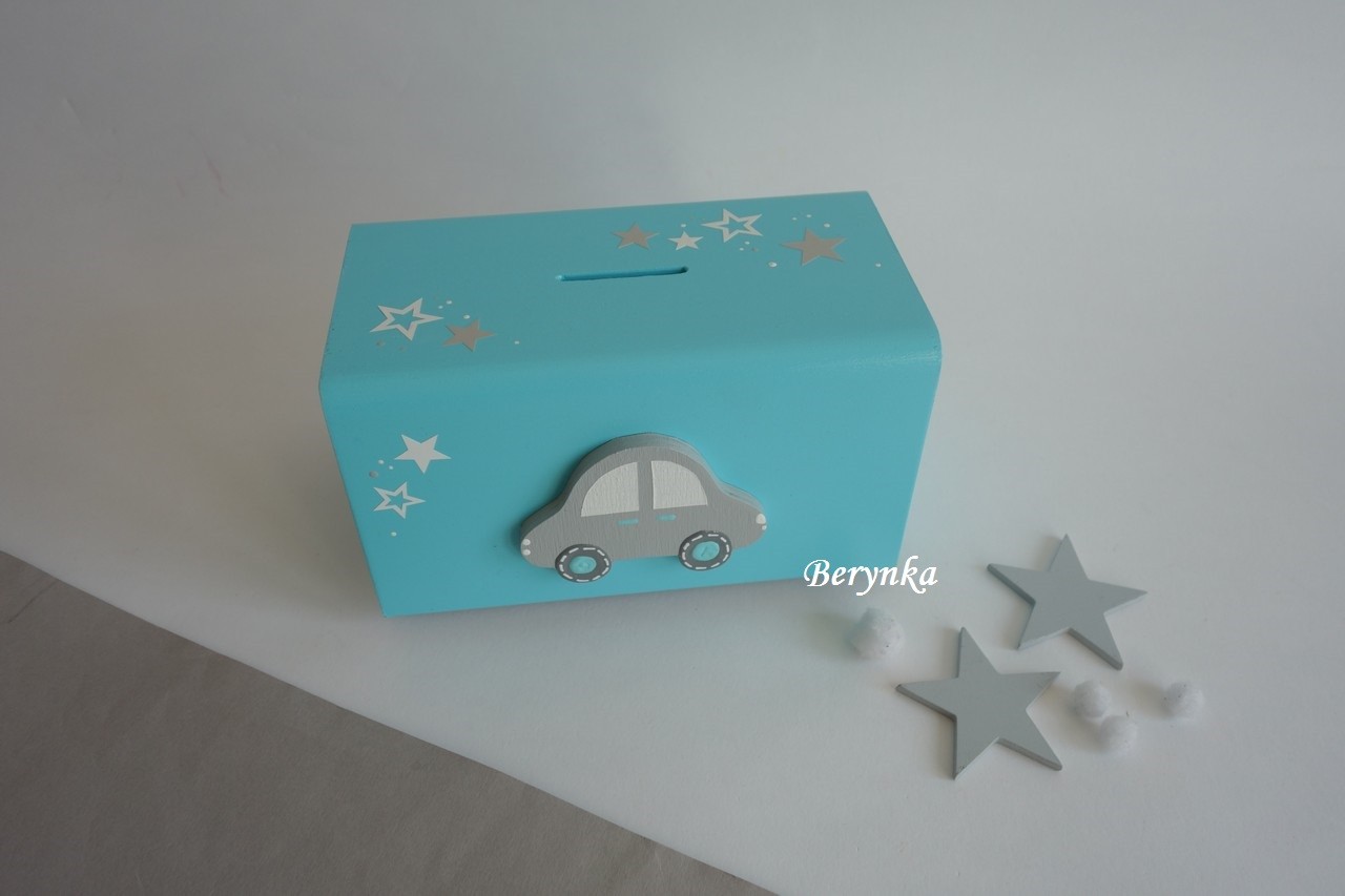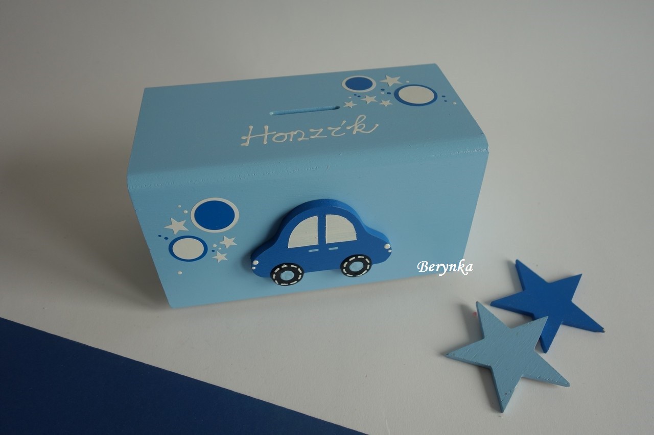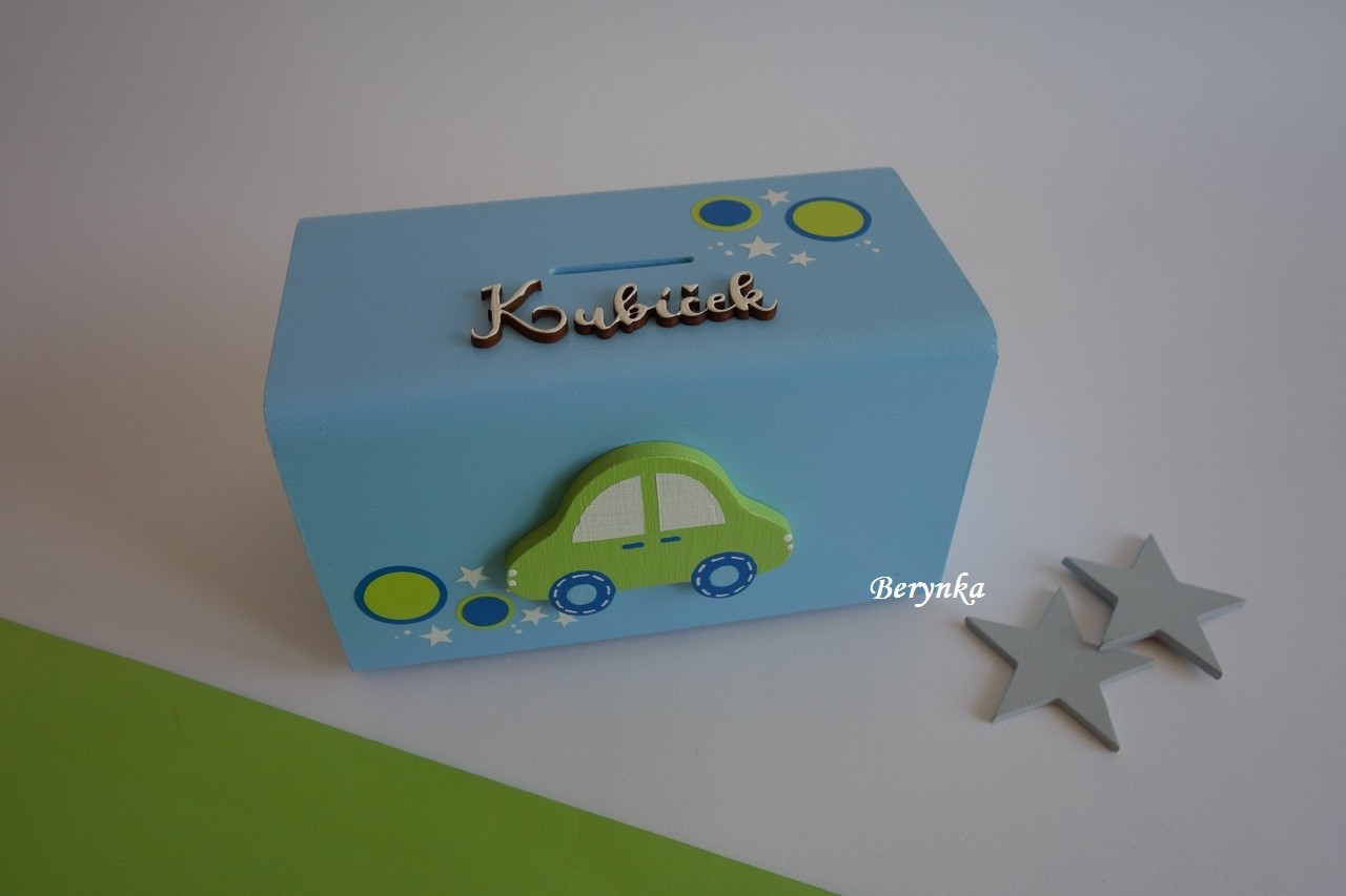Dřevěná pokladnička s autíčkem