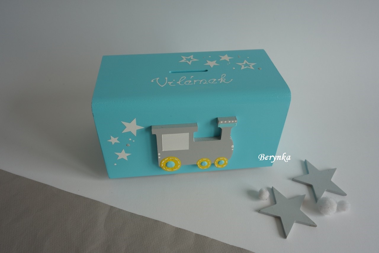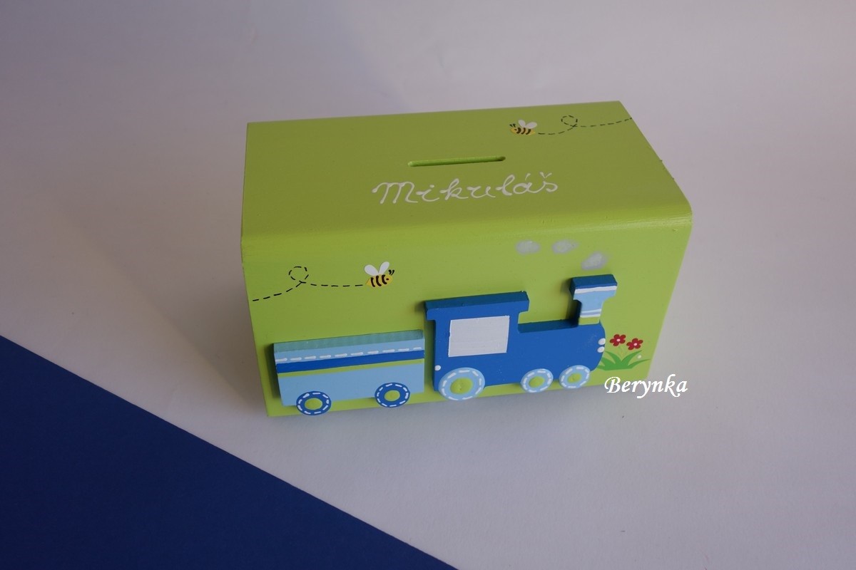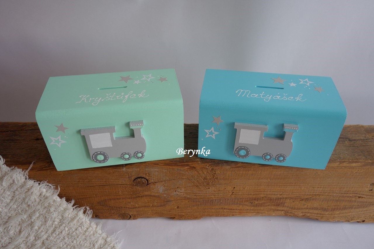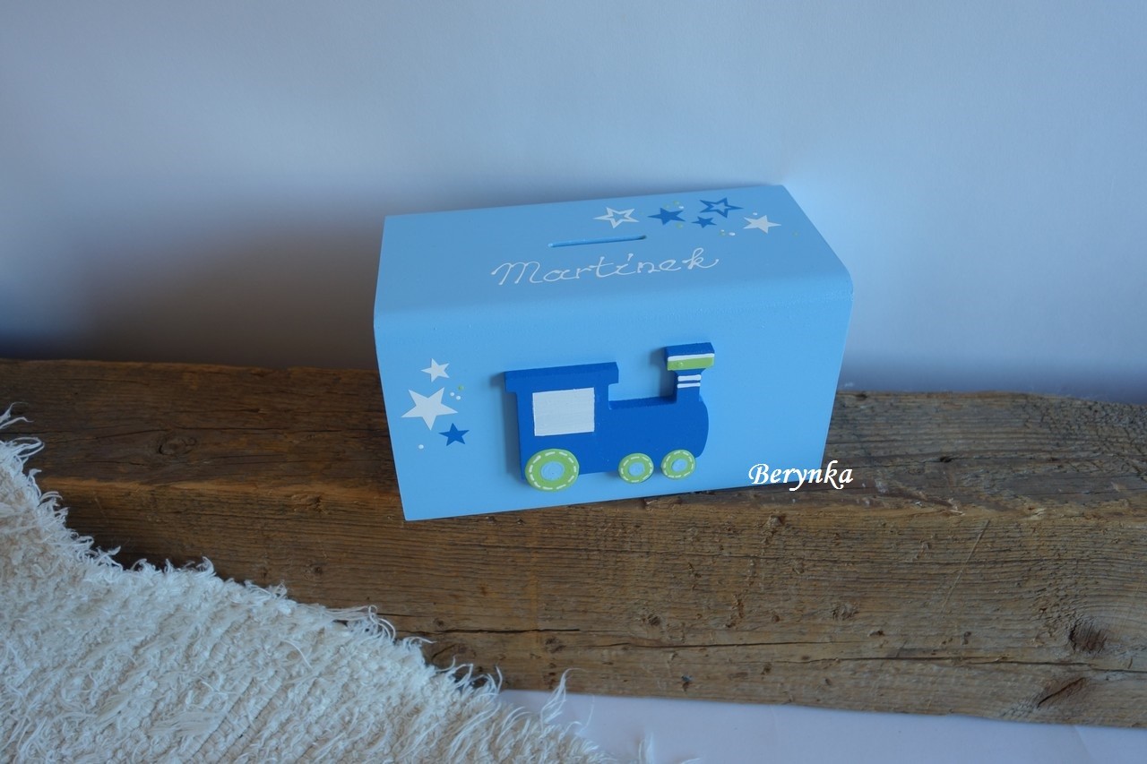 Dřevěná pokladnička s mašinkou