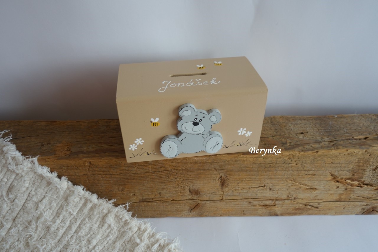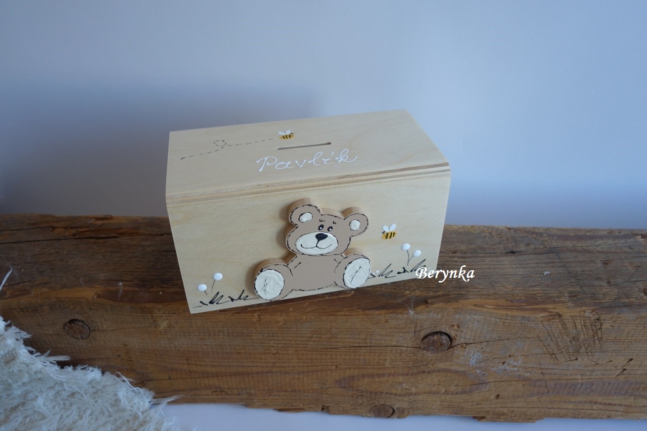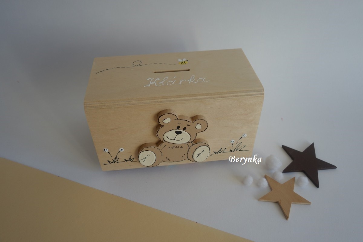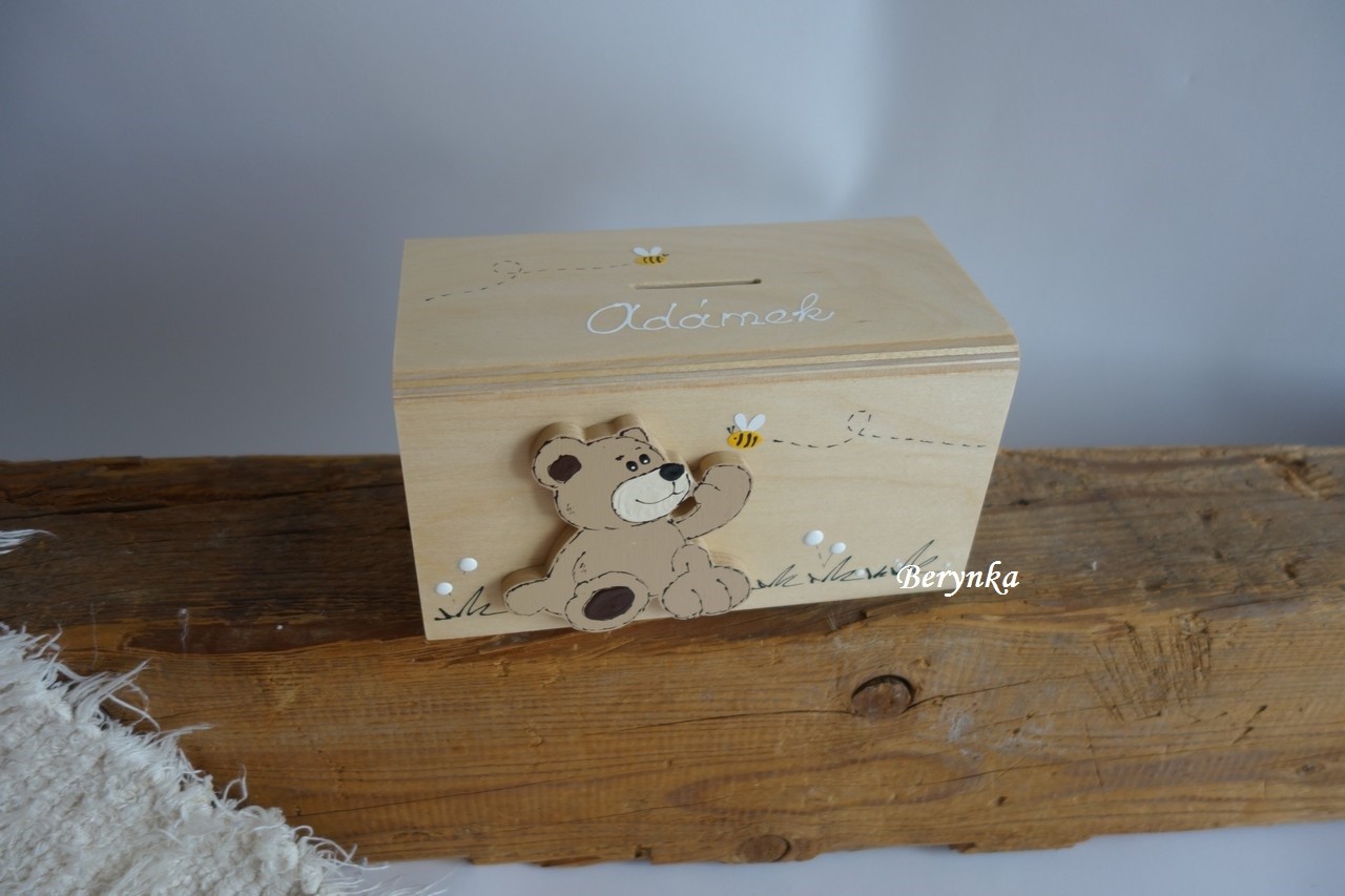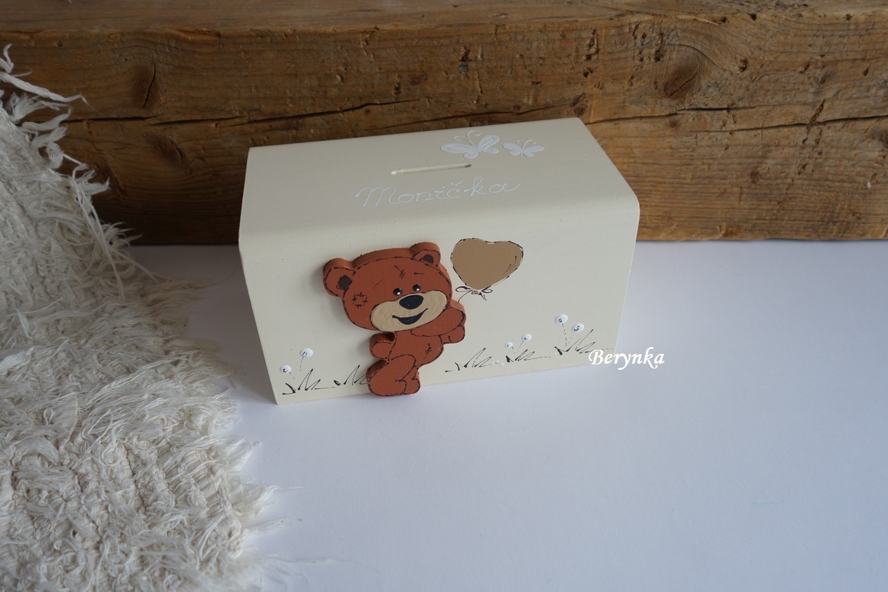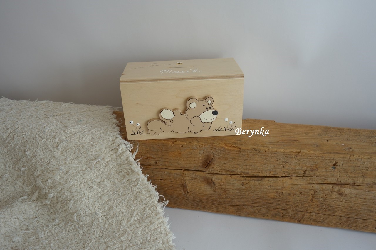 Dřevěná pokladnička s medvídkem