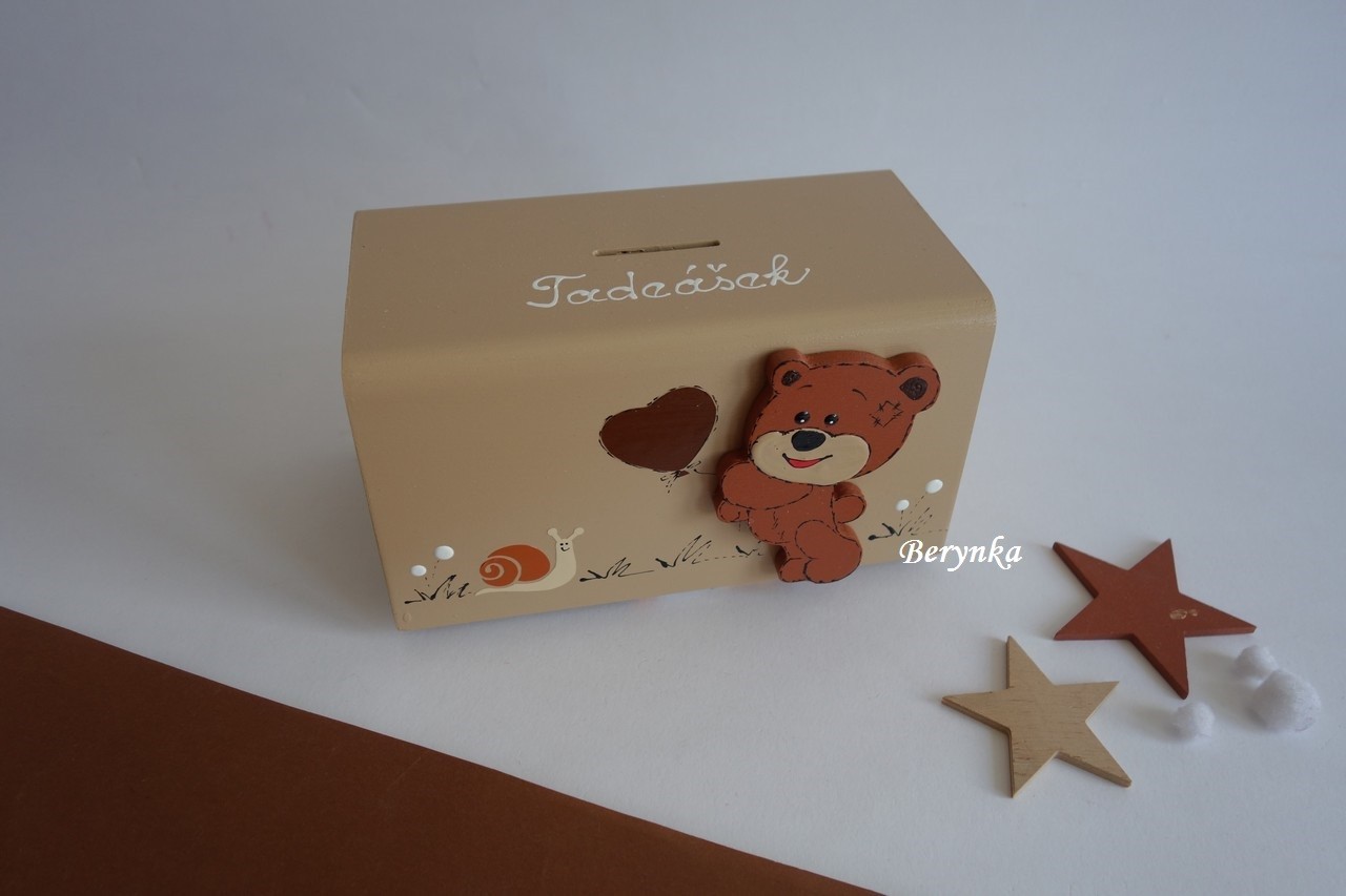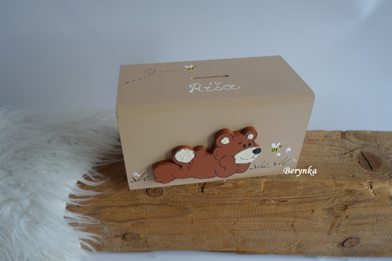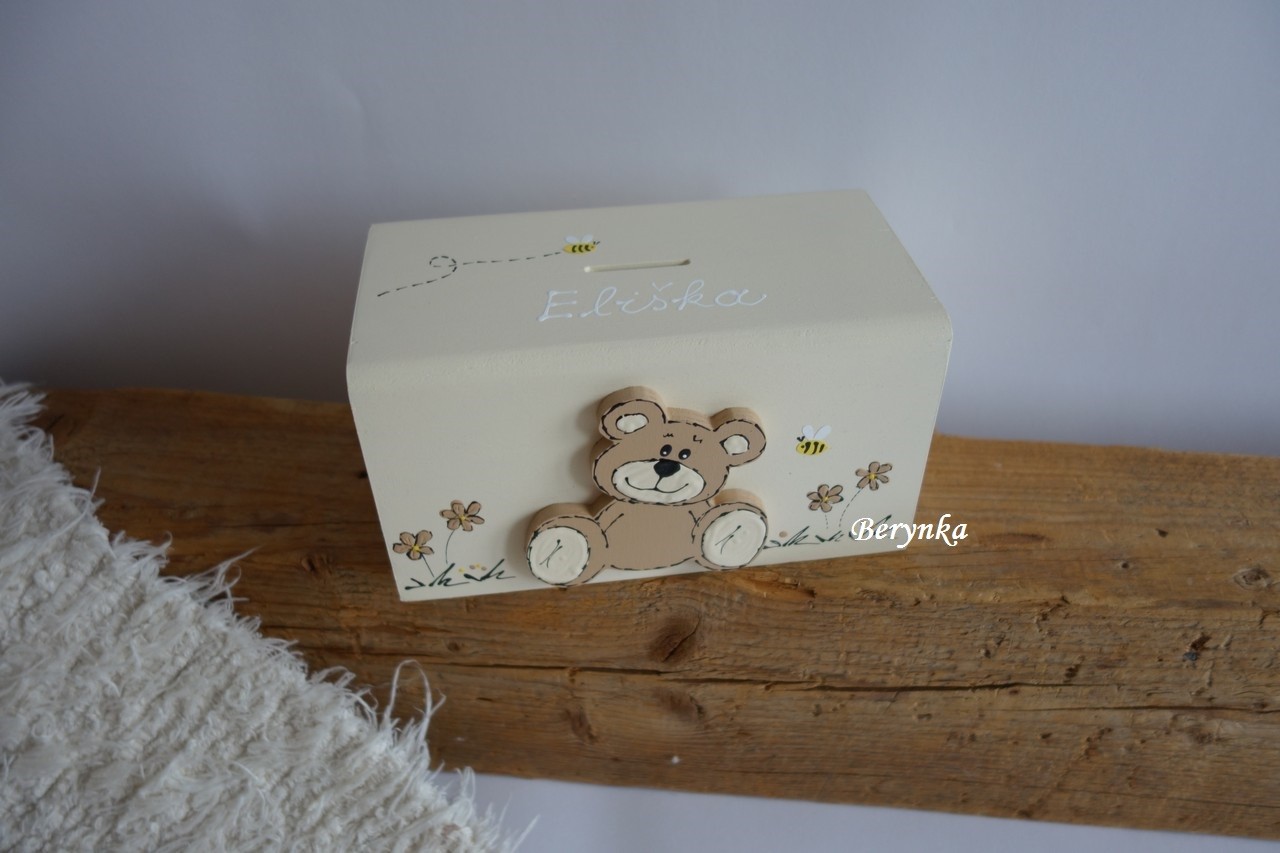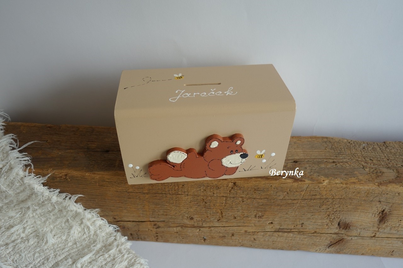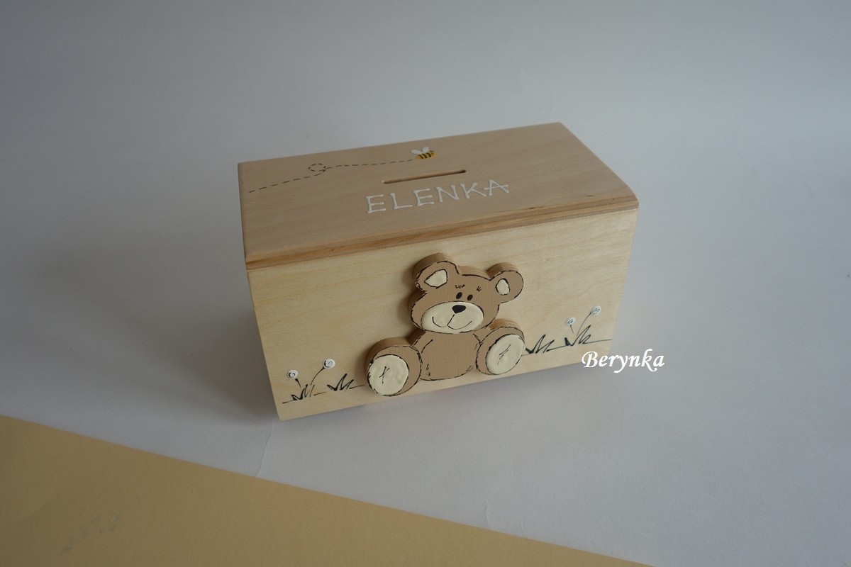 Dřevěná pokladnička s medvídkem