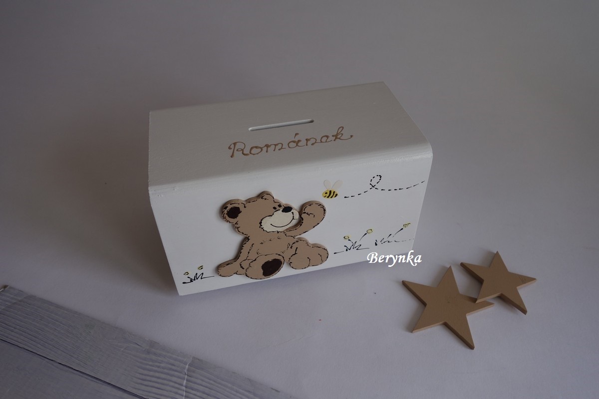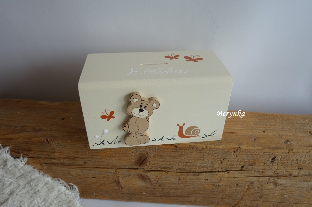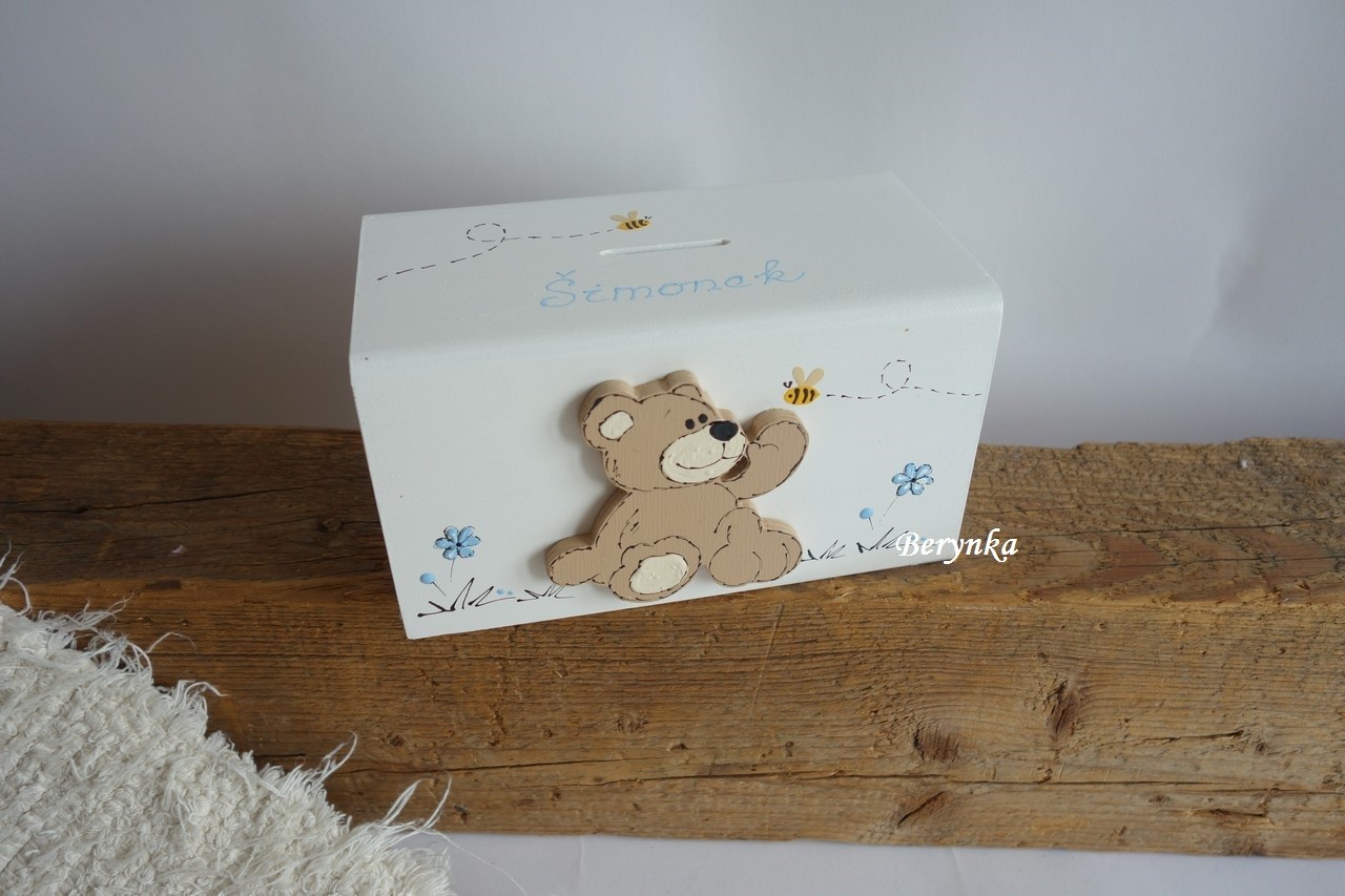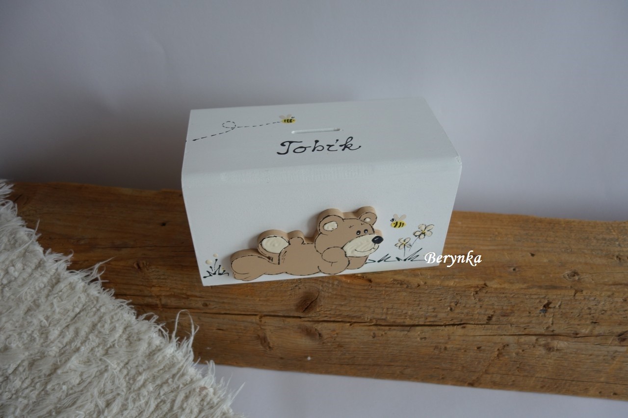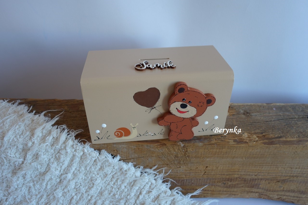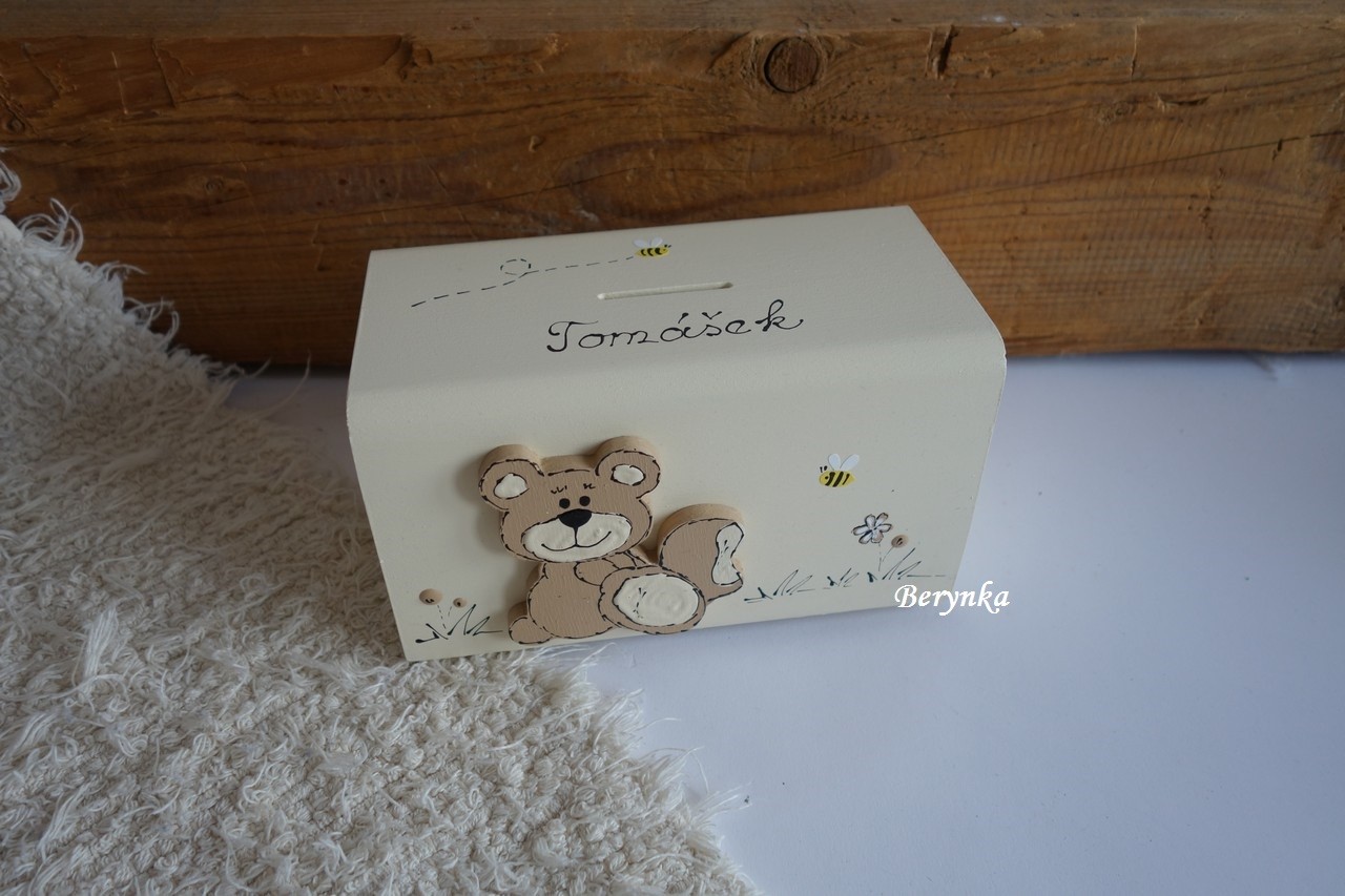 Dřevěná pokladnička s medvídkem