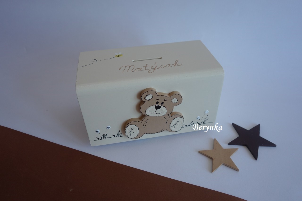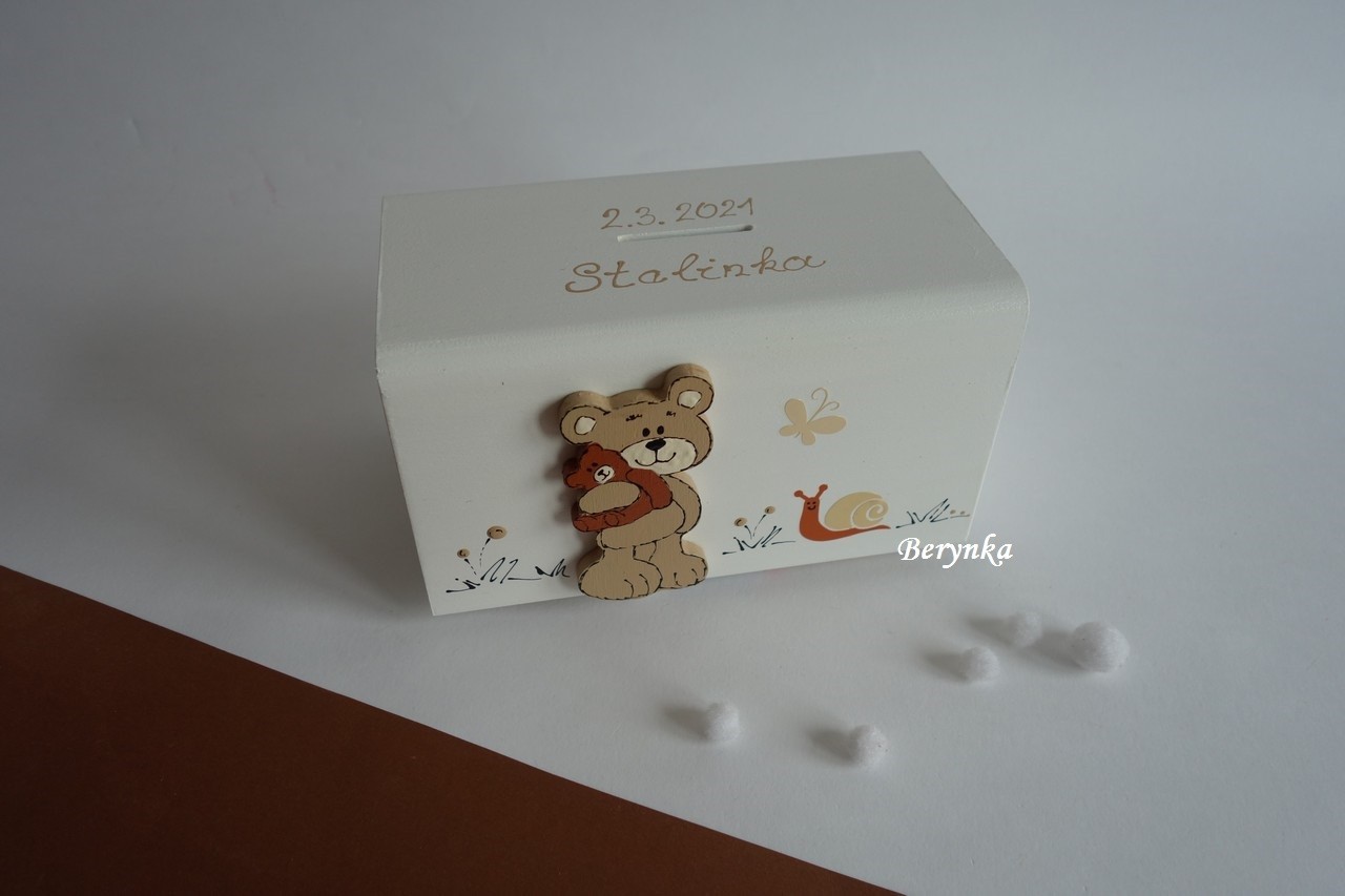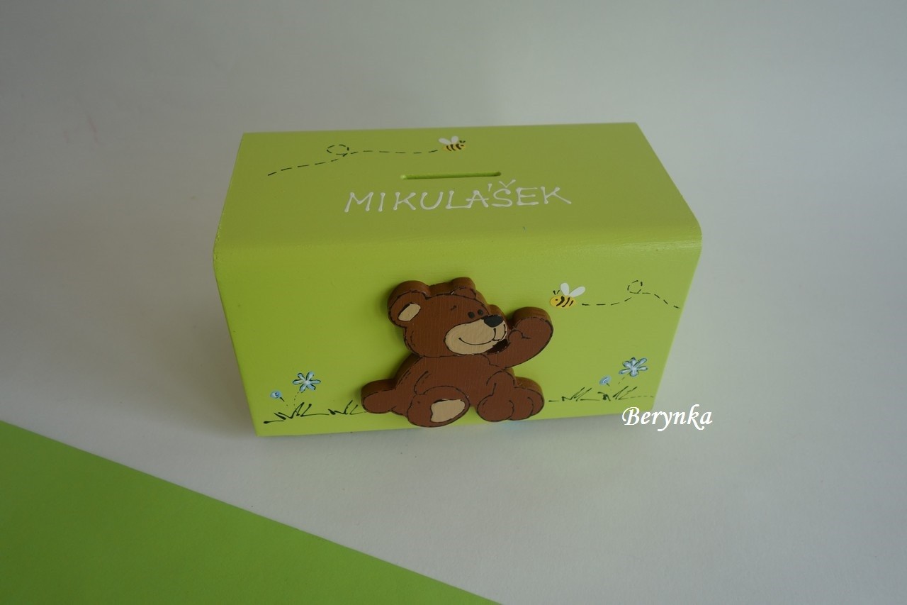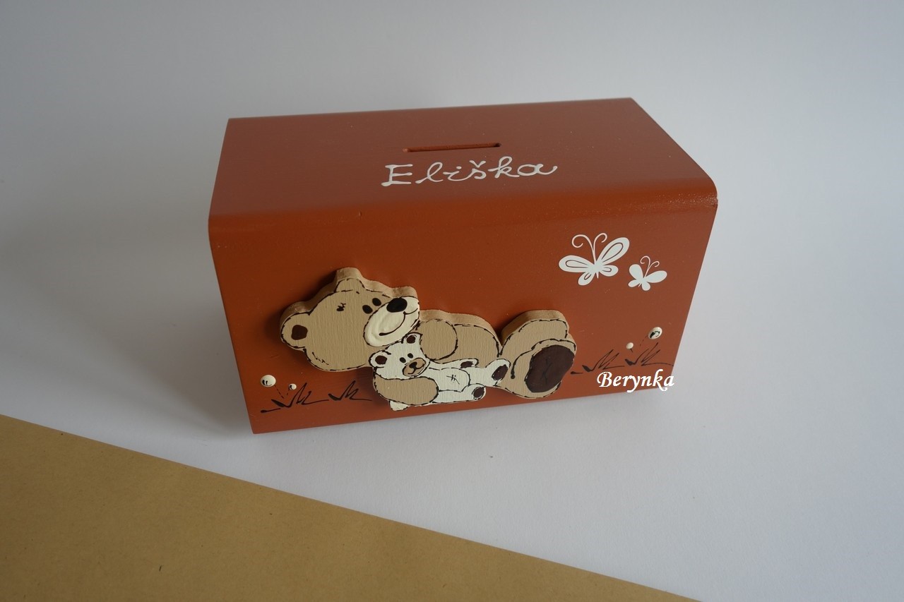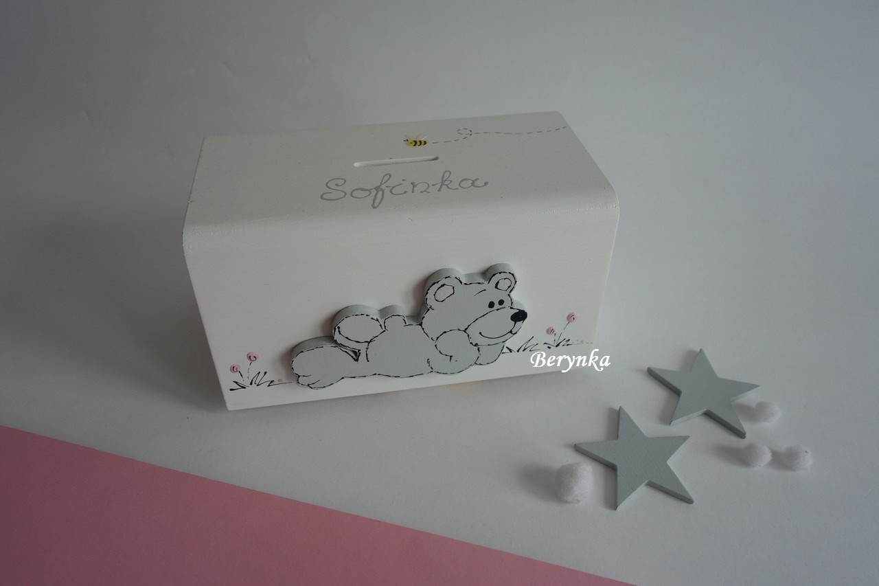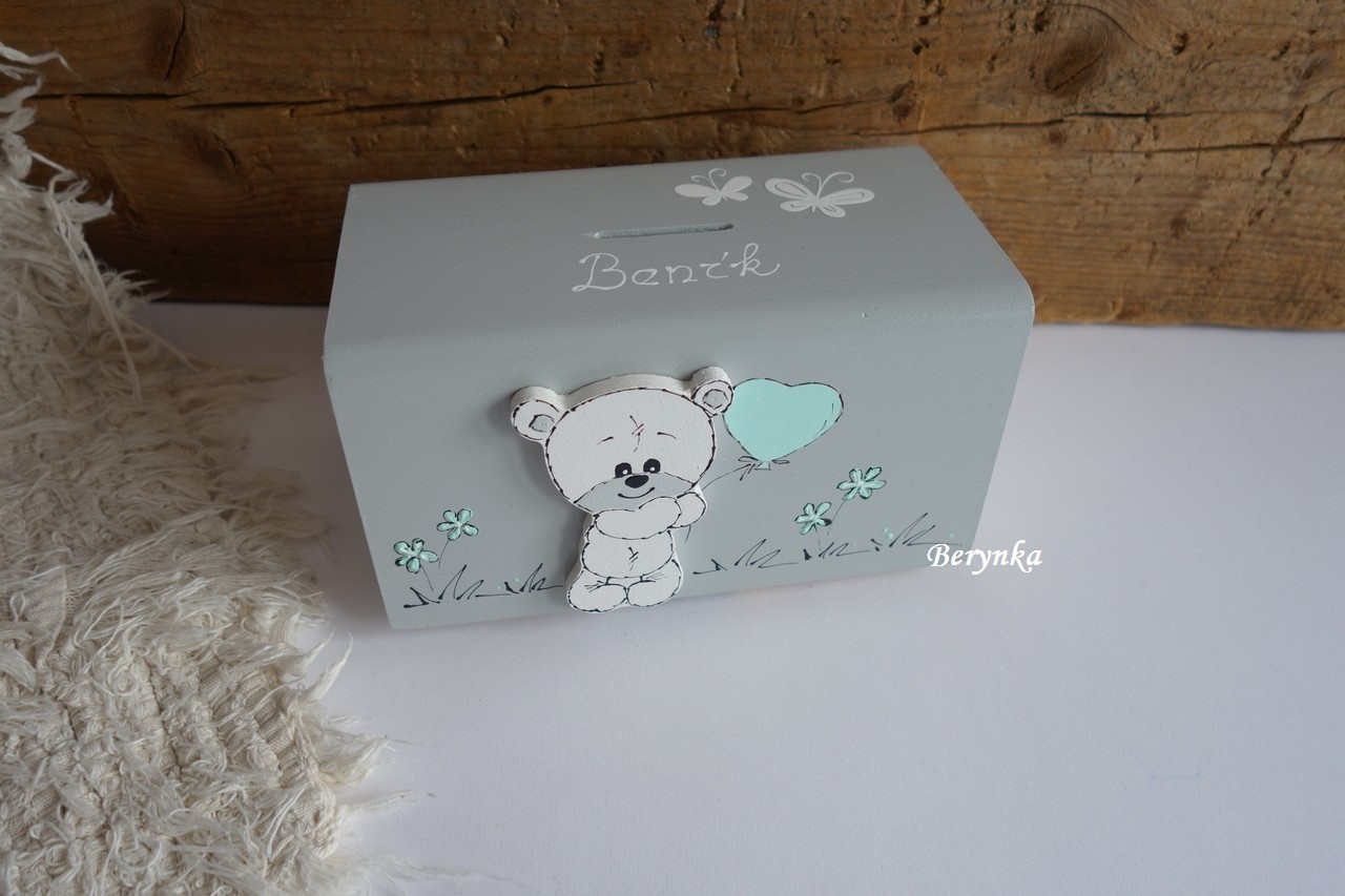 Dřevěná pokladnička s medvídkem