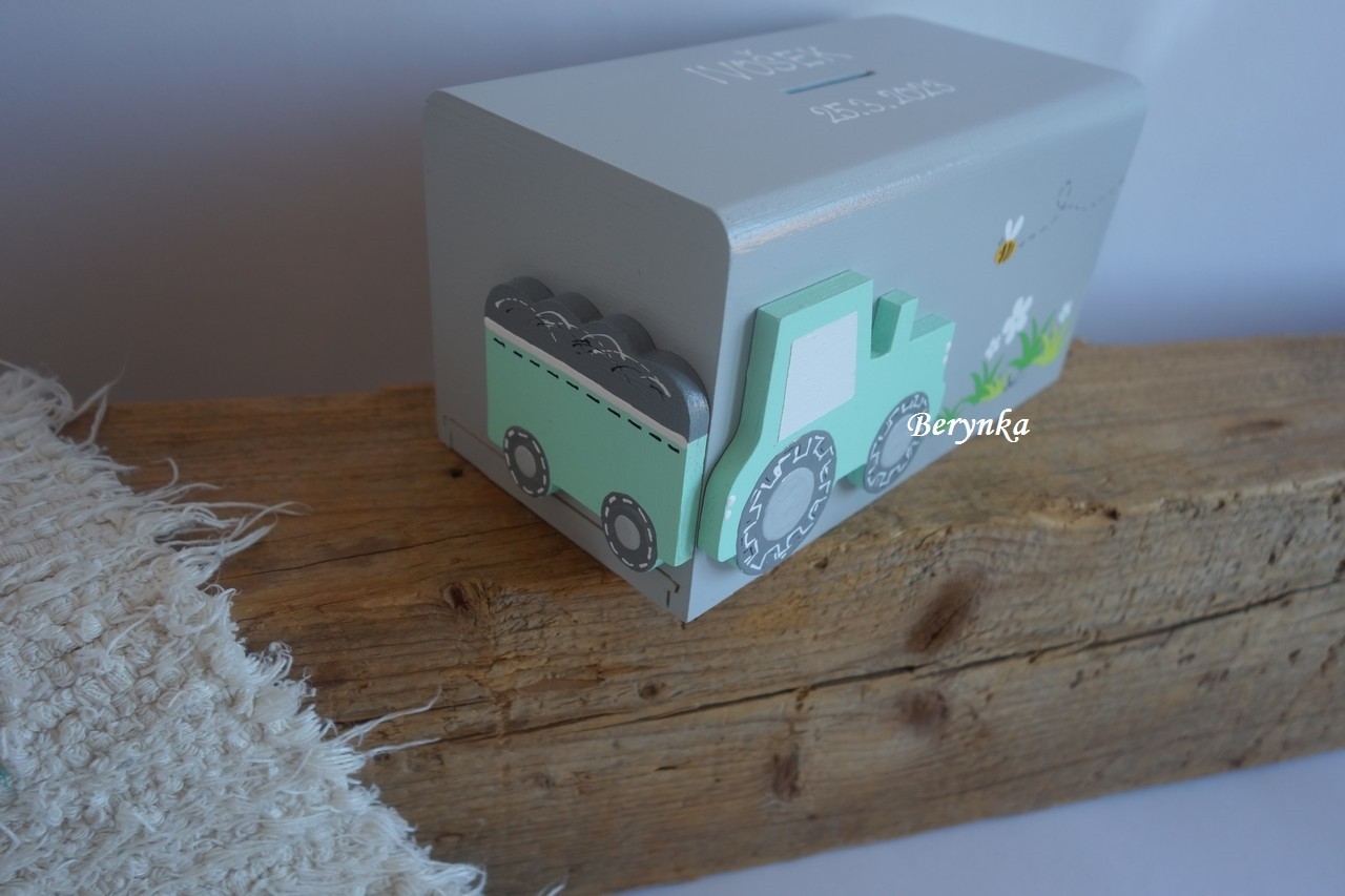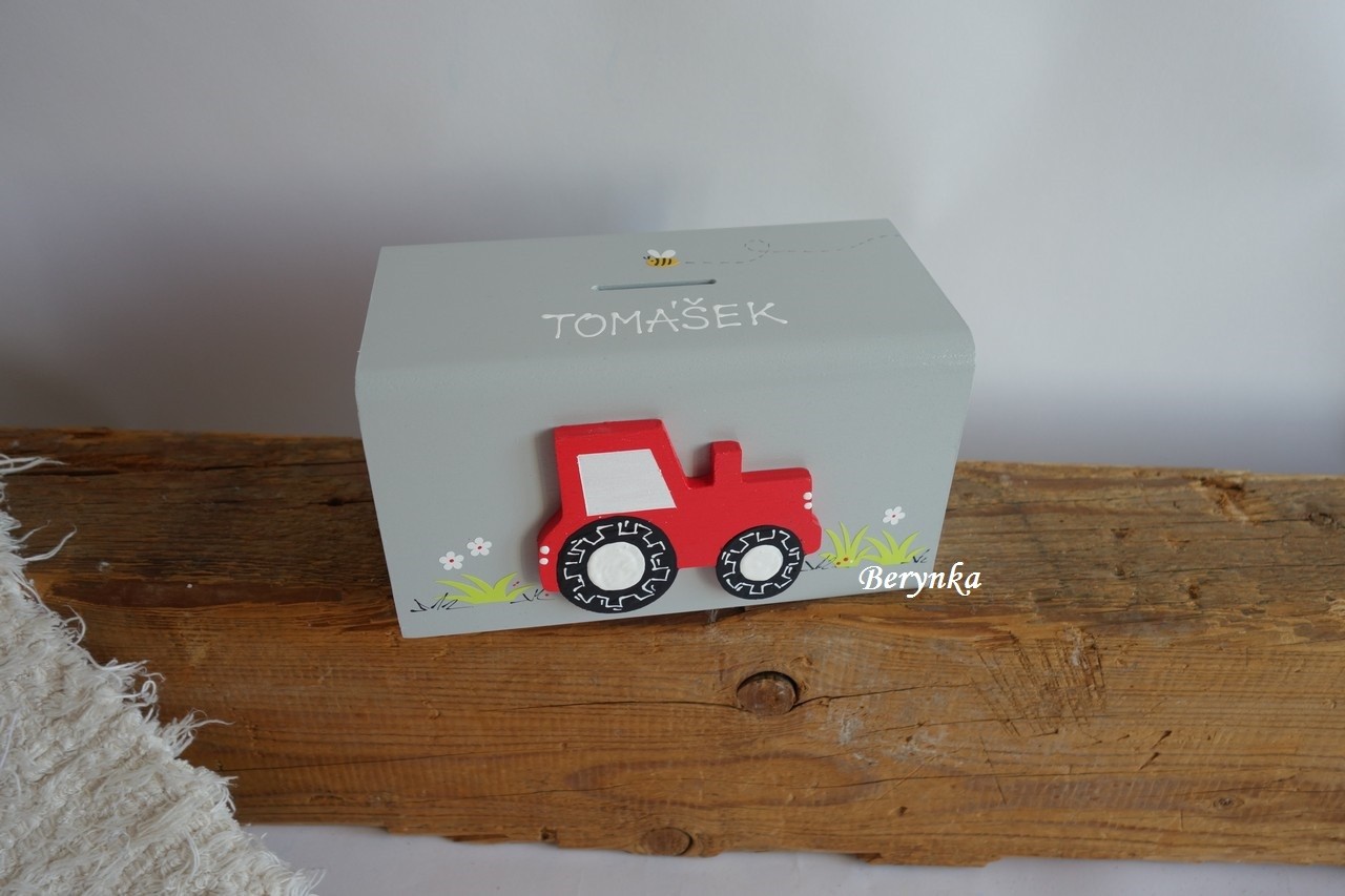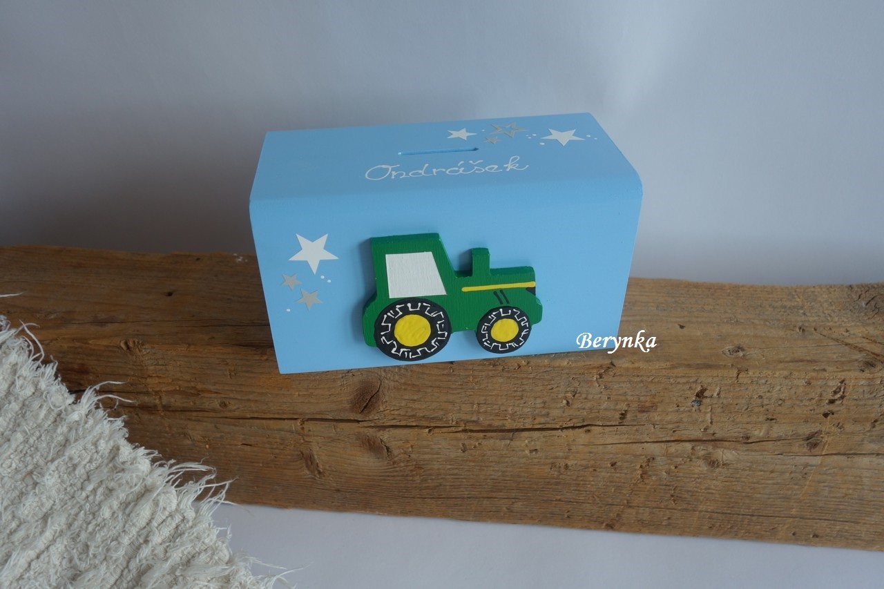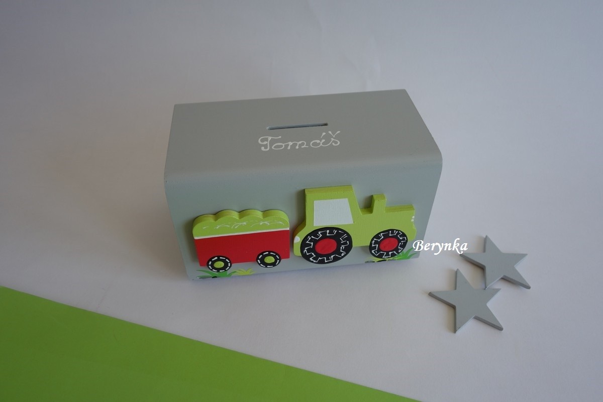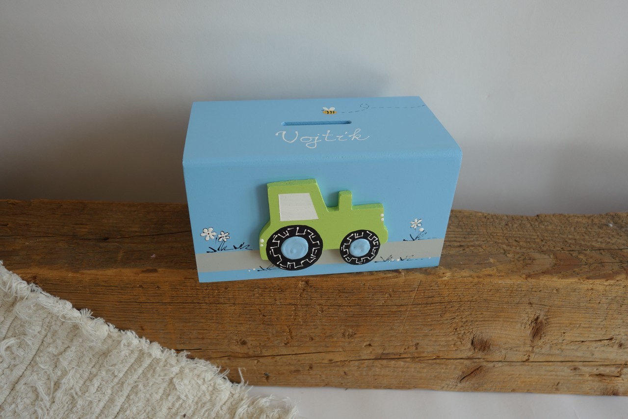 Dřevěná pokladnička s traktorem