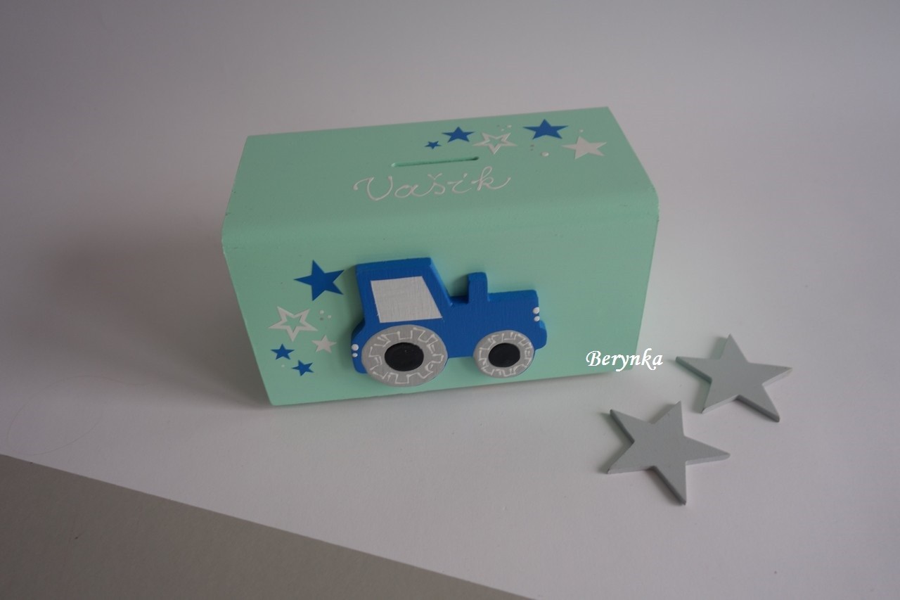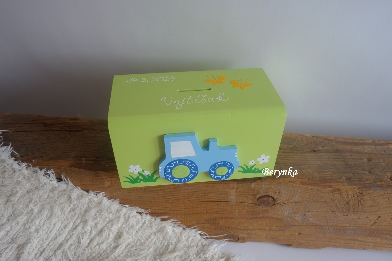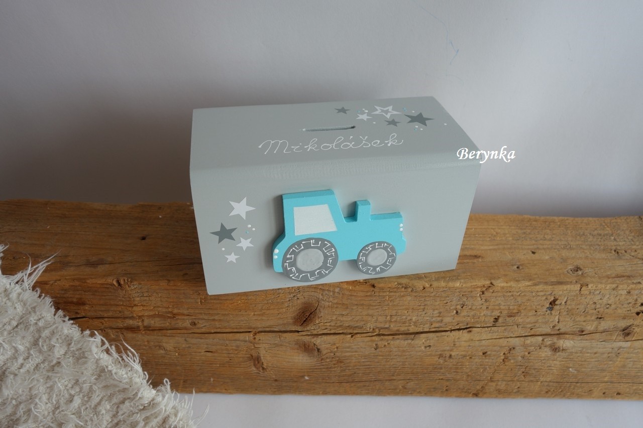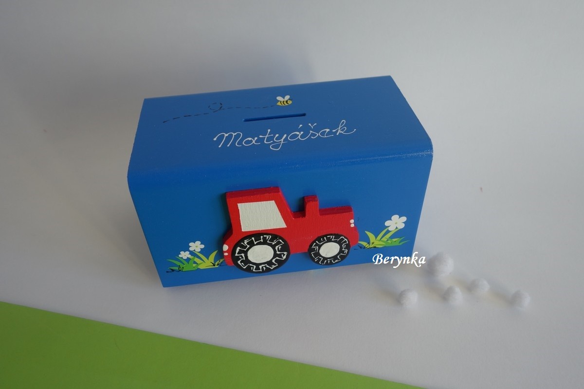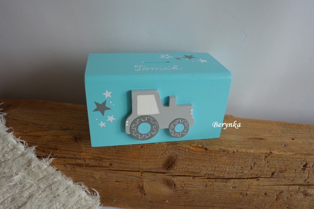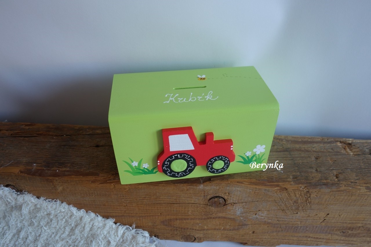 Dřevěná pokladnička s traktorem