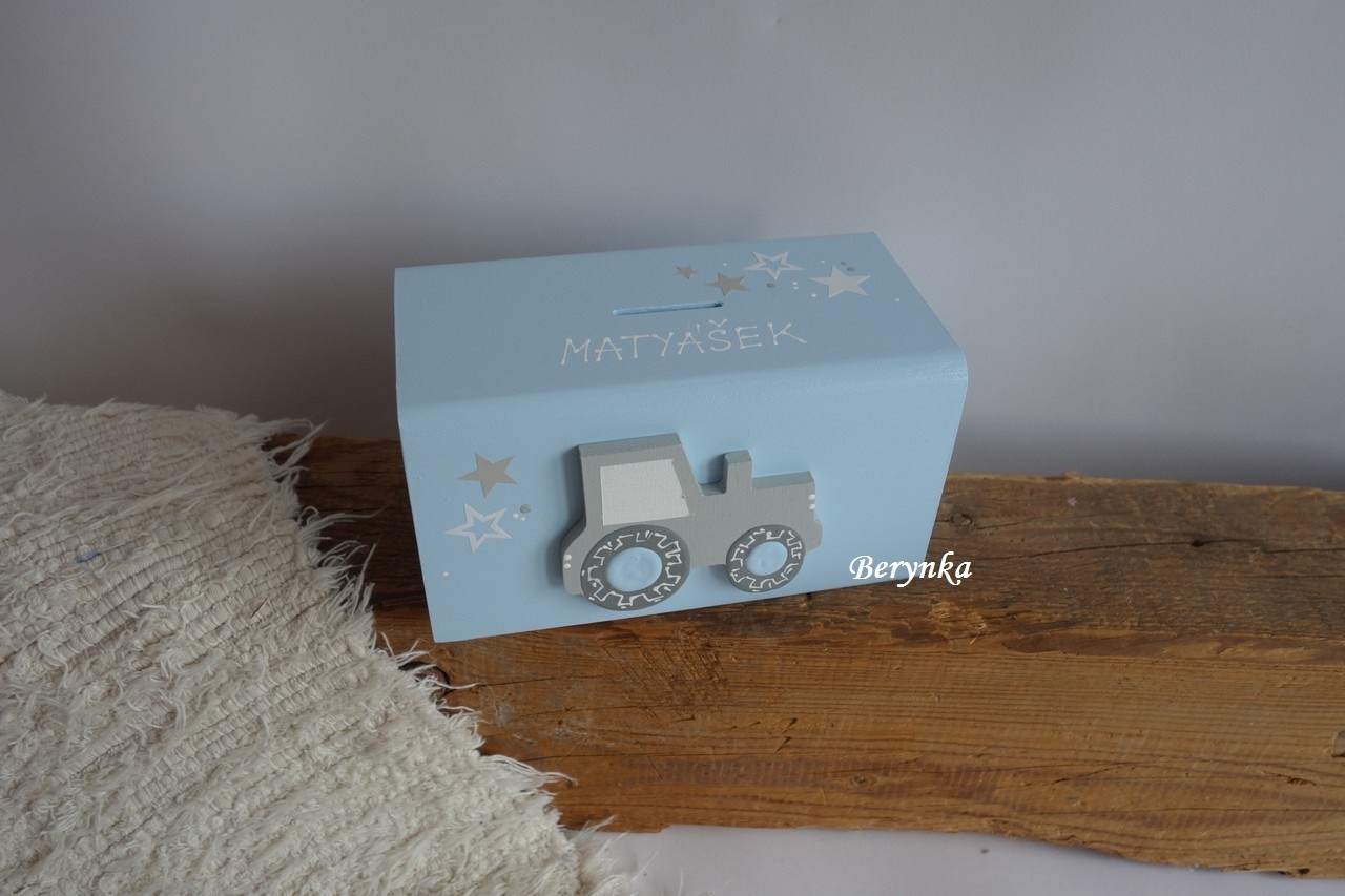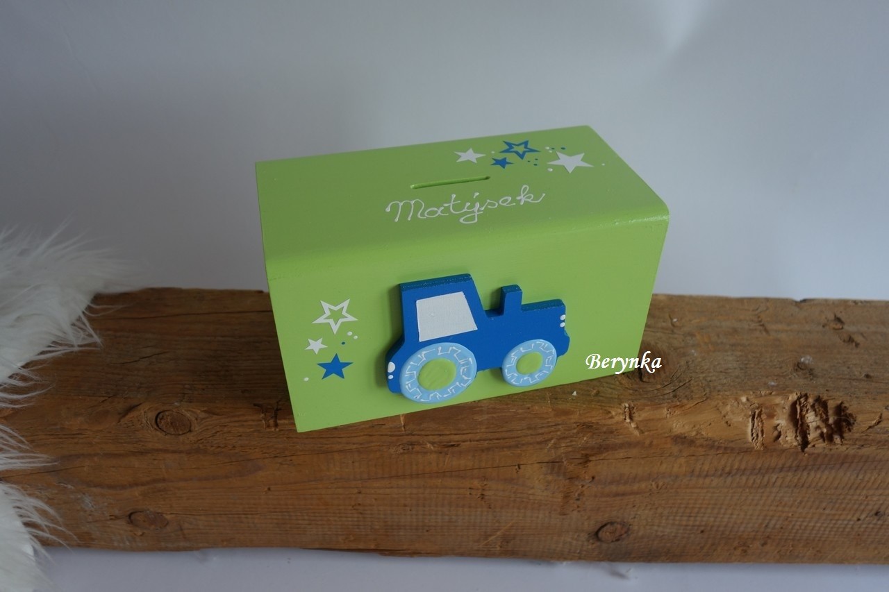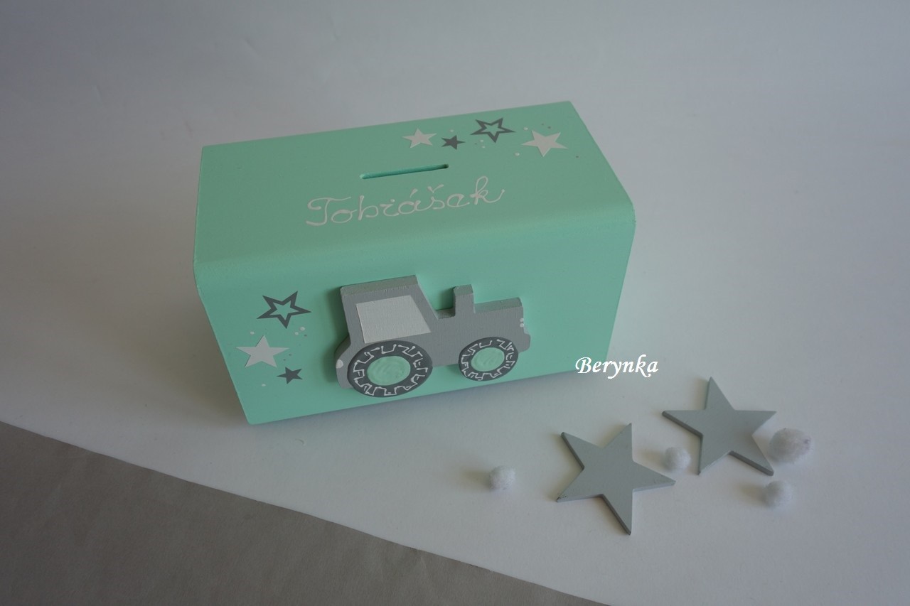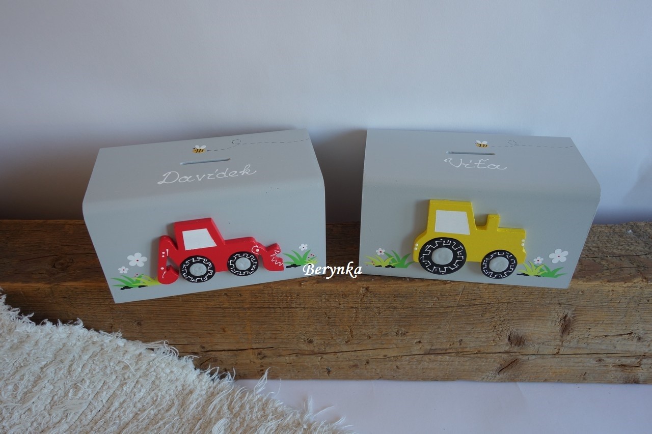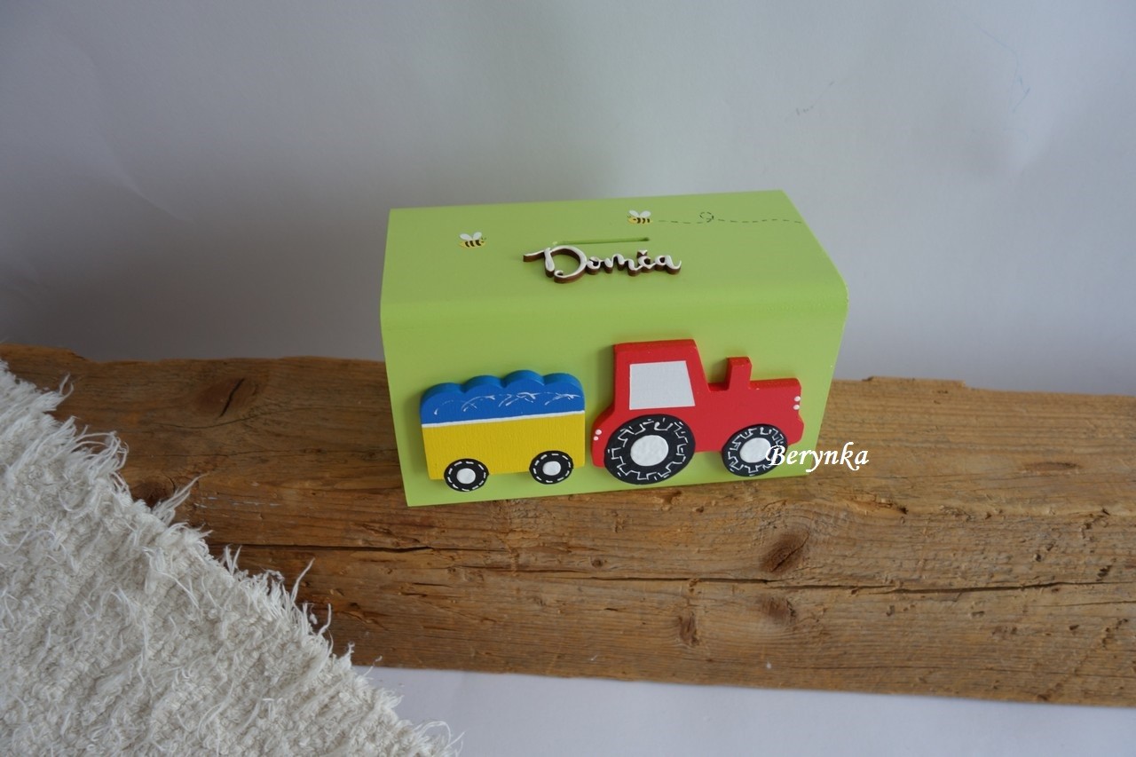 Dřevěná pokladnička s traktorem