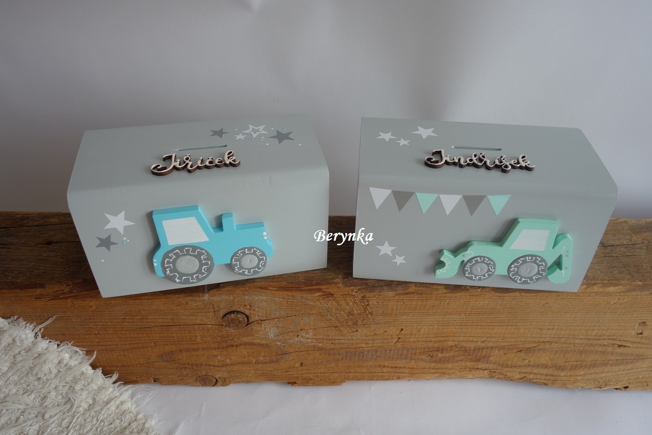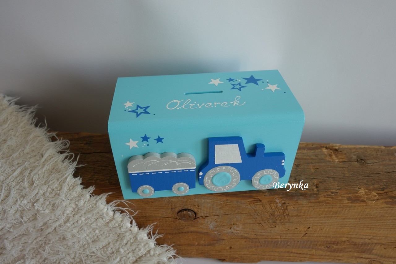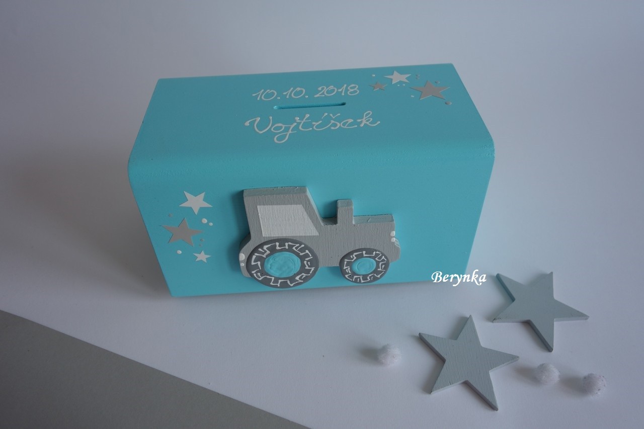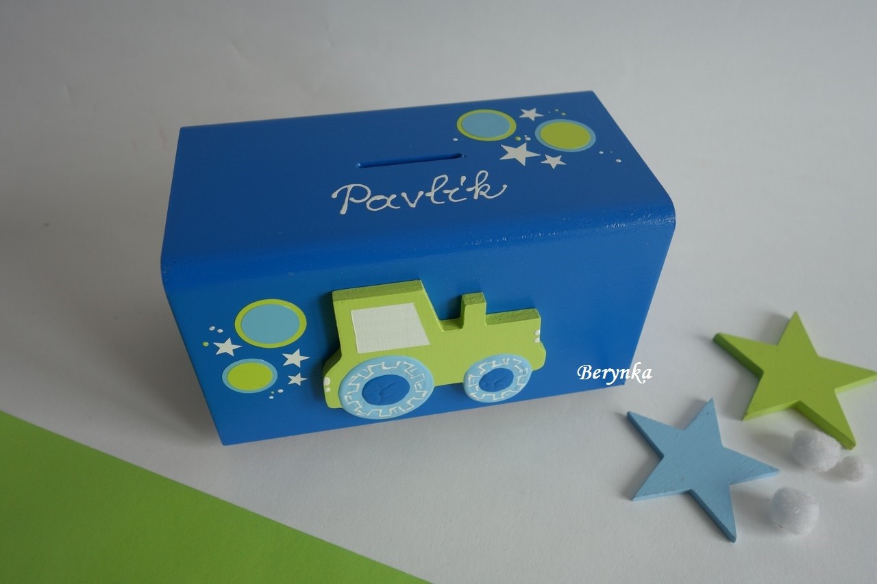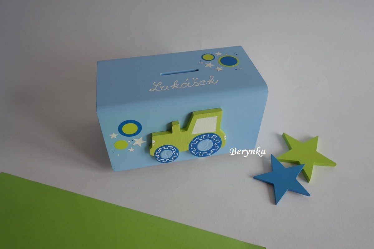 Dřevěná pokladnička s traktorem