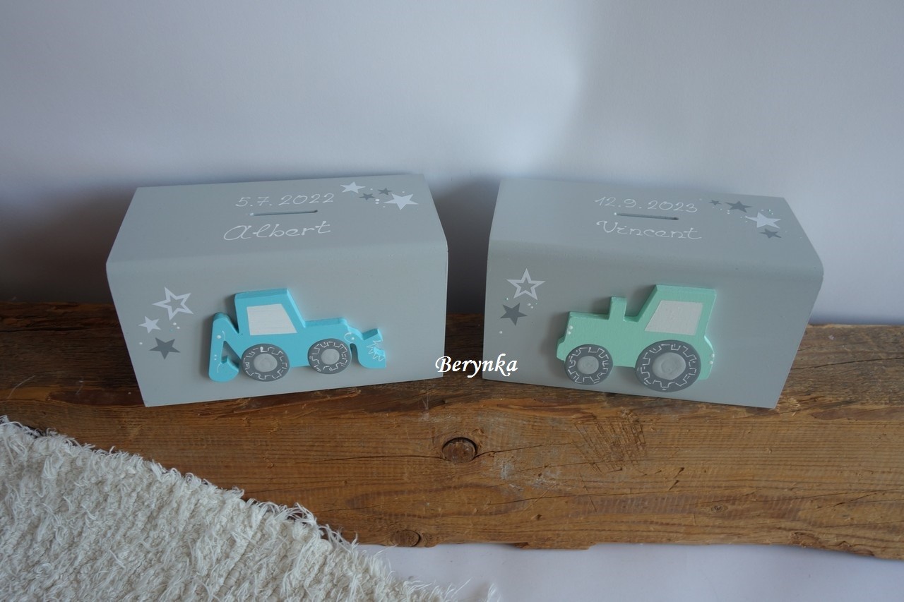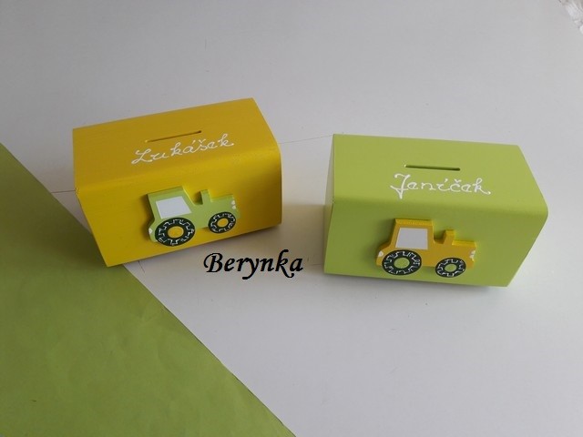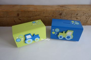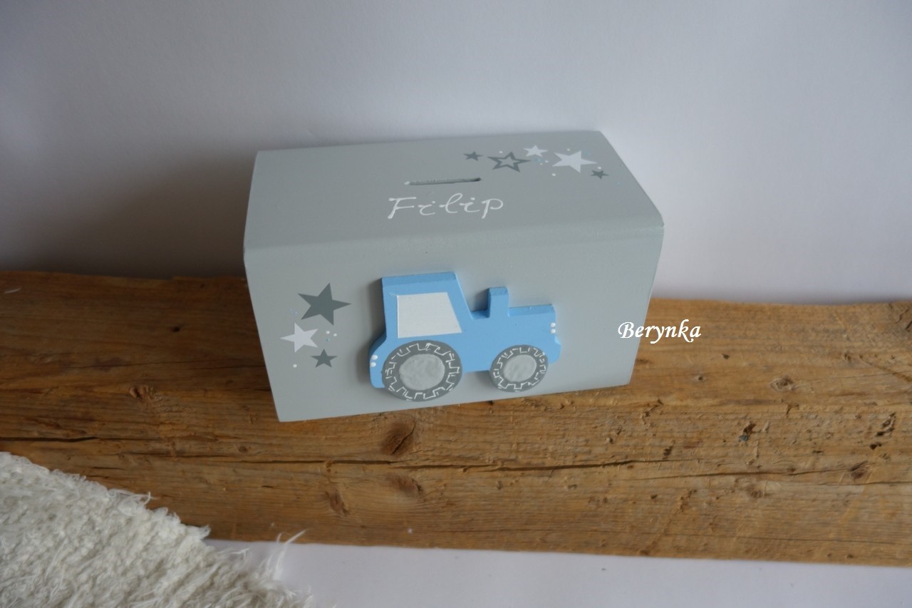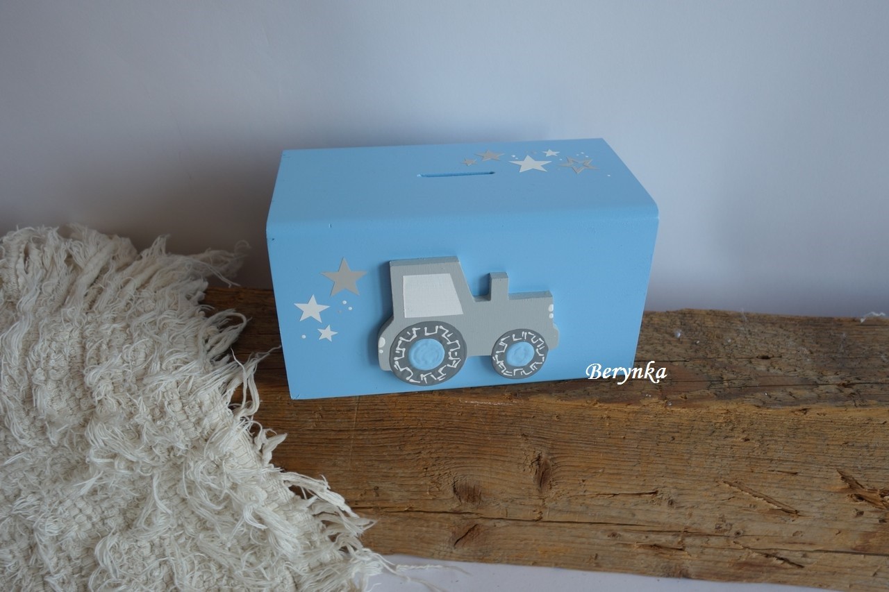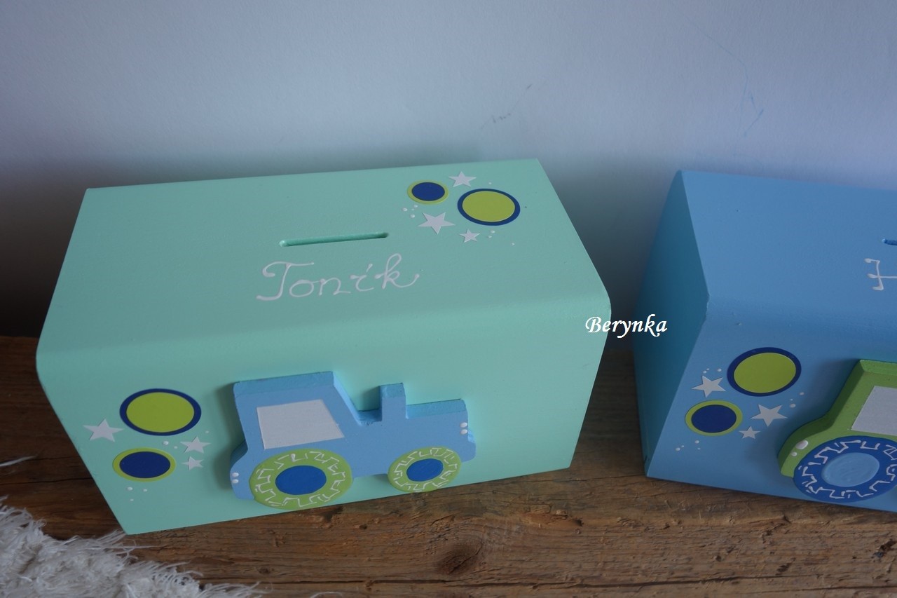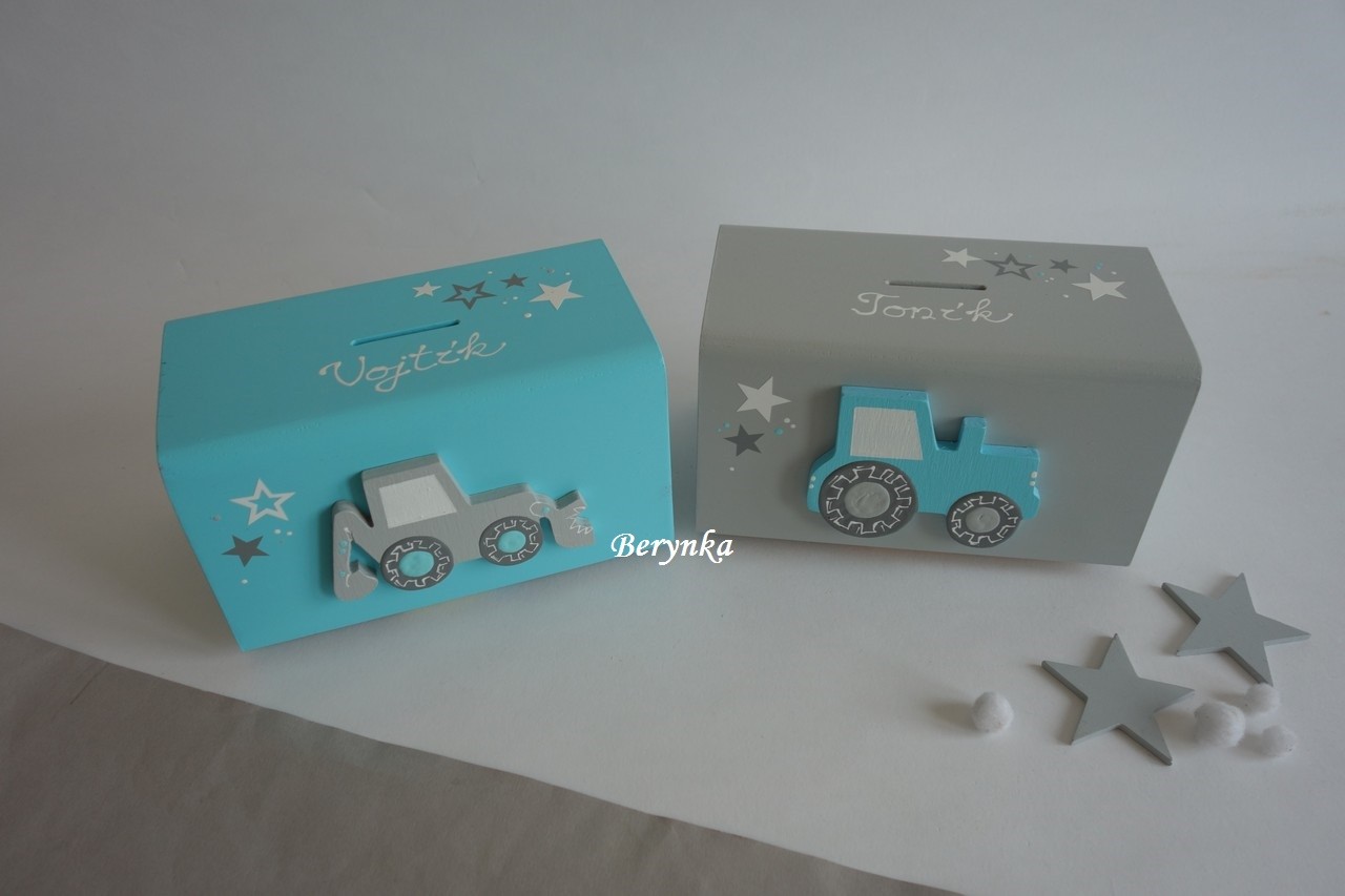 Dřevěná pokladnička s traktorem