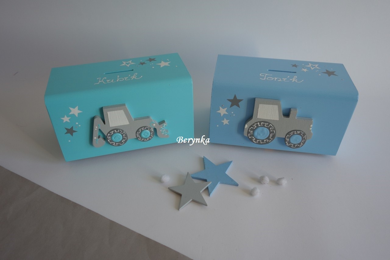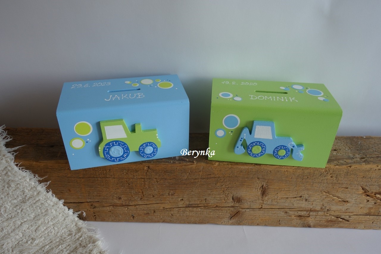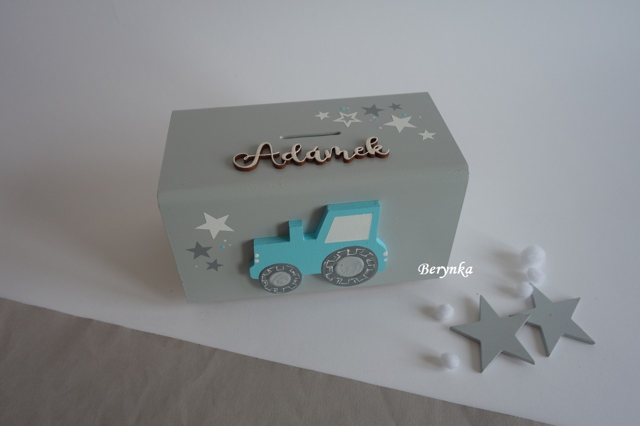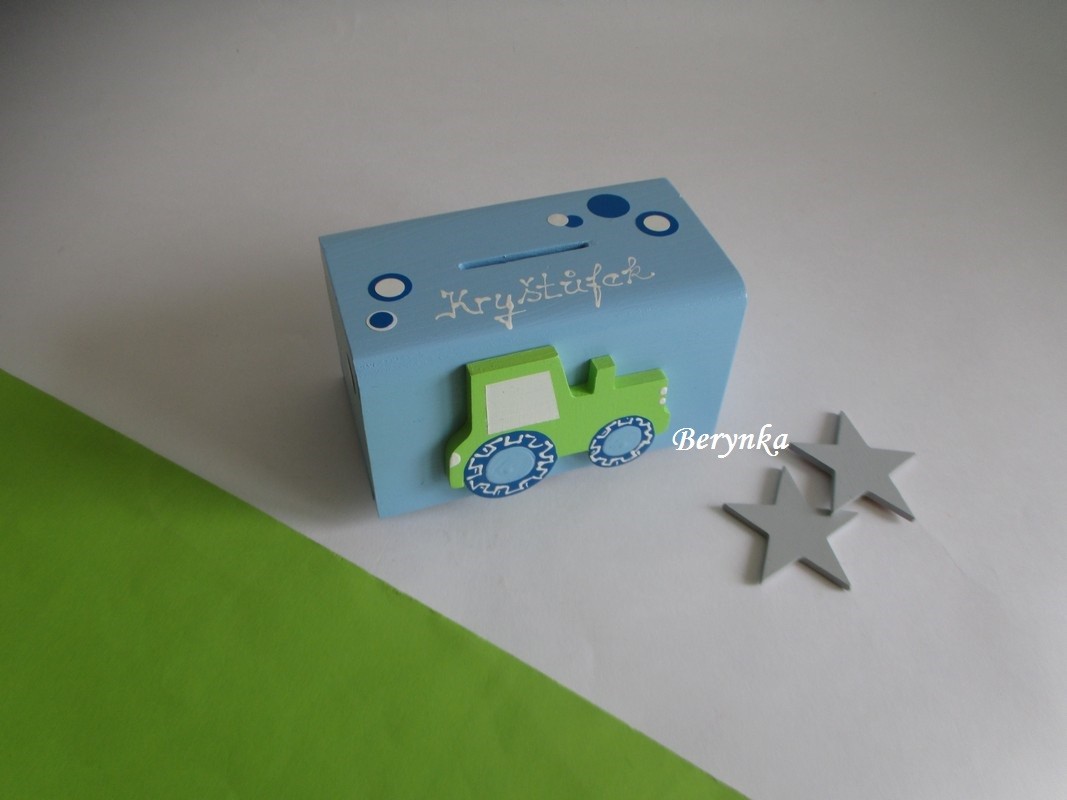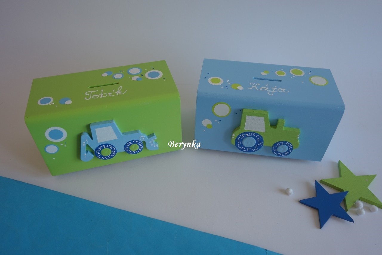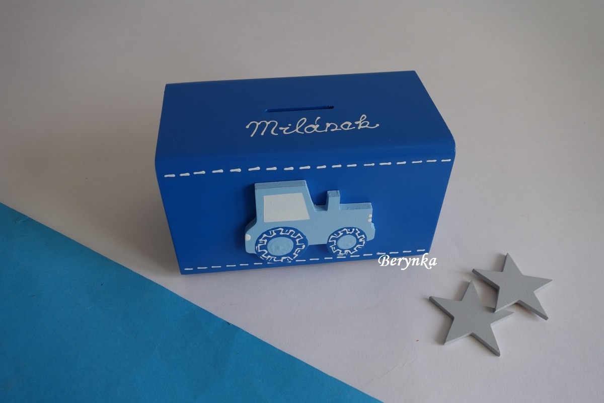 Dřevěná pokladnička s traktorem