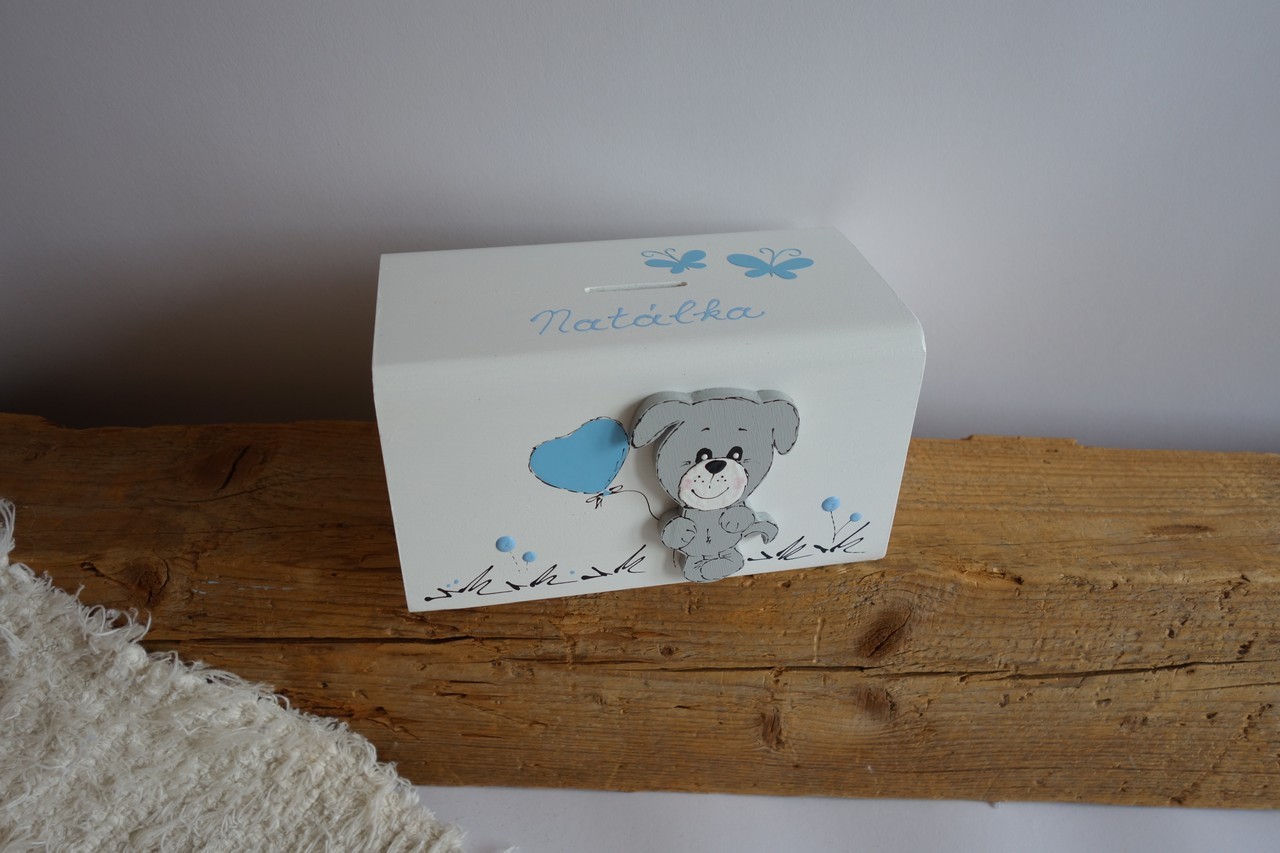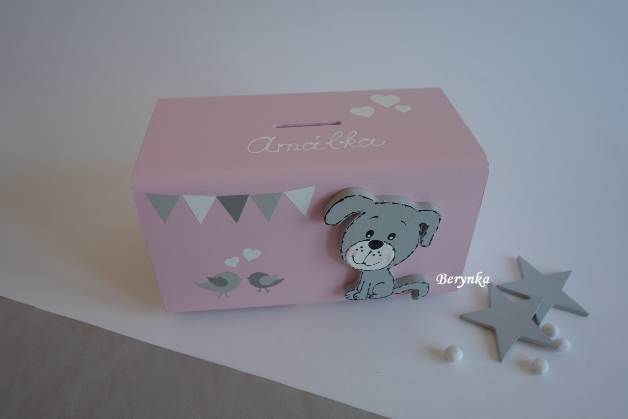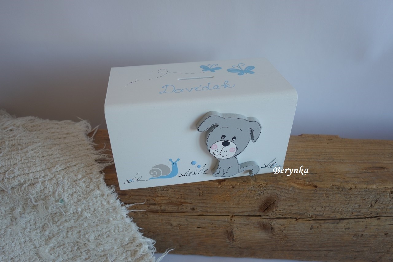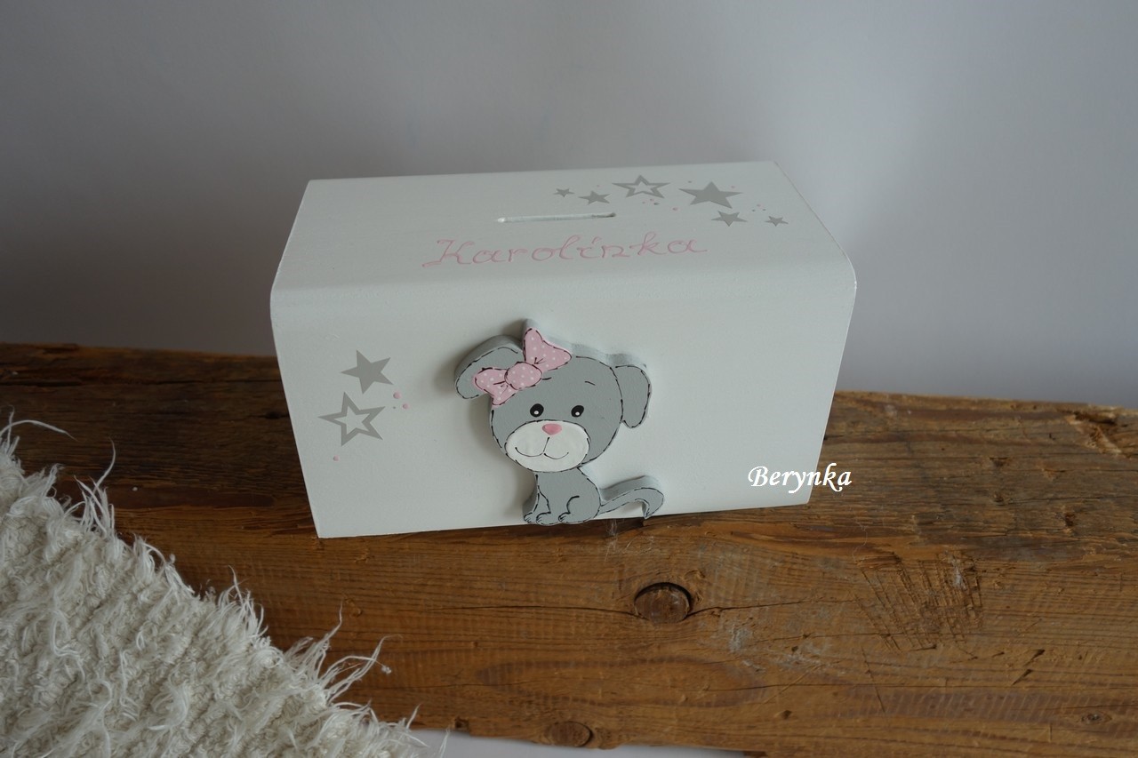 Dřevěná pokladnička se štěňátkem