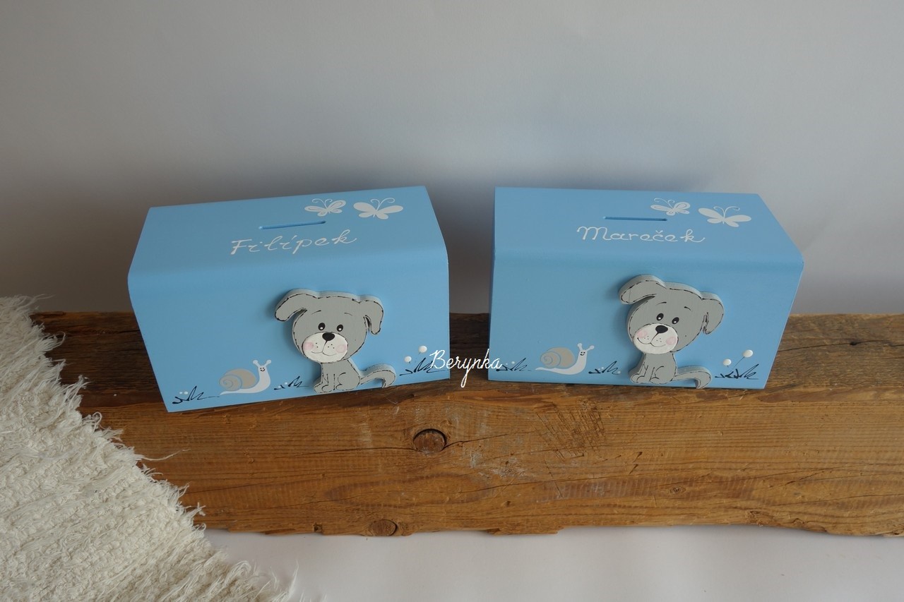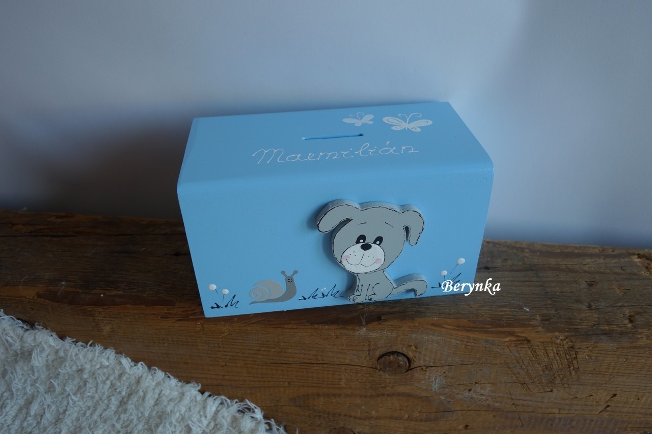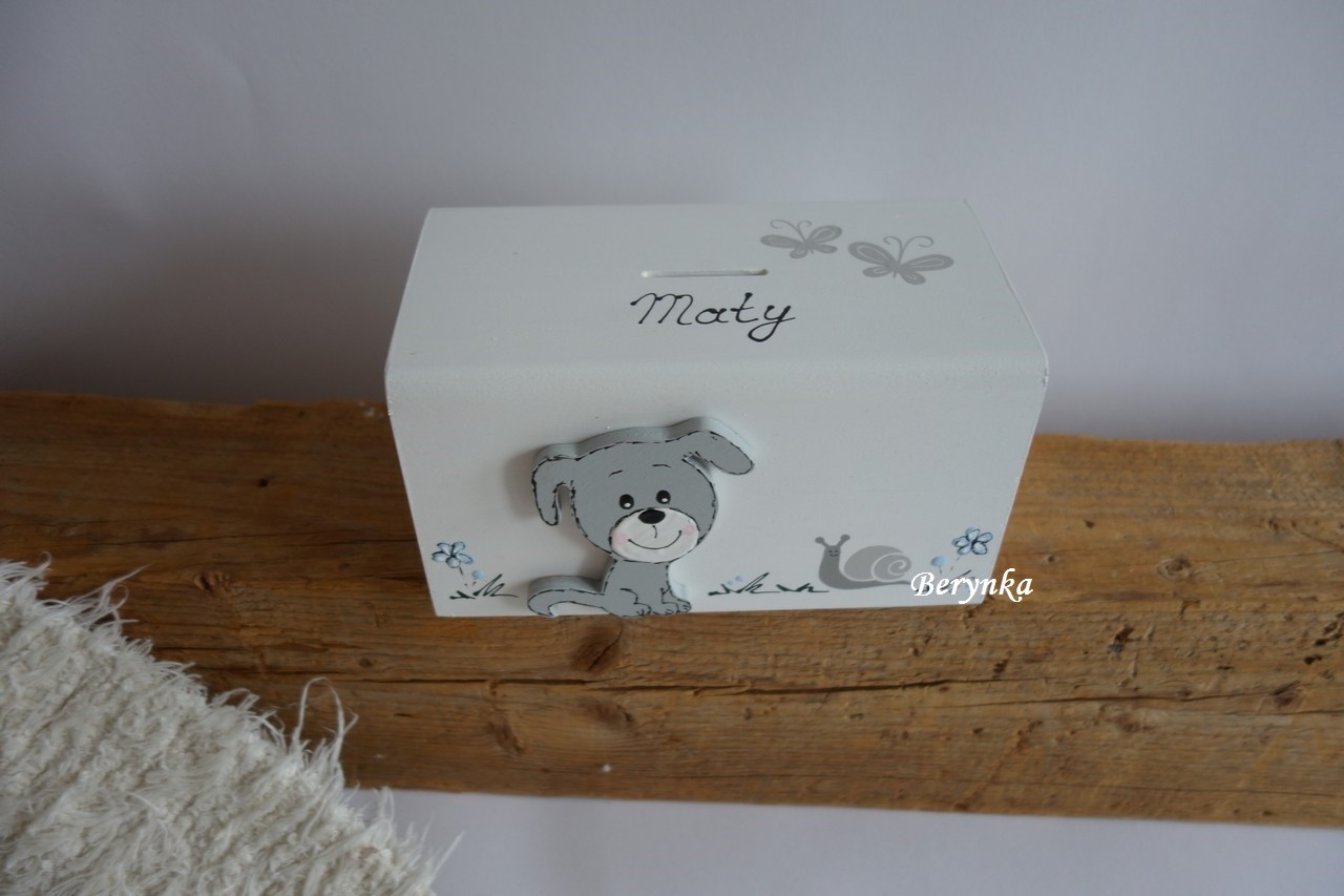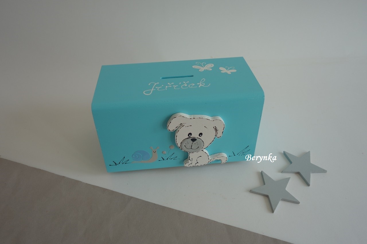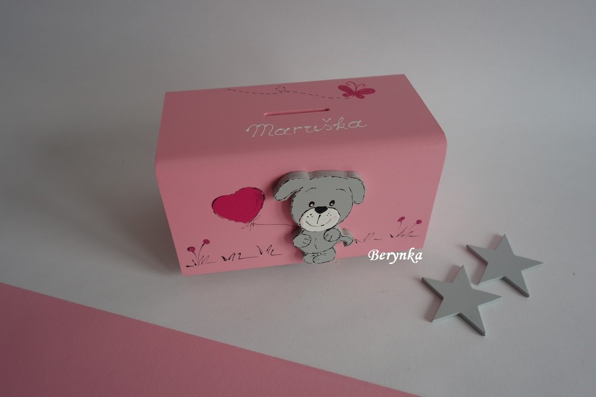 Dřevěná pokladnička se štěňátkem