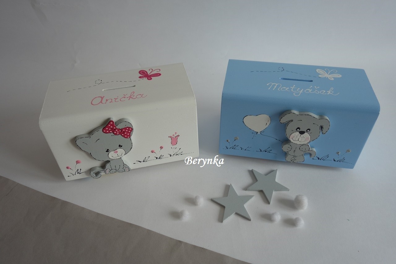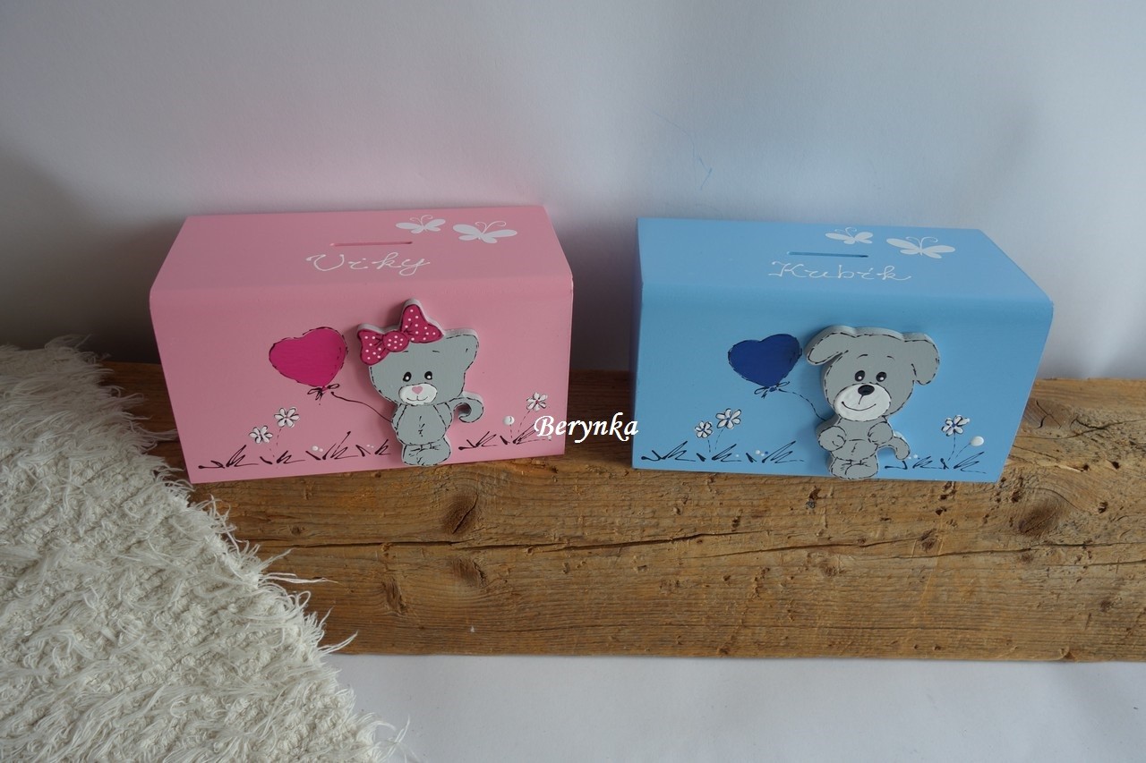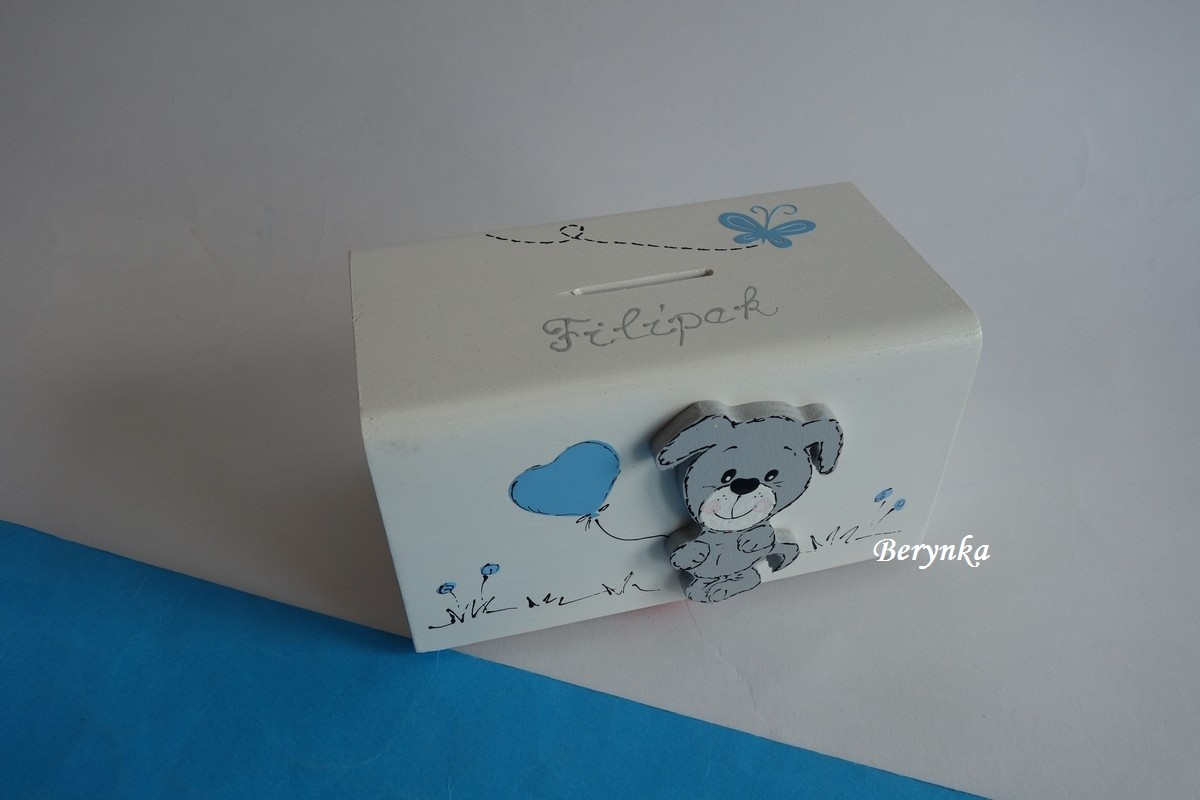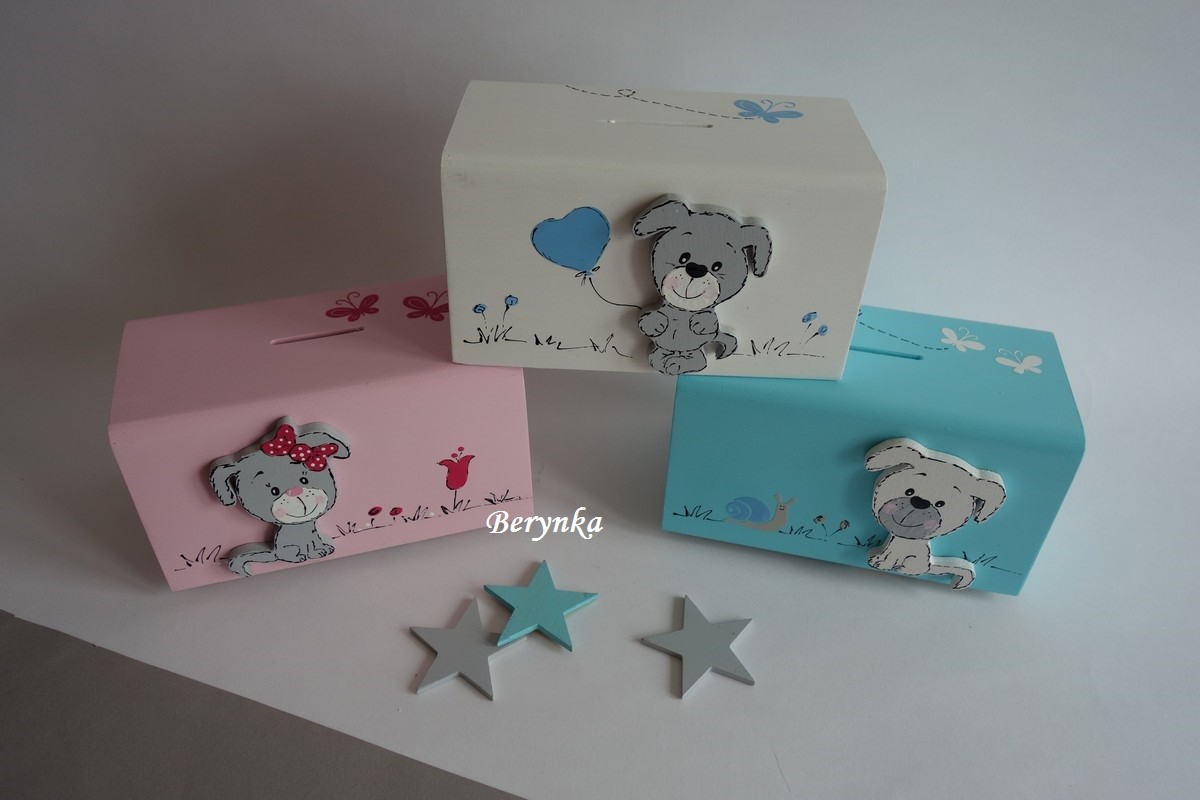Dřevěná pokladnička se štěňátkem