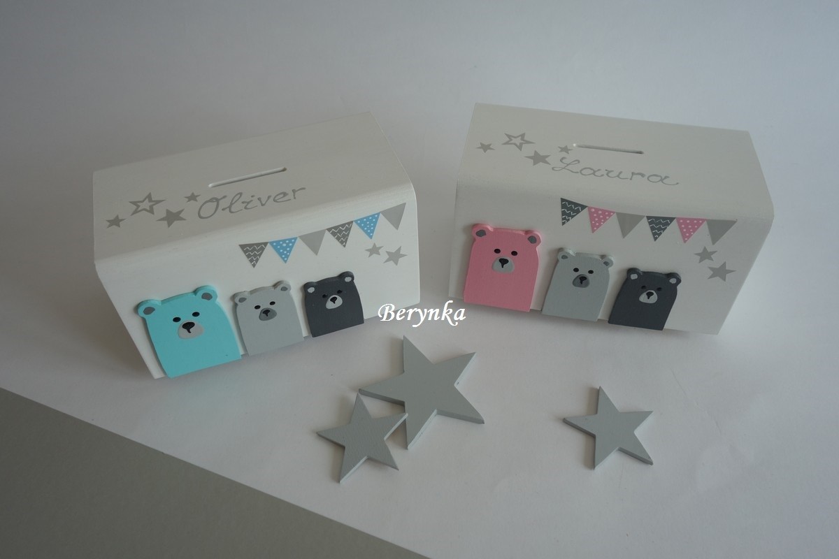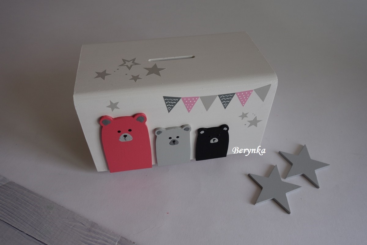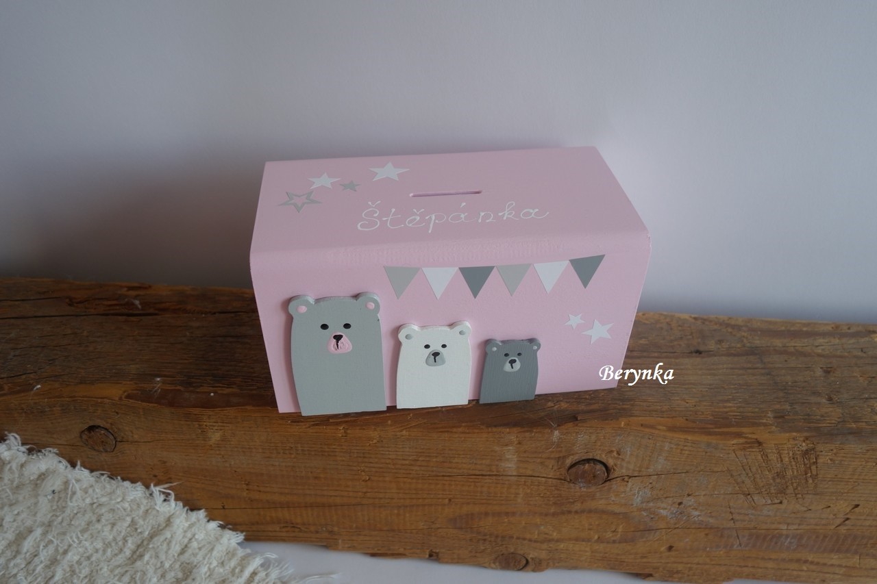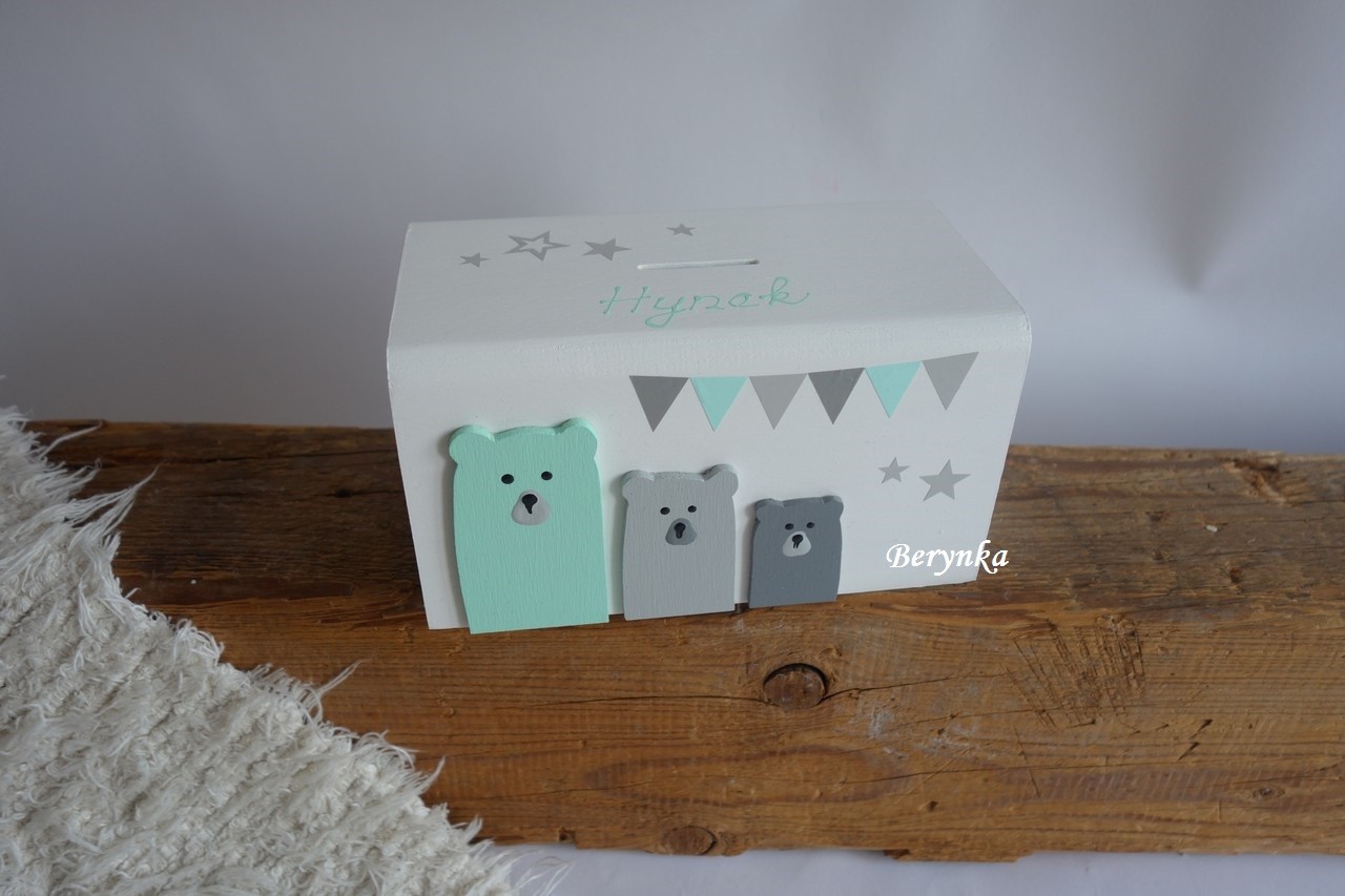 Dřevěná pokladnička v nordic stylu - s medvídky